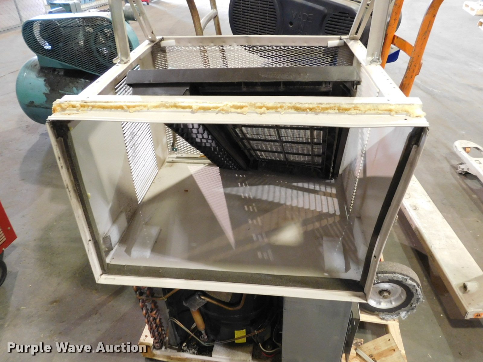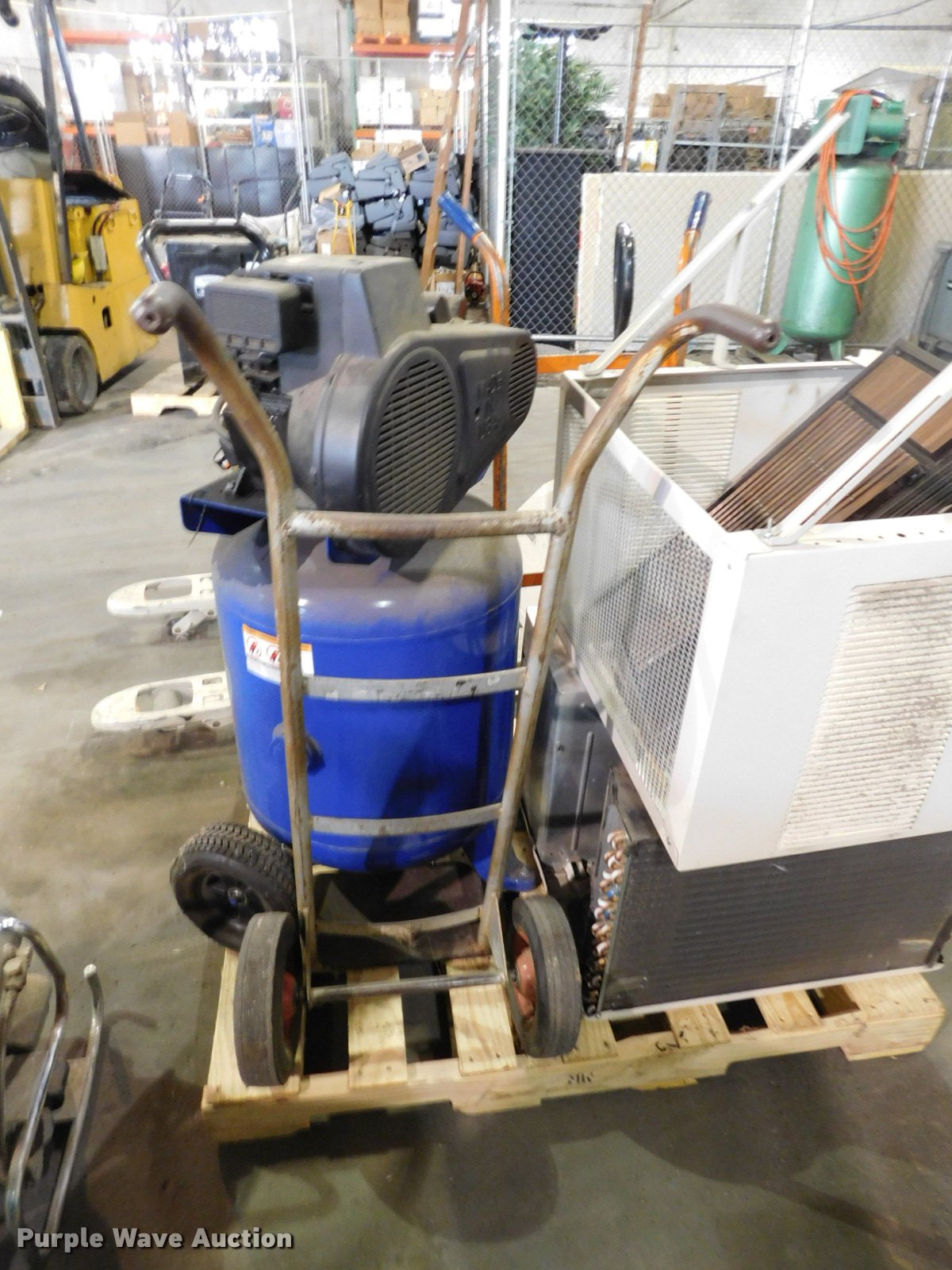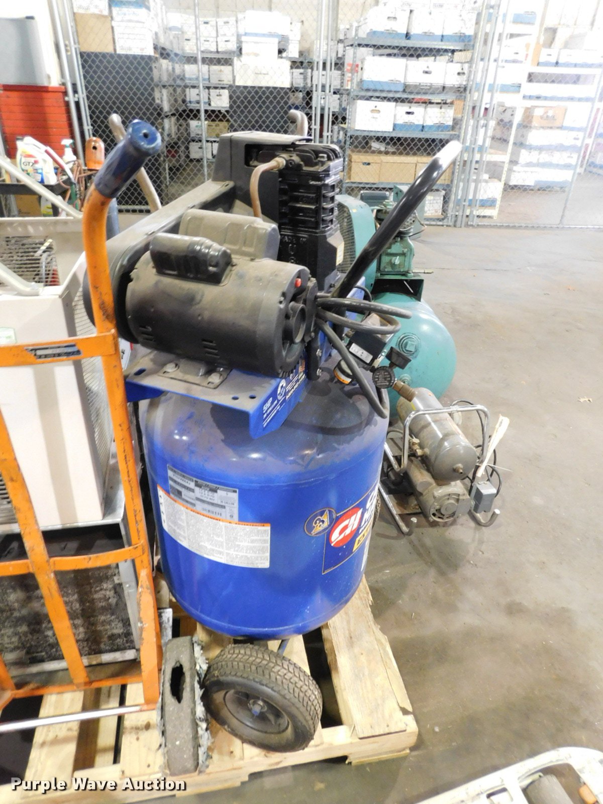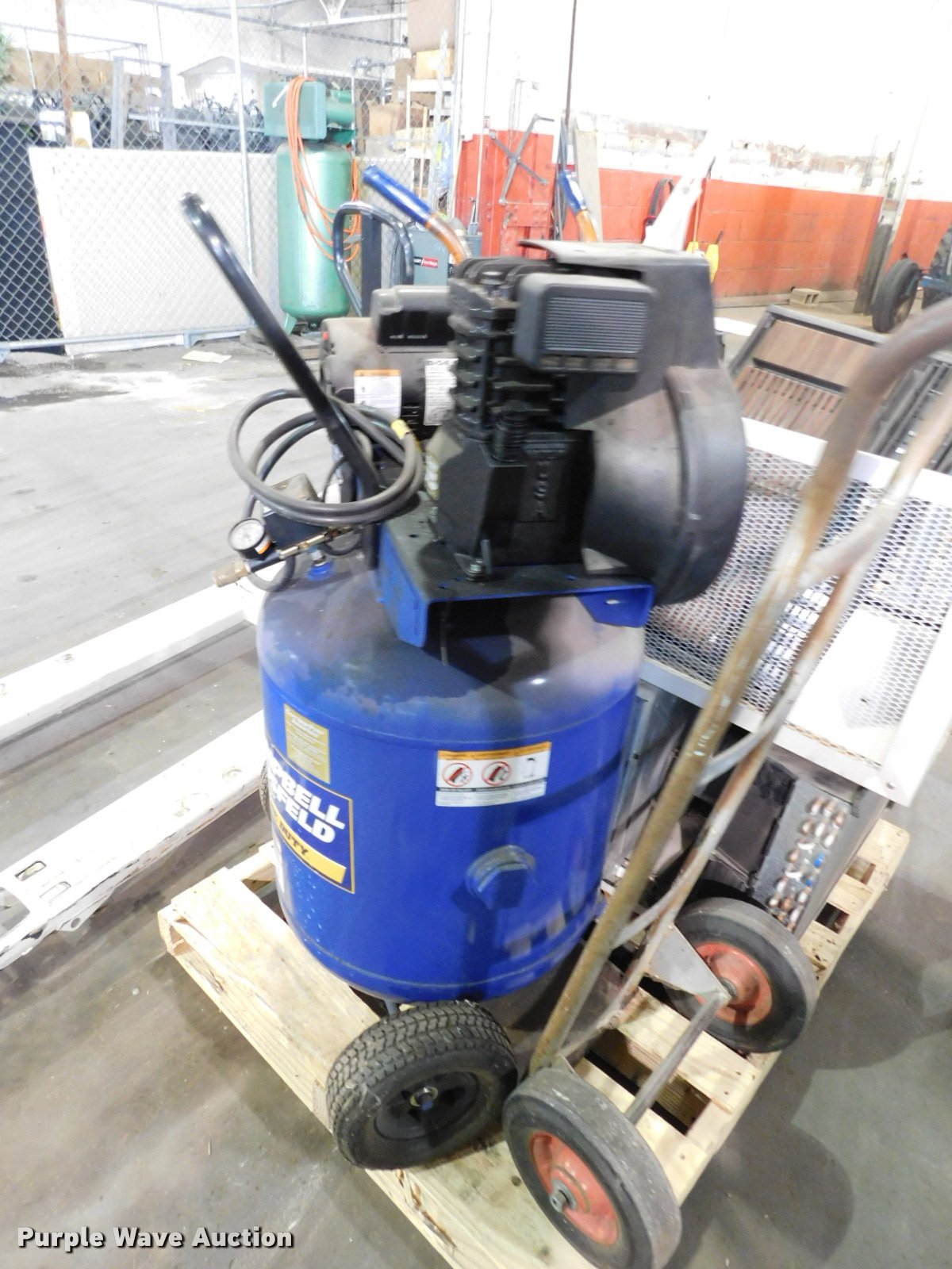 Purple Wave is selling a used Air Compressor in Oklahoma. This item is a Air compressors and tools with the following: Campbell Haufeld air compressor, Doerr electric motor, 3 gallon capacity, 5 HP, 125 psi, Unknown operating condition, Westinghouse AC unit, 24,000 BTU, Unknown operating condition, (2) dollies, Dayton Speedaire air compressor, Doerr single phase electric motor, 3/4 HP, DeVilbiss LTD air compressor, Model RUBK-5034, Marathon electric motor, 1 HP, 40 gallon capacity, 80 psi, Serial 4165, Crown PTH pallet jack, 6" x 48" forks, Bent
