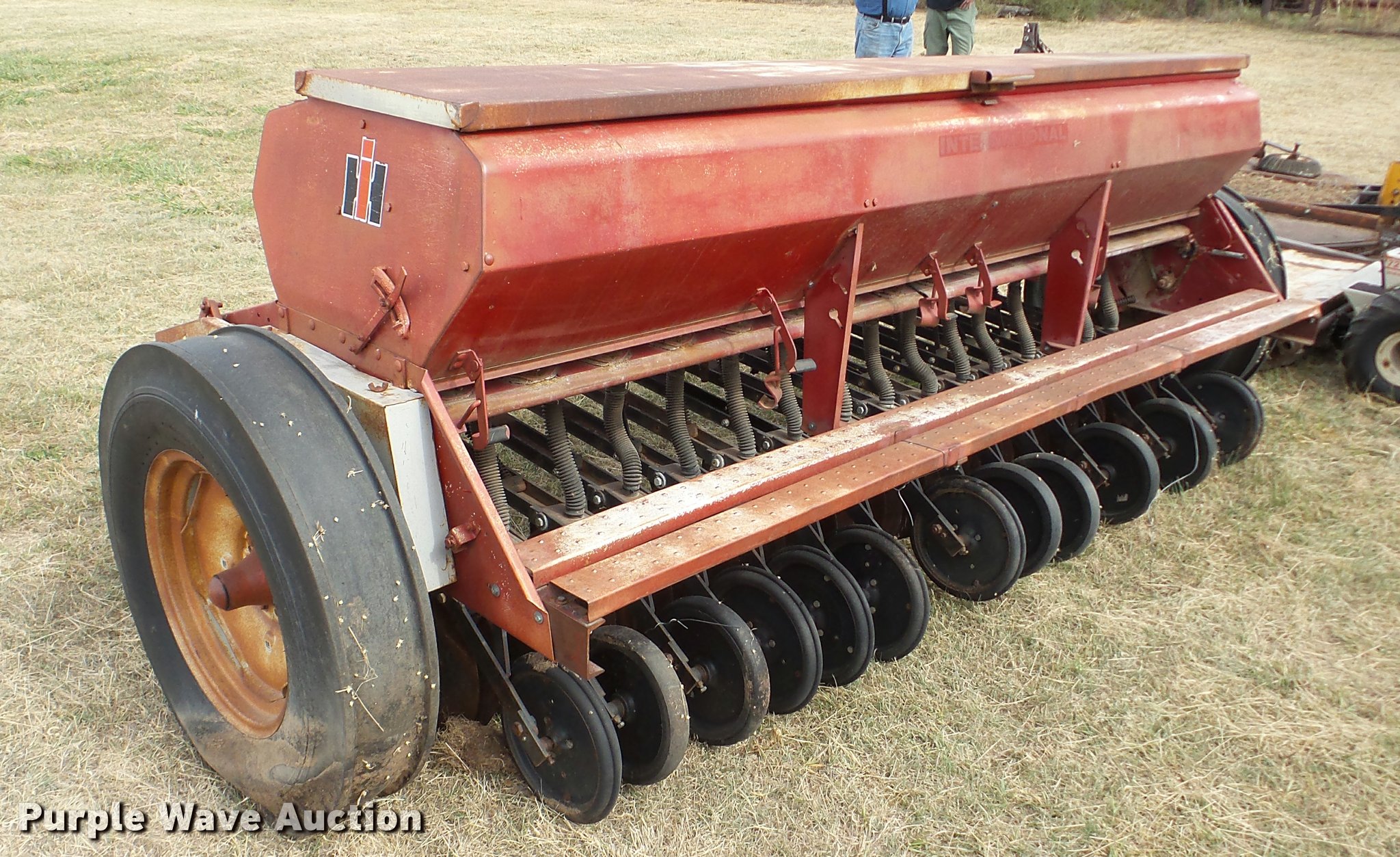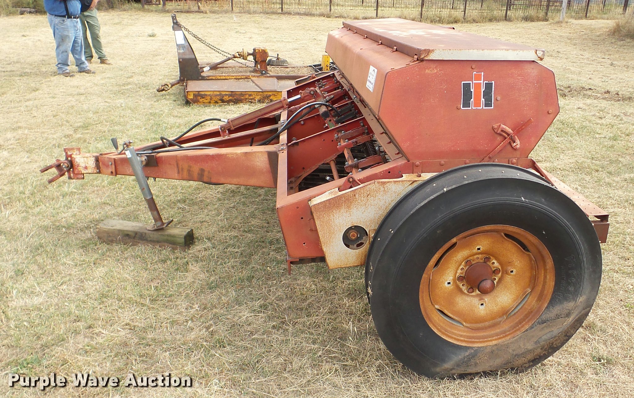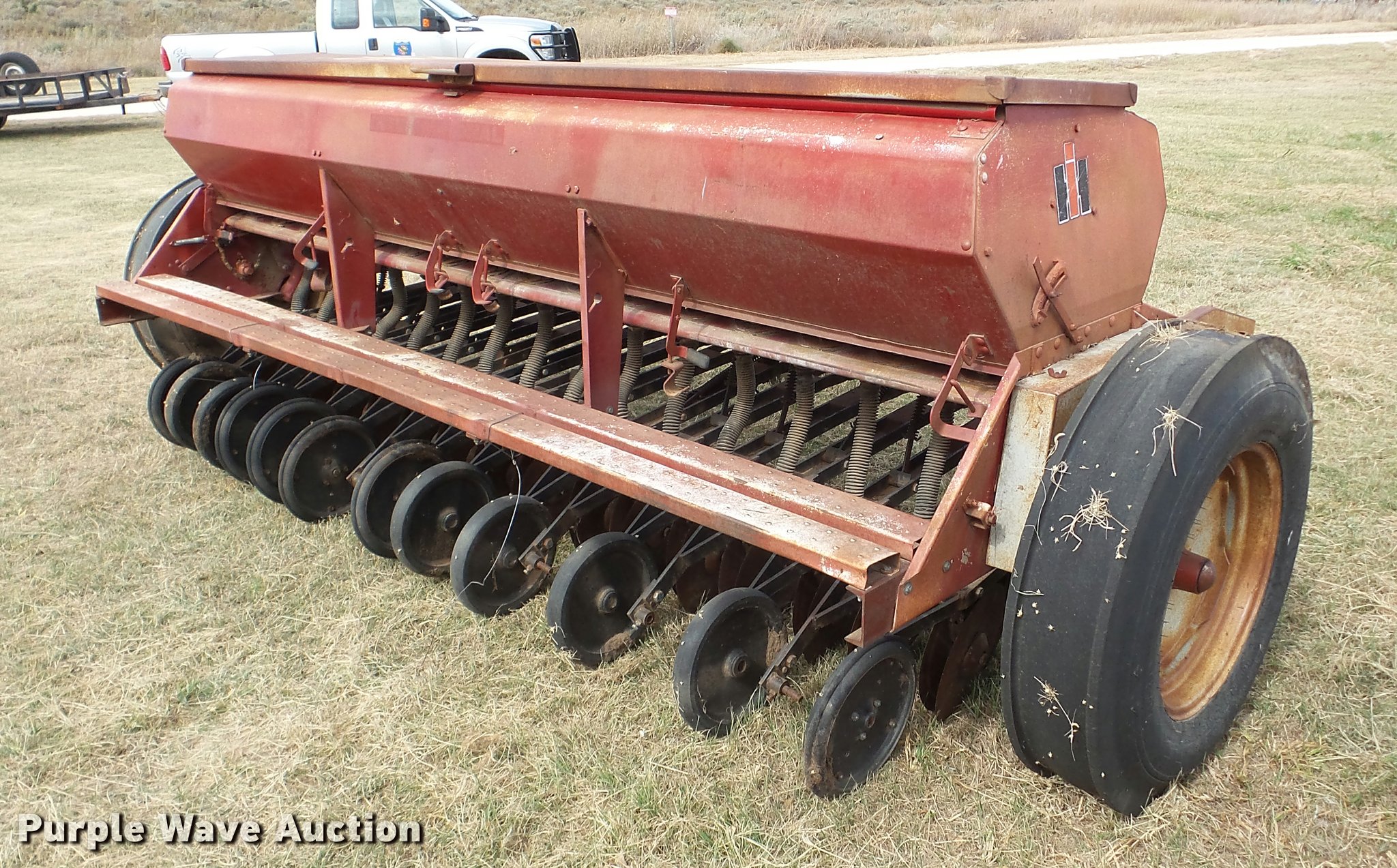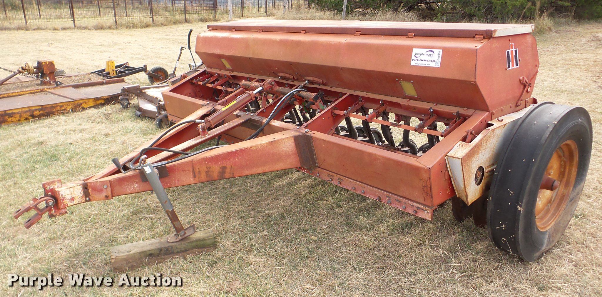 Purple Wave is selling a used Grain Drill or Seeder in Oklahoma. This item is a International 510 grain drill with the following: 13'W overall, 10'W, 16 row units, 8" row spacing, Hydraulic lift, Pin hitch, 7.50-20 tires, Manual, Weld repairs, Some press wheels missing, Serial 001111