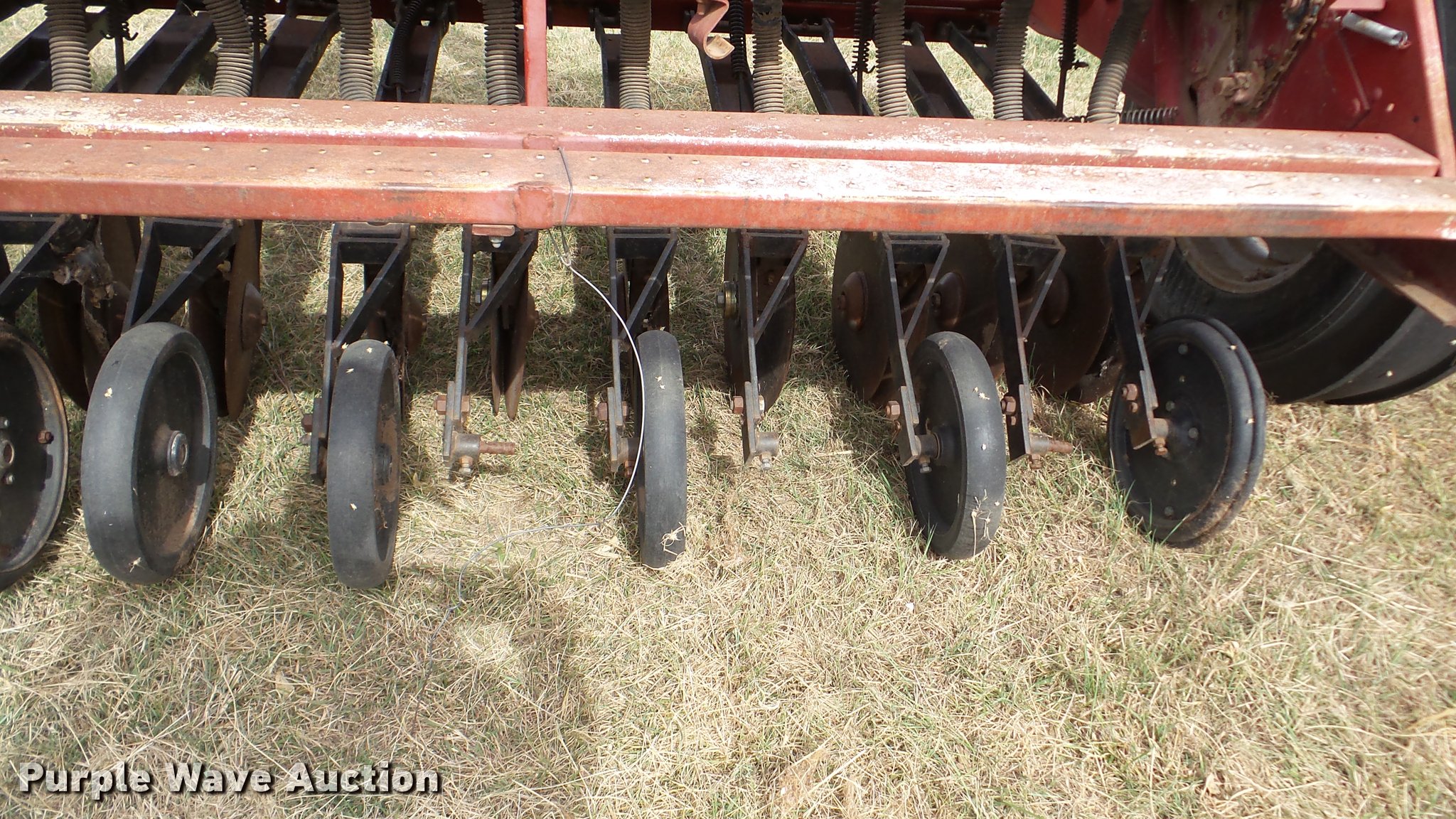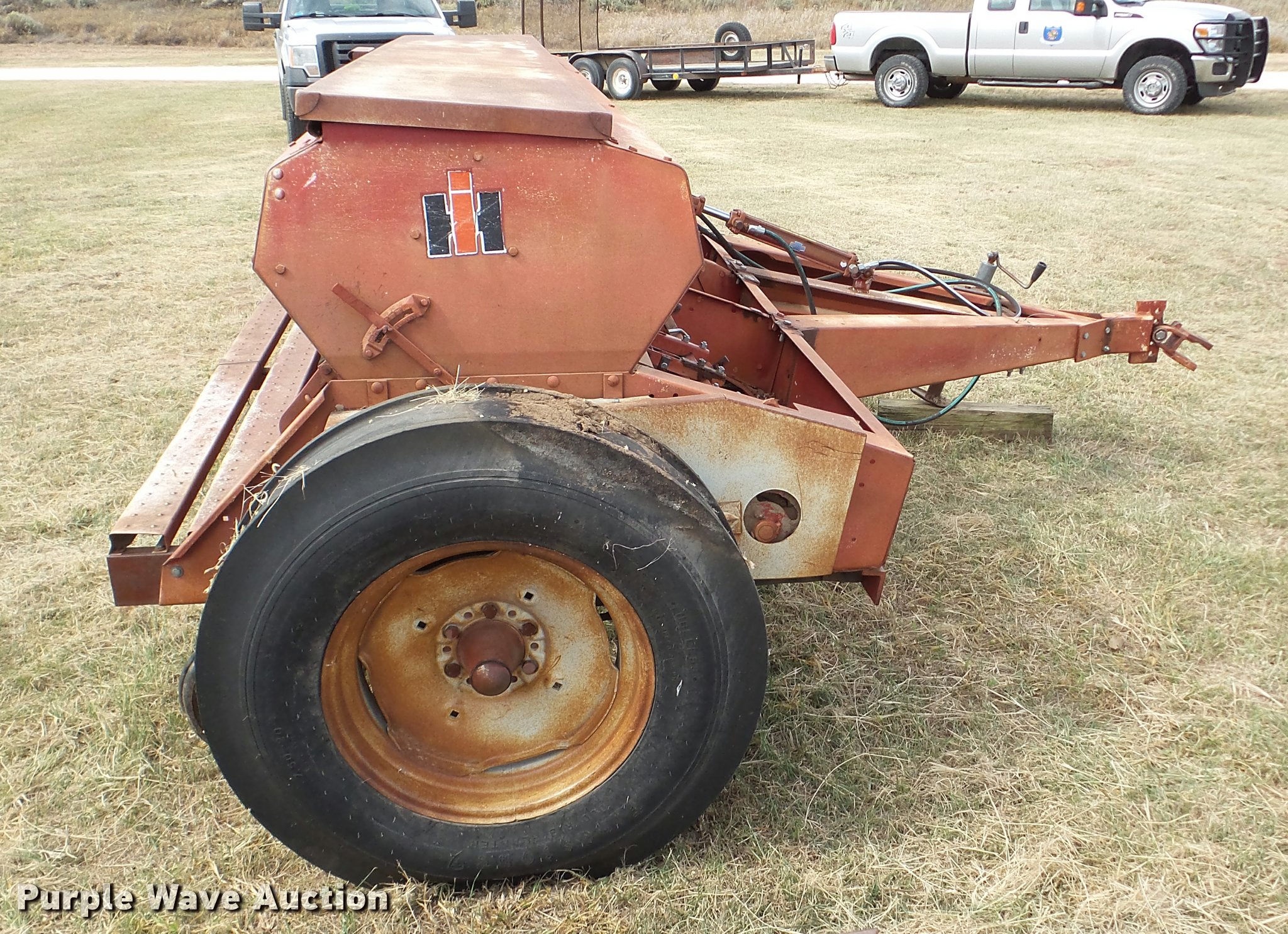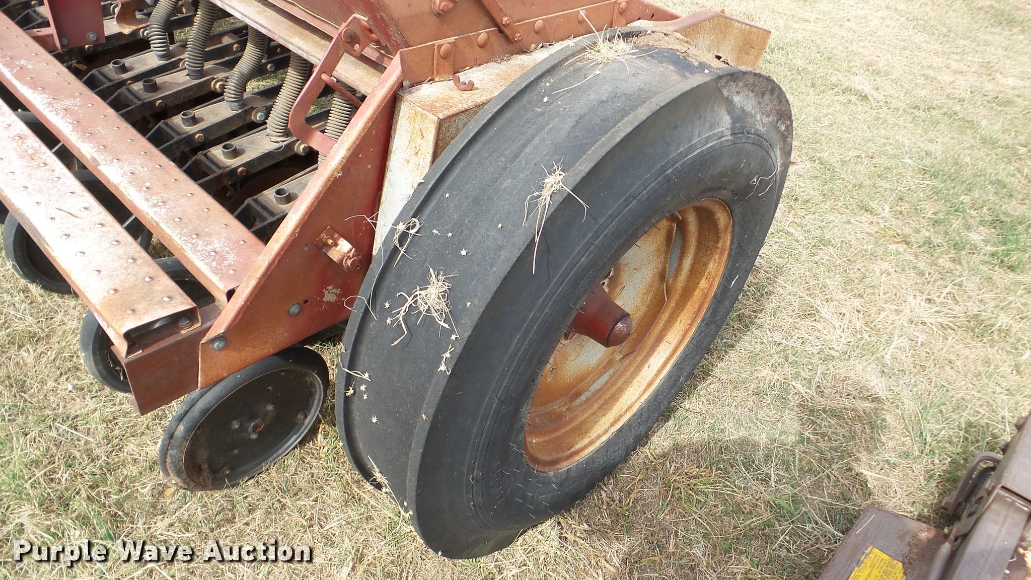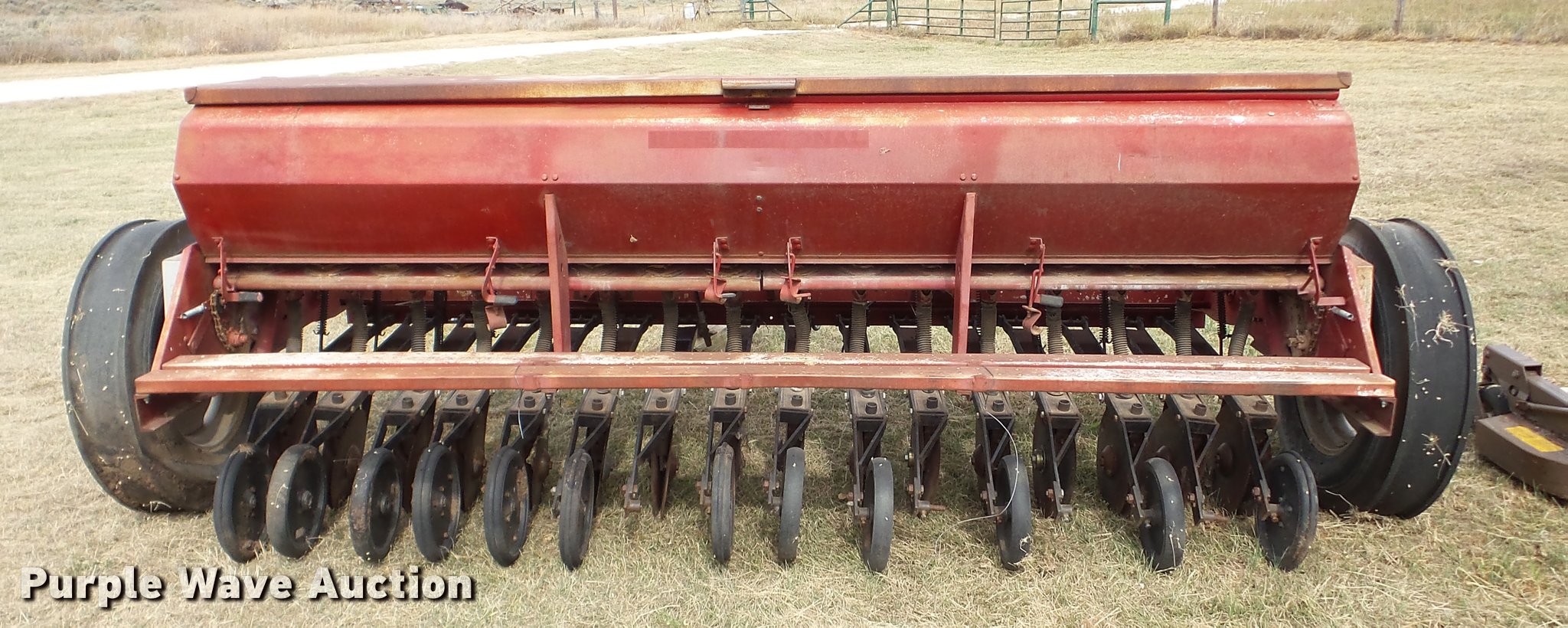 Purple Wave is selling a used Grain Drill or Seeder in Oklahoma. This item is a International 510 grain drill with the following: 13'W overall, 10'W, 16 row units, 8" row spacing, Hydraulic lift, Pin hitch, 7.50-20 tires, Manual, Weld repairs, Some press wheels missing, Serial 001111