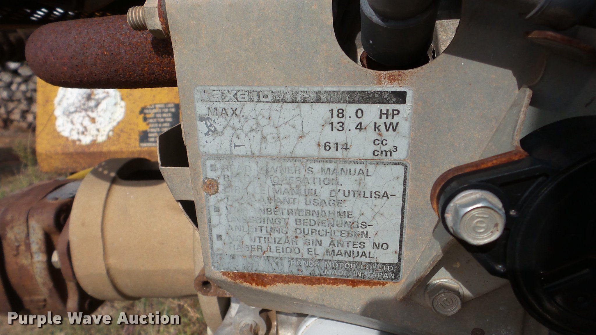 Big John 45TG tree spade. 3' depth, 3' hole, Honda 18 HP gas engine, 12'L x 8'W trailer, Pintle hitch, Extendable tongue, Electric brakes Non-operational, 12x16.5 tires, Weak battery, Serial 046. Transfer of ownership documentation will be a bill of sale. Oklahoma Department of Wildlife Conservation. Woodward, OK 73801