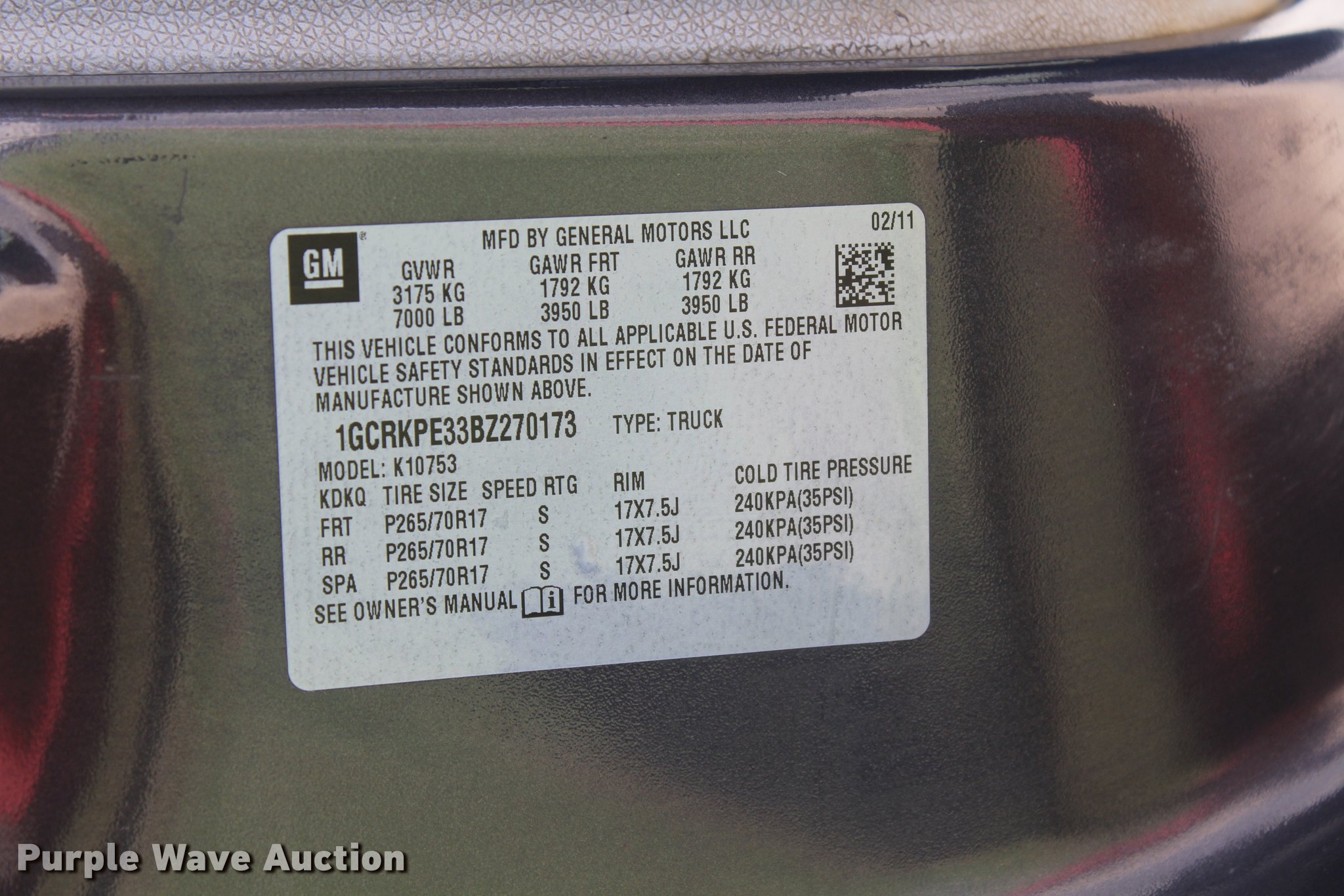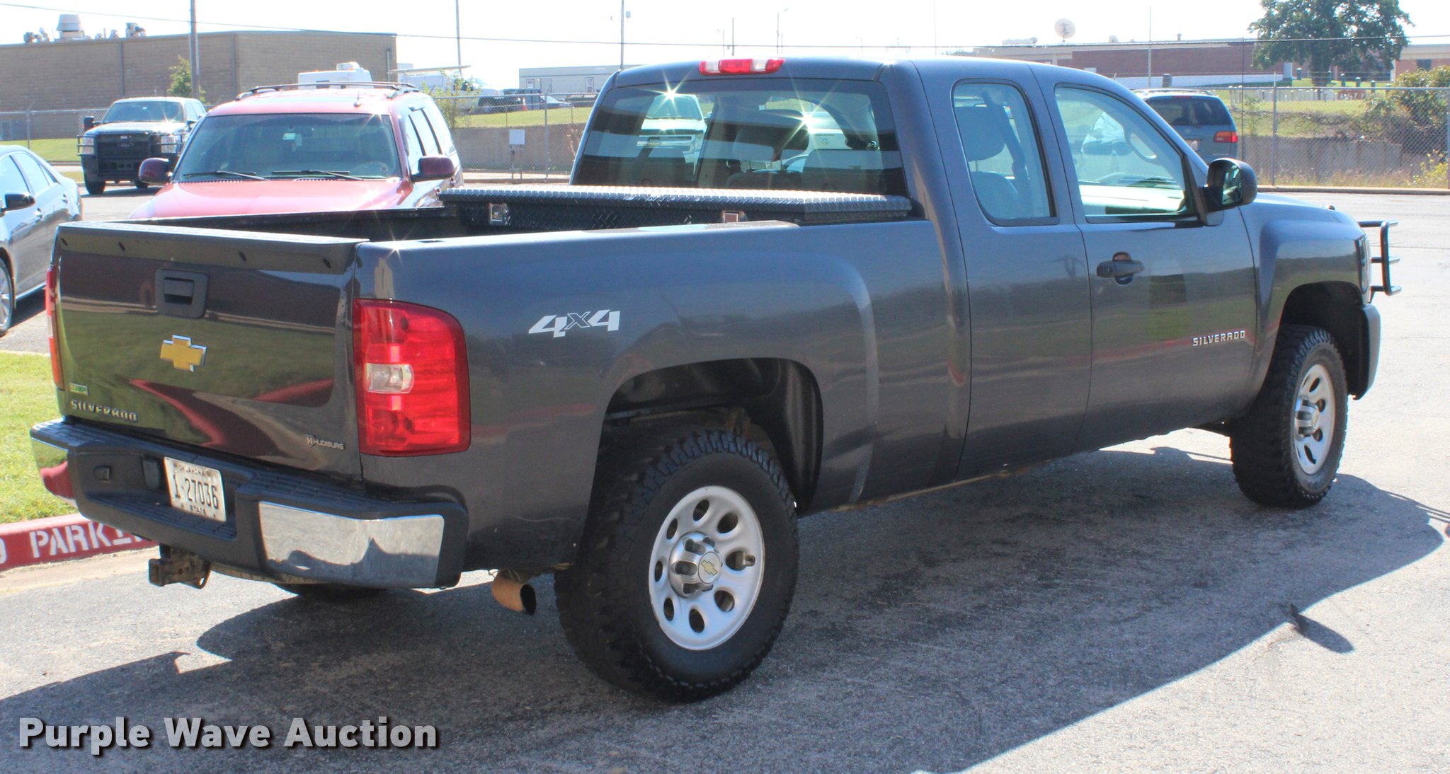 Purple Wave is selling a used 1/2 Ton Pickup or Van in Oklahoma. This item is a 2011 Chevrolet Silverado 1500 Ext. Cab pickup truck with the following: 116,036 miles on odometer, 5.3L V8 OHV 16V FFV gas engine, Automatic transmission, Four wheel drive, AC and heat, Tilt, Cruise, AM/FM, Power windows, locks, and mirrors, Vinyl interior, Spotlight, Cattleman grill guard, Toolbox, Receiver hitch, Trailer wiring, LT265/70R17 tires