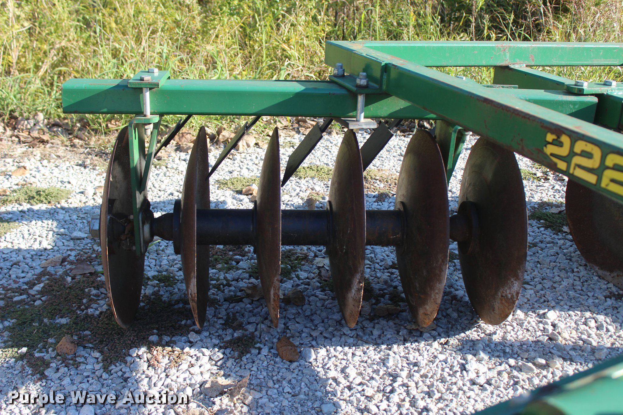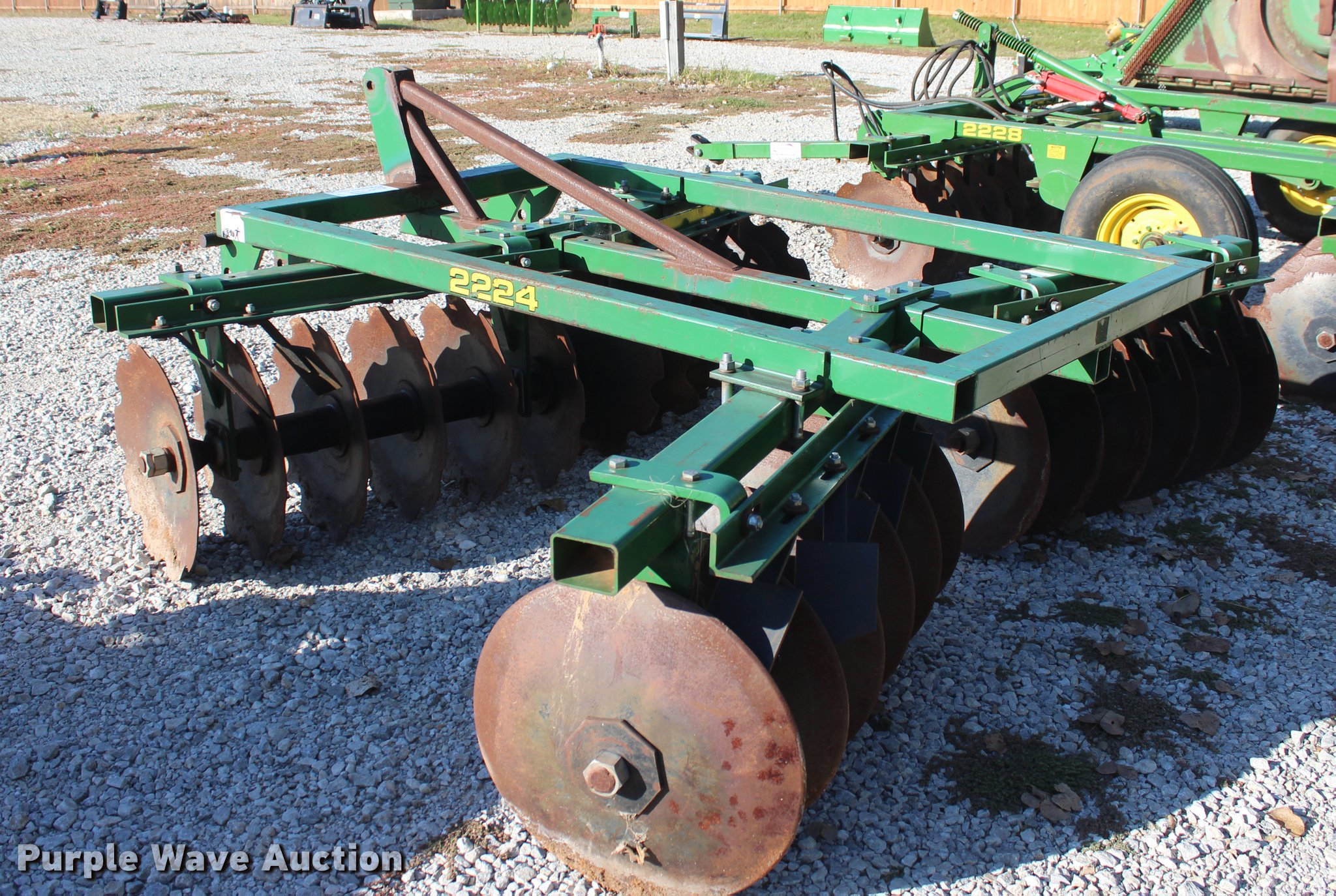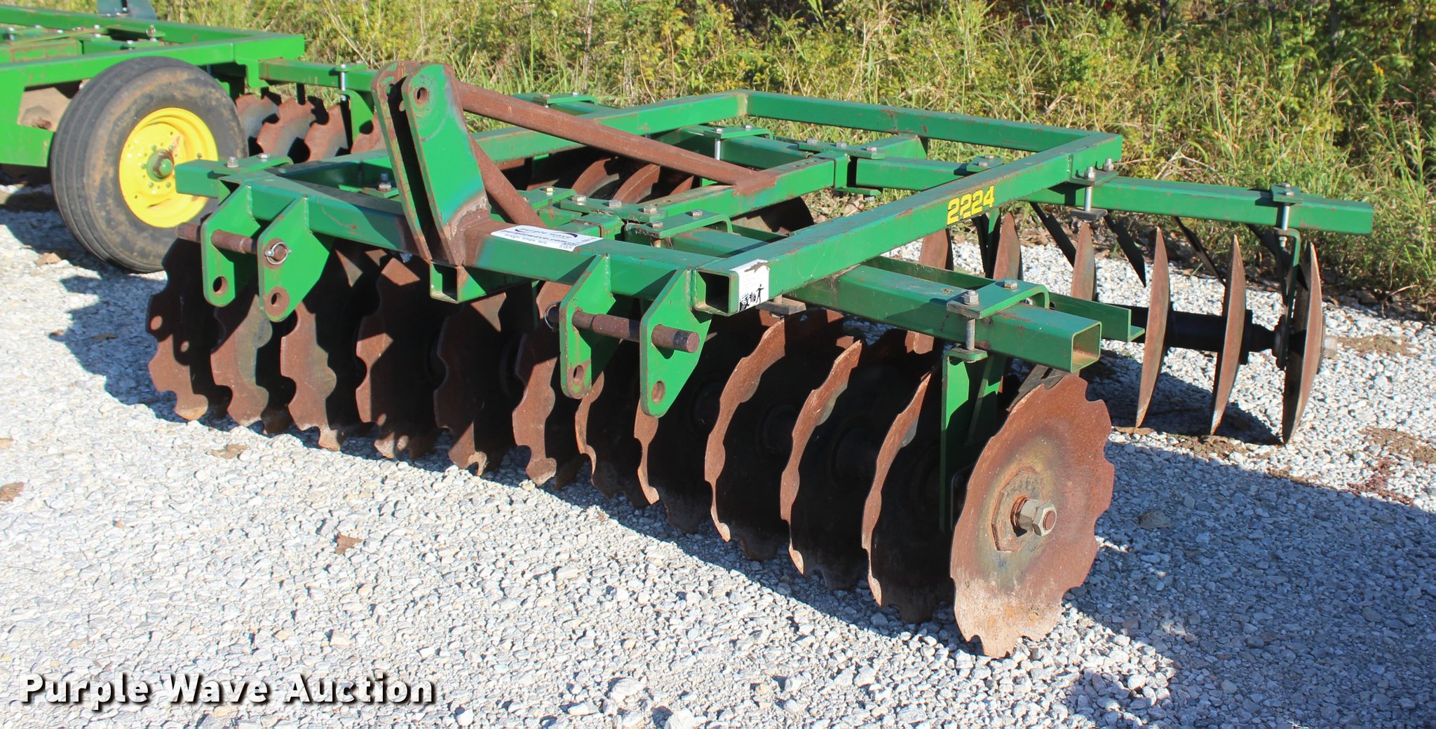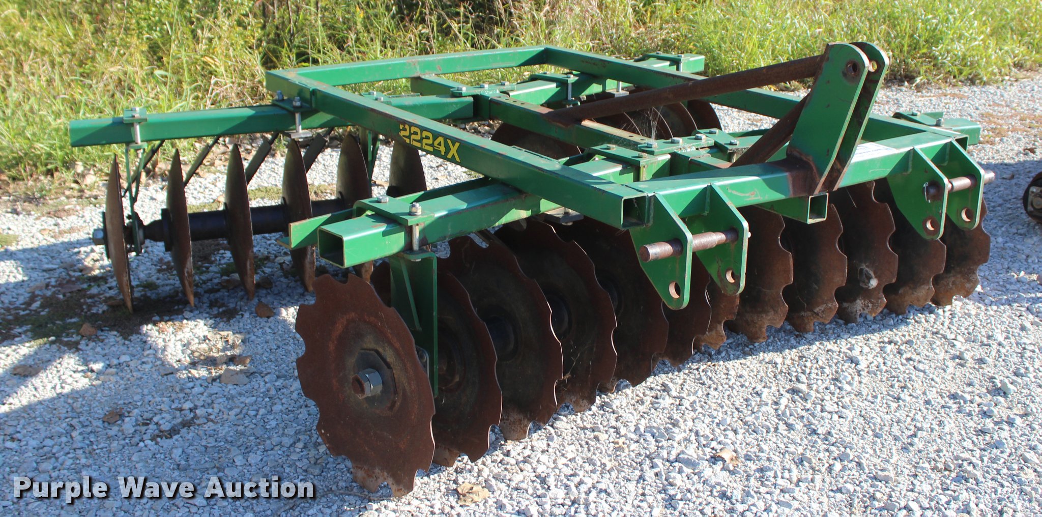 Purple Wave is selling a used Disk in Oklahoma. This item is a 2014 Industries America 2224 finish disk with the following: 10'W, 22" front and rear blades, 8" spacing, Disk scrapers, Manual angle adjustment, Three point