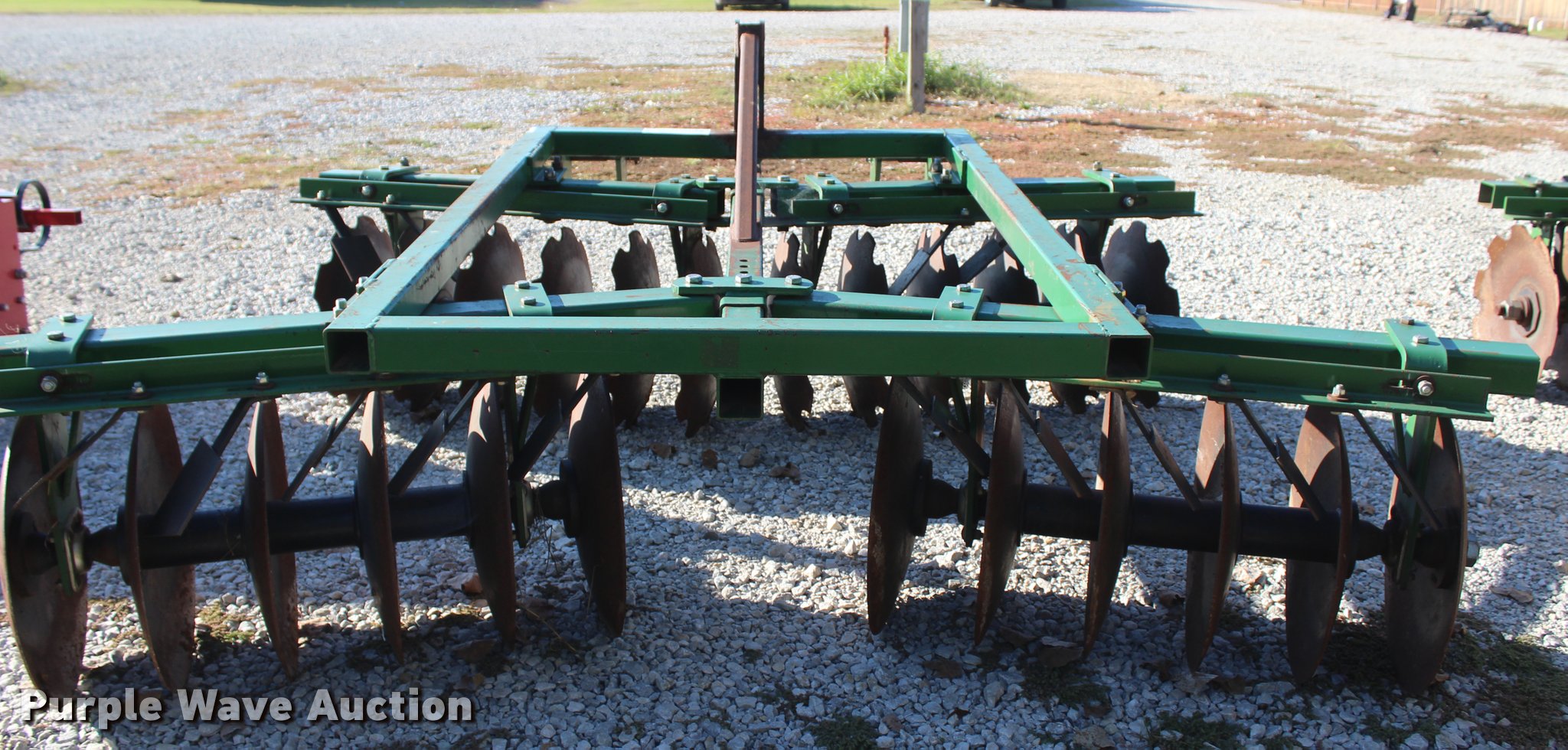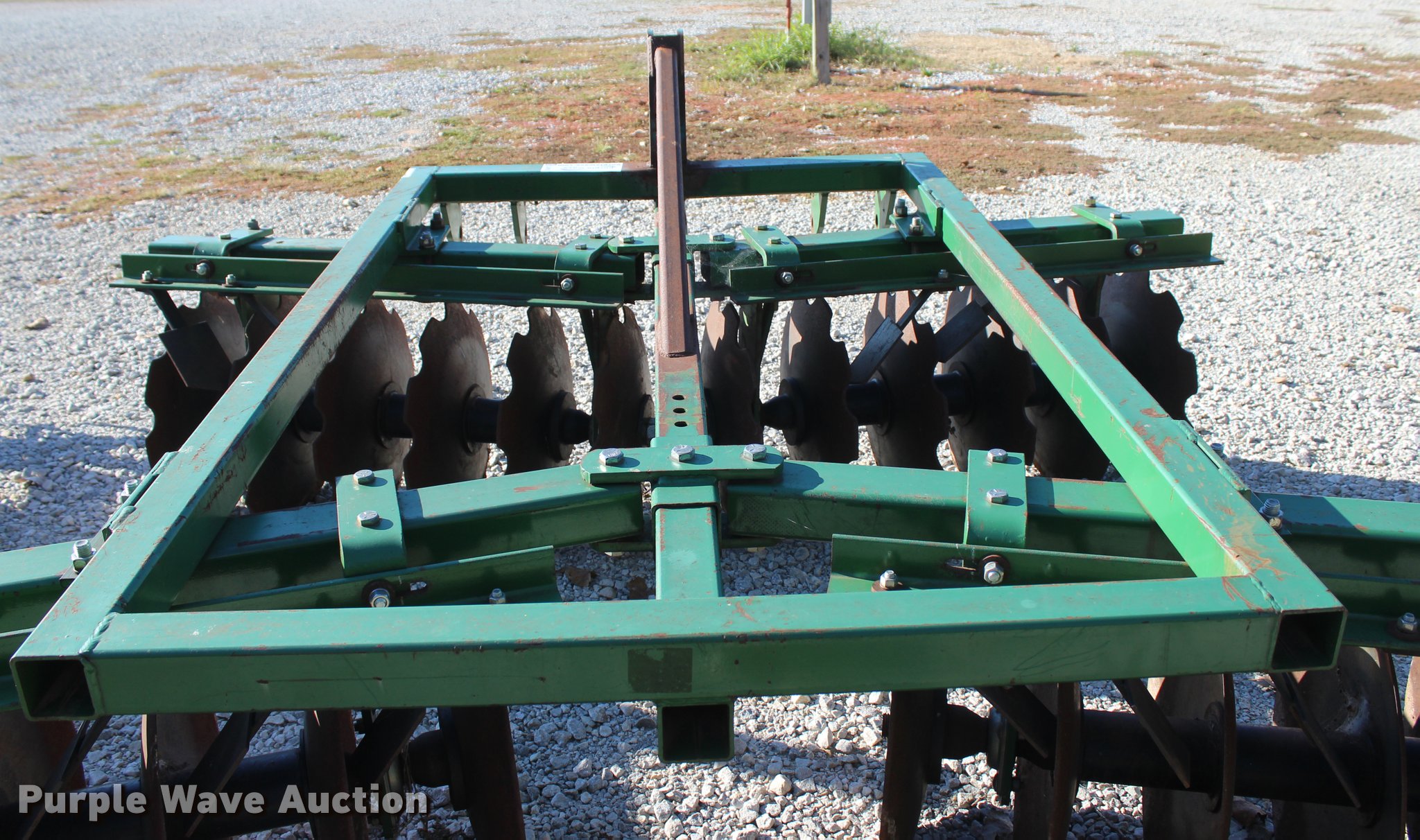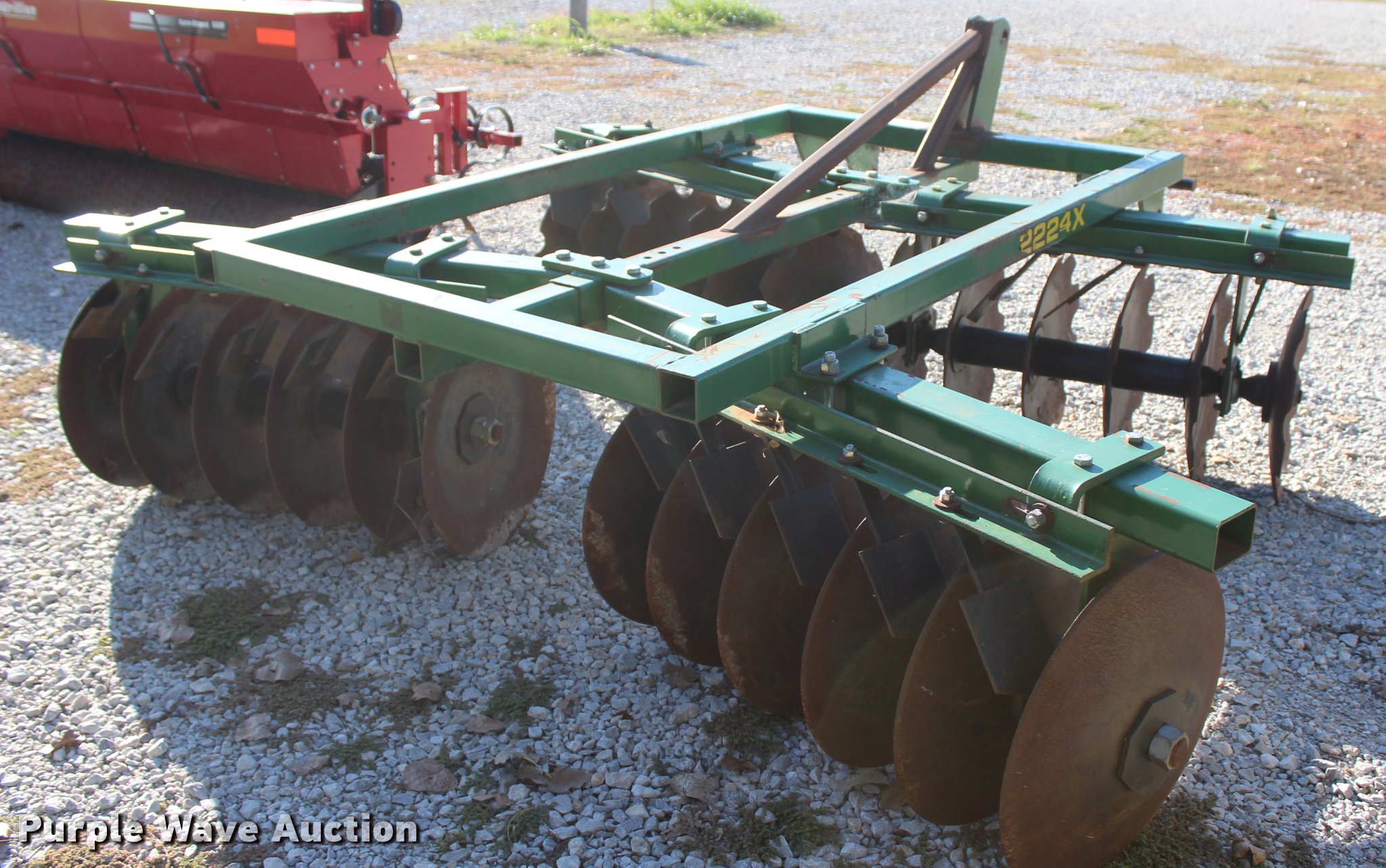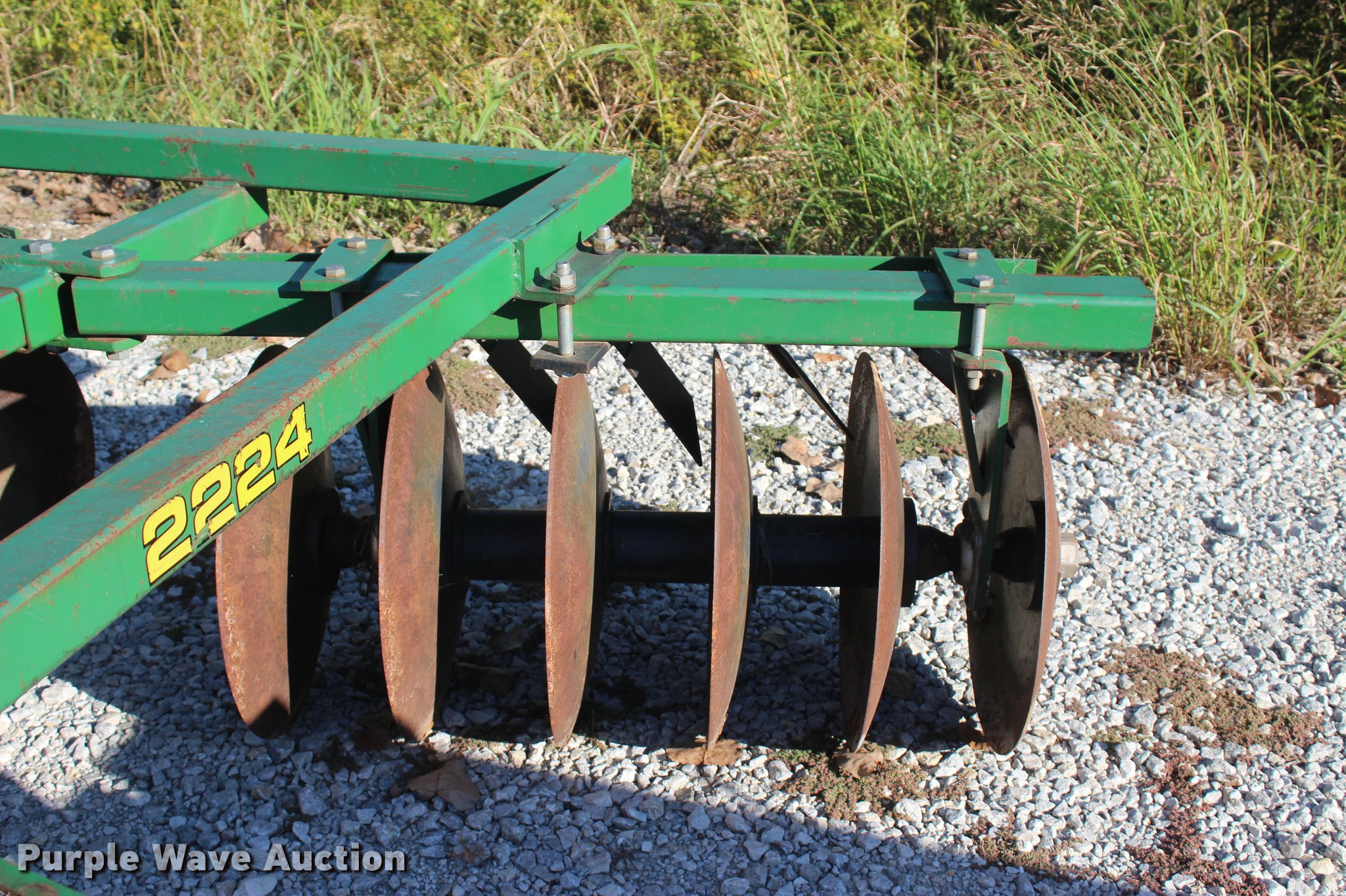 Purple Wave is selling a used Disk in Oklahoma. This item is a 2014 Industries America 2224 finish disk with the following: 10'W, 22" front and rear blades, 8" spacing, Disk scrapers, Manual angle adjustment, Three point