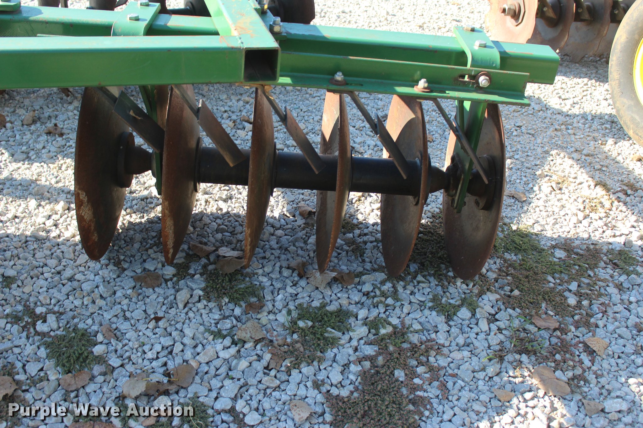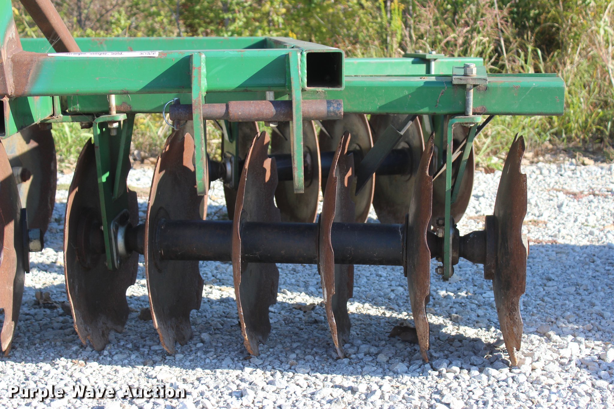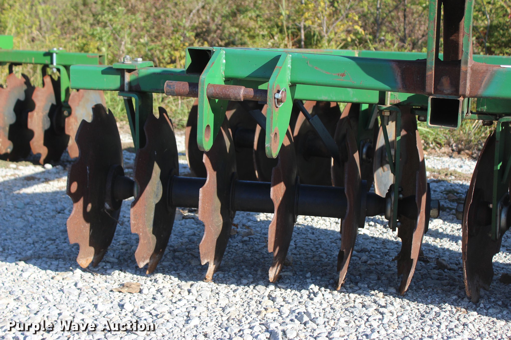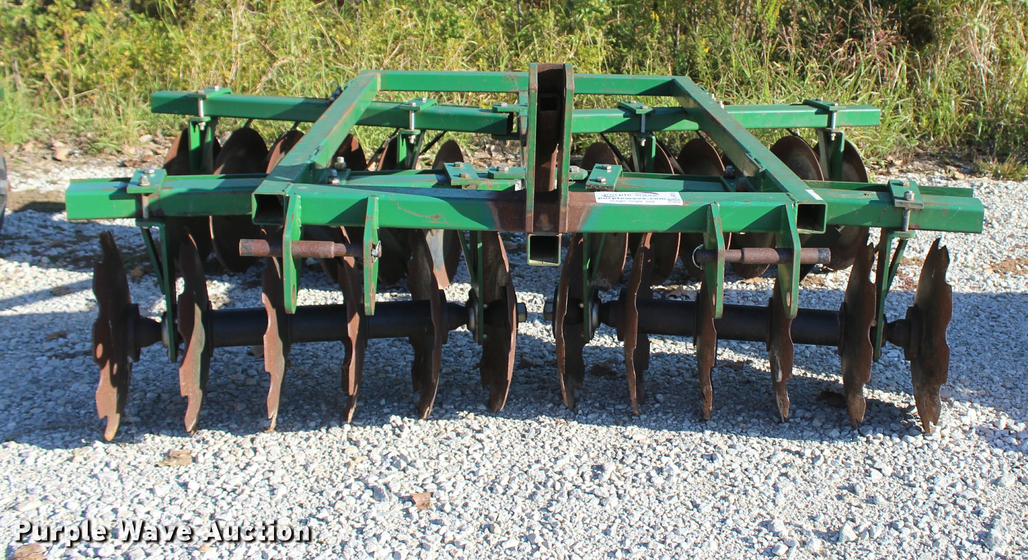 Purple Wave is selling a used Disk in Oklahoma. This item is a 2014 Industries America 2224 finish disk with the following: 10'W, 22" front and rear blades, 8" spacing, Disk scrapers, Manual angle adjustment, Three point