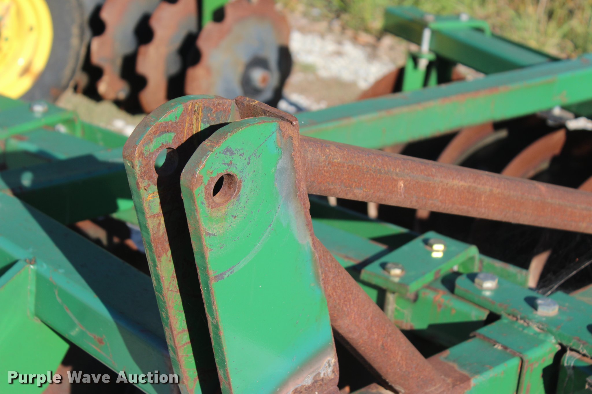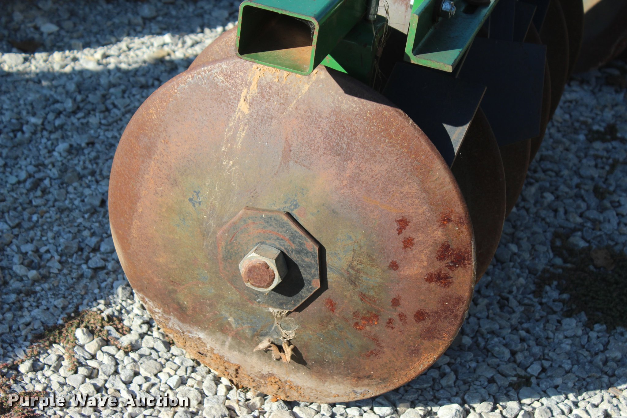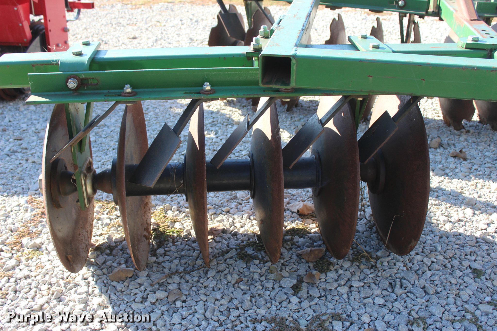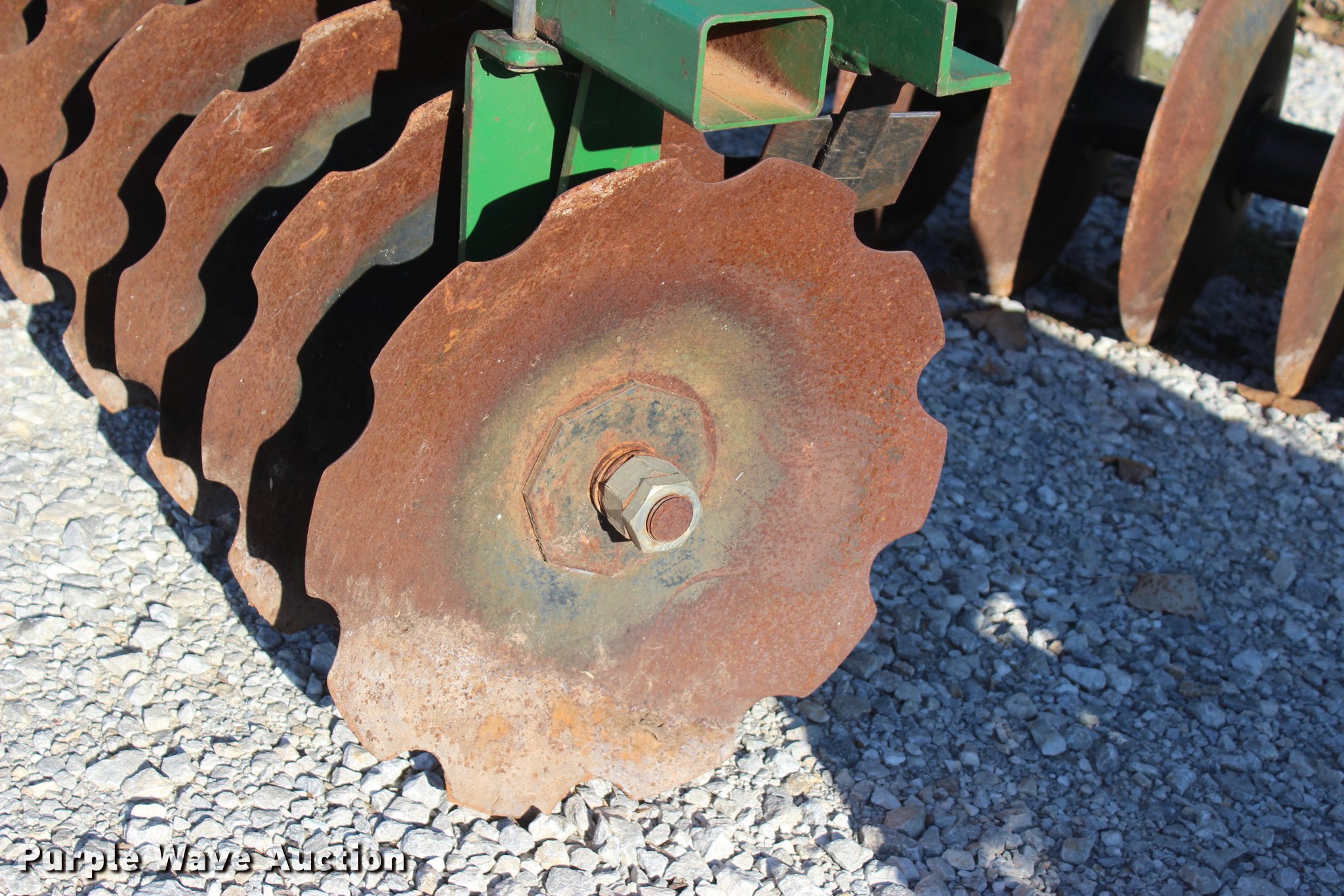 Purple Wave is selling a used Disk in Oklahoma. This item is a 2014 Industries America 2224 finish disk with the following: 10'W, 22" front and rear blades, 8" spacing, Disk scrapers, Manual angle adjustment, Three point