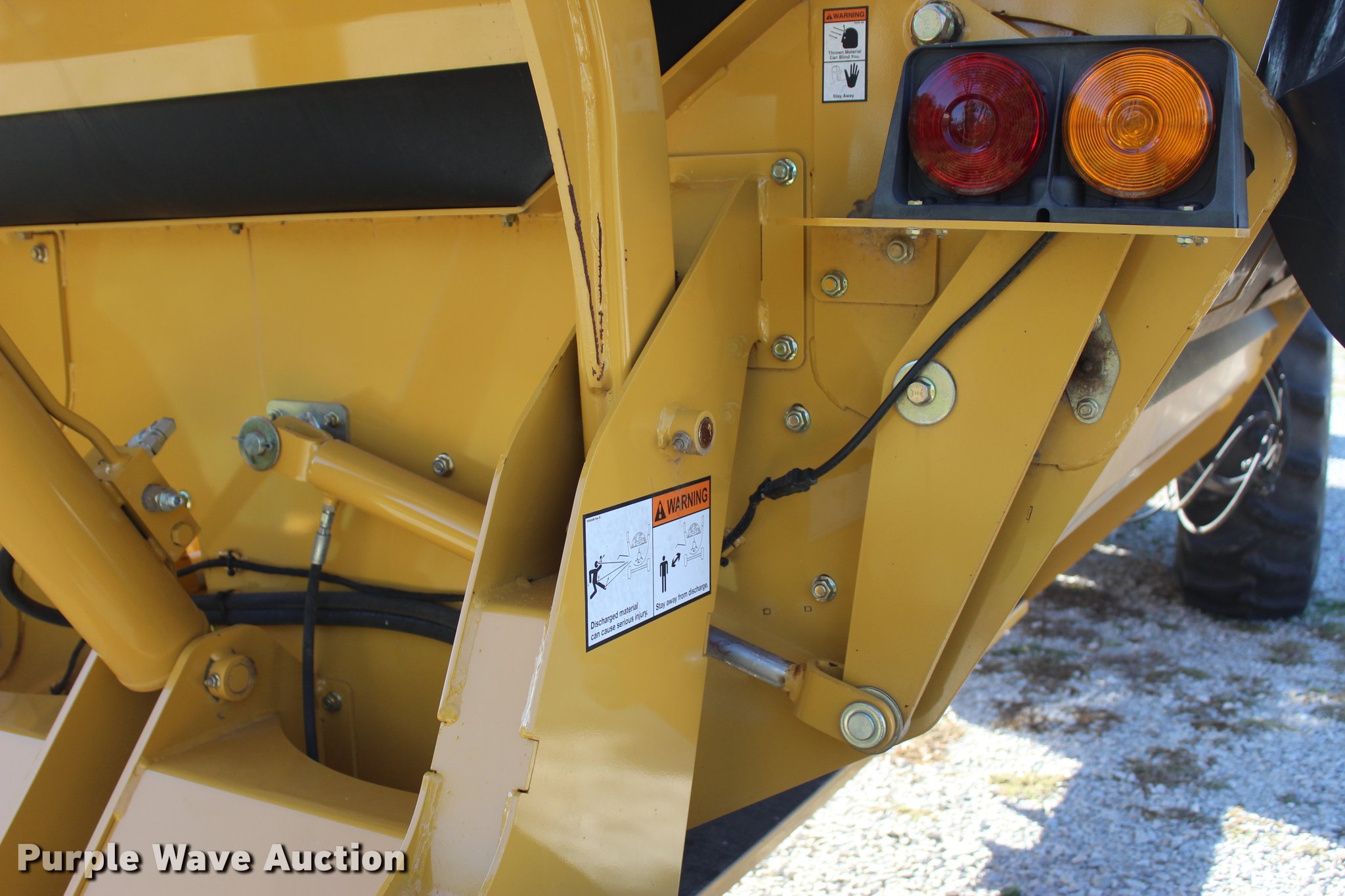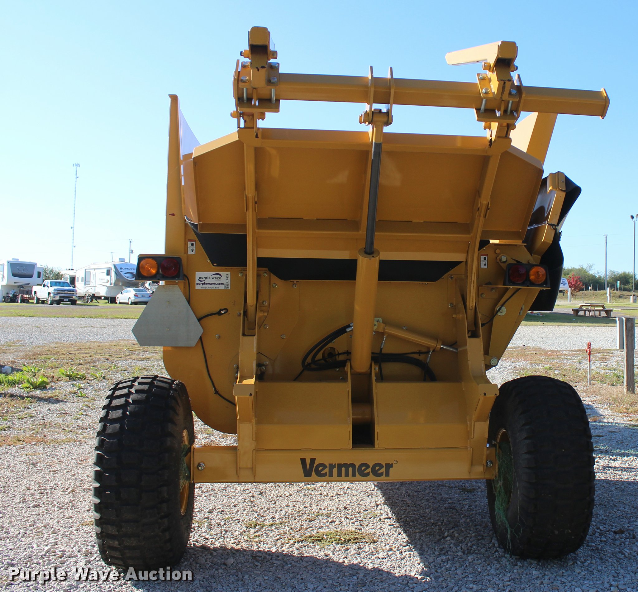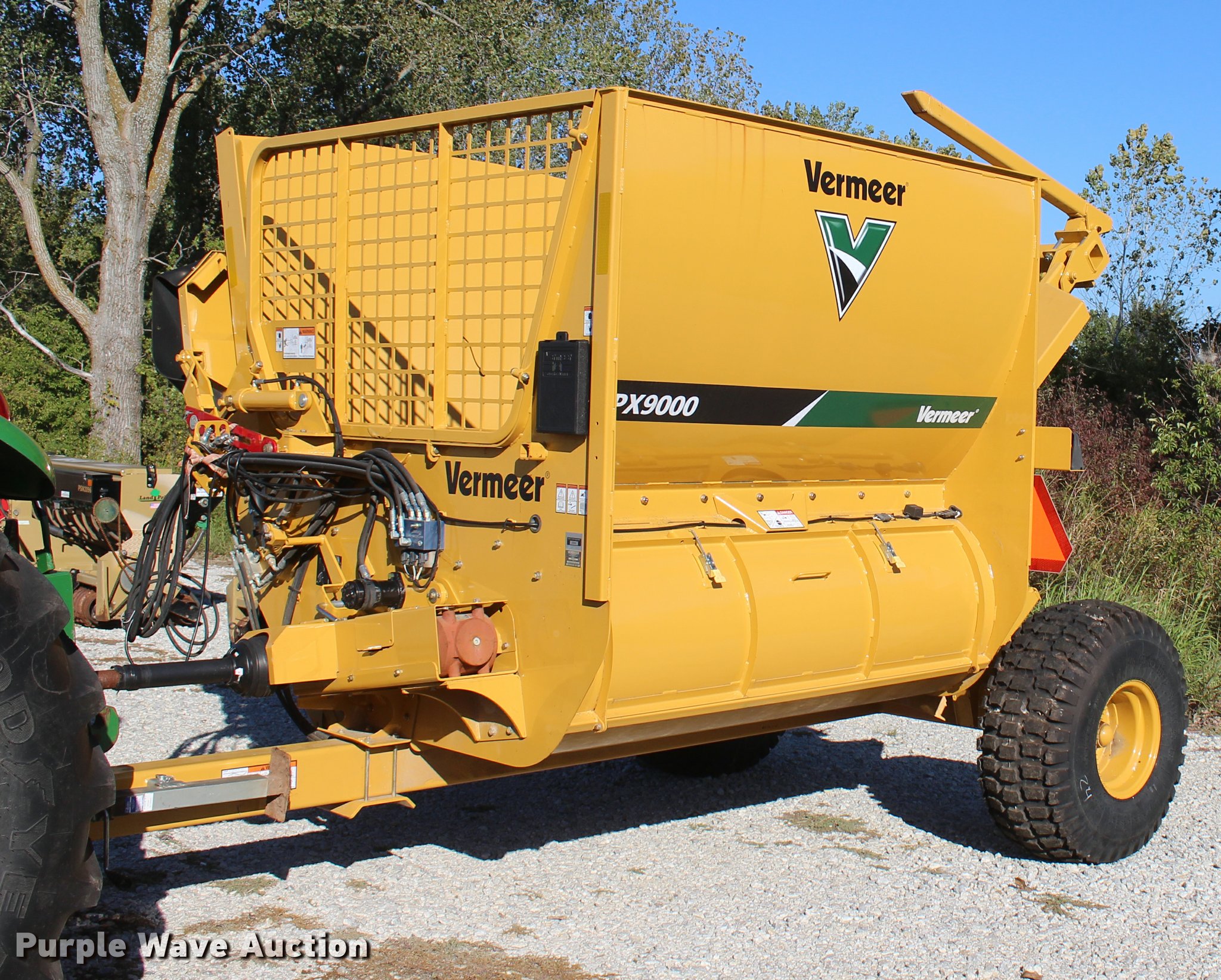 Purple Wave is selling a used Feed Mixer or Bale Processor in Oklahoma. This item is a 2014 Vermeer BPX9000 bale processor with the following: 15'L x 8.2'W x 8.5'H transport dimensions, 76"W discharge, 78" flail drum, 1000 PTO, Slat and chain bed, Split shaft, (3) roller chains, Self-cleaning, Offset rotor, Lower access door, T-style frame, Wired controls, Approximately 20 bales processed through unit, Goodyear 16.5L-16.1SL tires, Serial 1VRA201R2E1002166