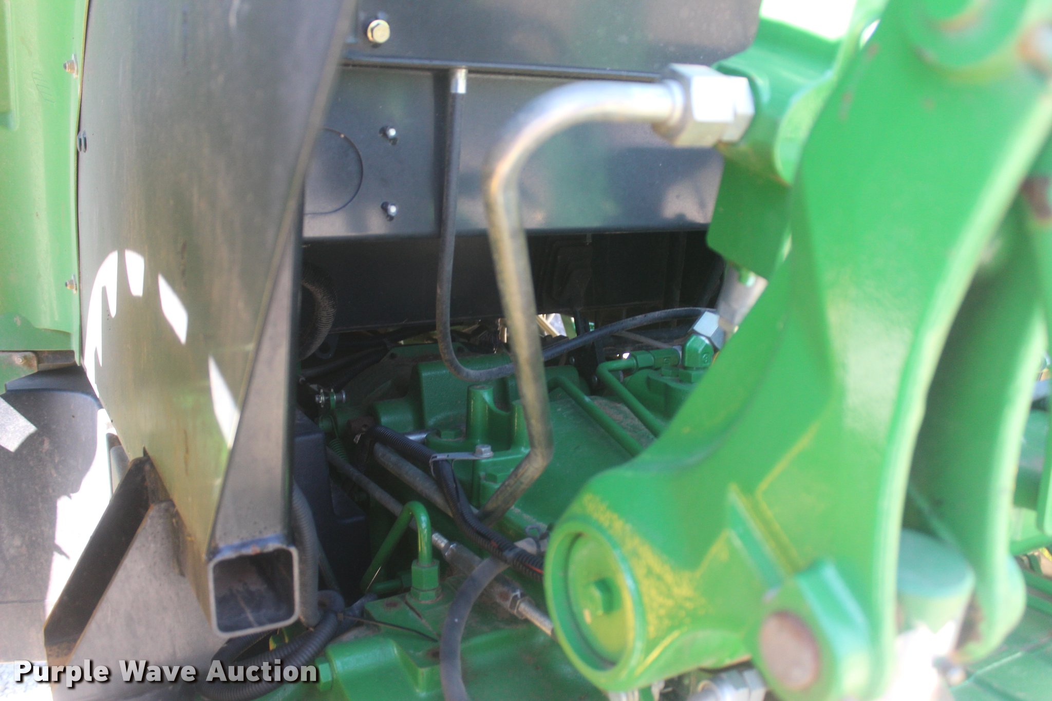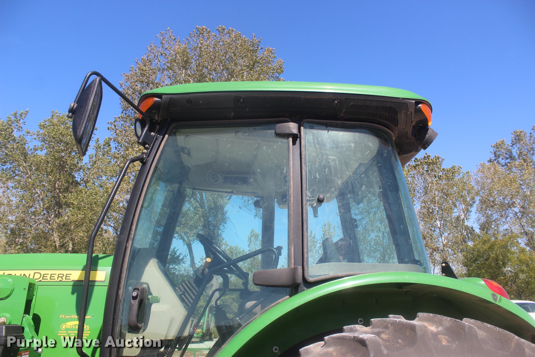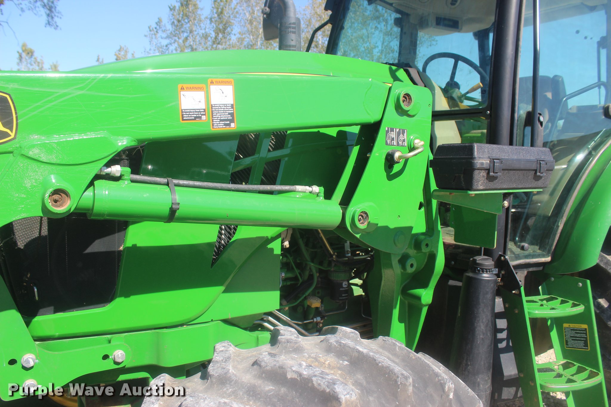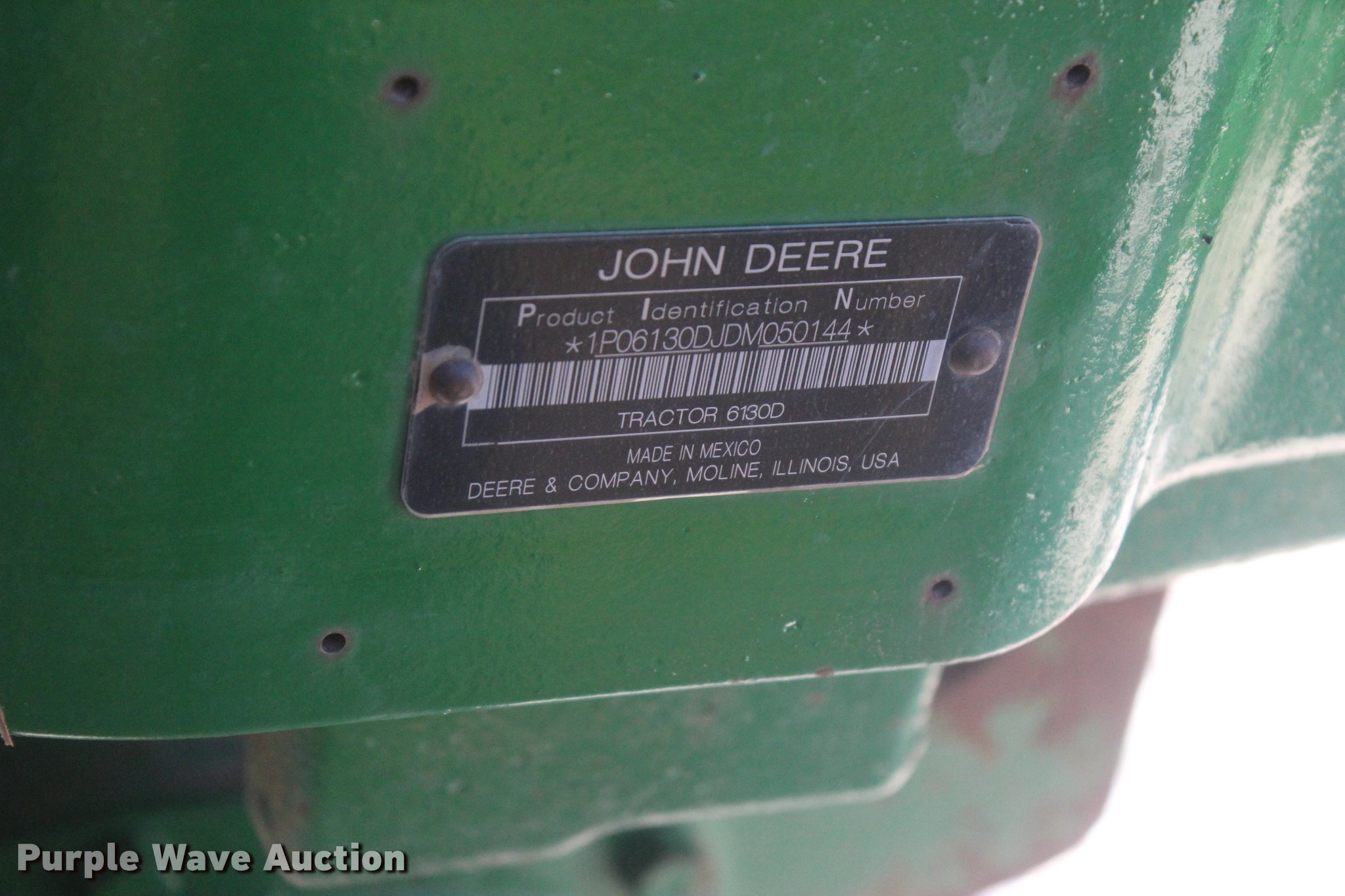 Purple Wave is selling a used Tractor in Oklahoma. This item is a 2013 John Deere 6130D MFWD tractor with the following: 1,204 hours on meter, John Deere 4045HP057 4.5L four cylinder turbo diesel engine, 130 HP, Partial synchronized transmission with power shuttle, 9F-9R gears, Left-Hand reverser, Differential lock, AC and heat, AM/FM/weatherband, Spring suspension seat, Tilt steering wheel, Visors, John Deere H310 loader, 75"W bucket, Joystick control, Three point, Top link, 540/1000 PTO, Draw bar, Seven pin outlet, (2) rear hydraulic remote sets, Toolbox, 92" wheelbase, Firestone 14.9-24 front tires, Firestone 18.4-70 rear tires, Three point quick attach, top-link, and draw bar are not included, Serial 1P06130DJDM050144