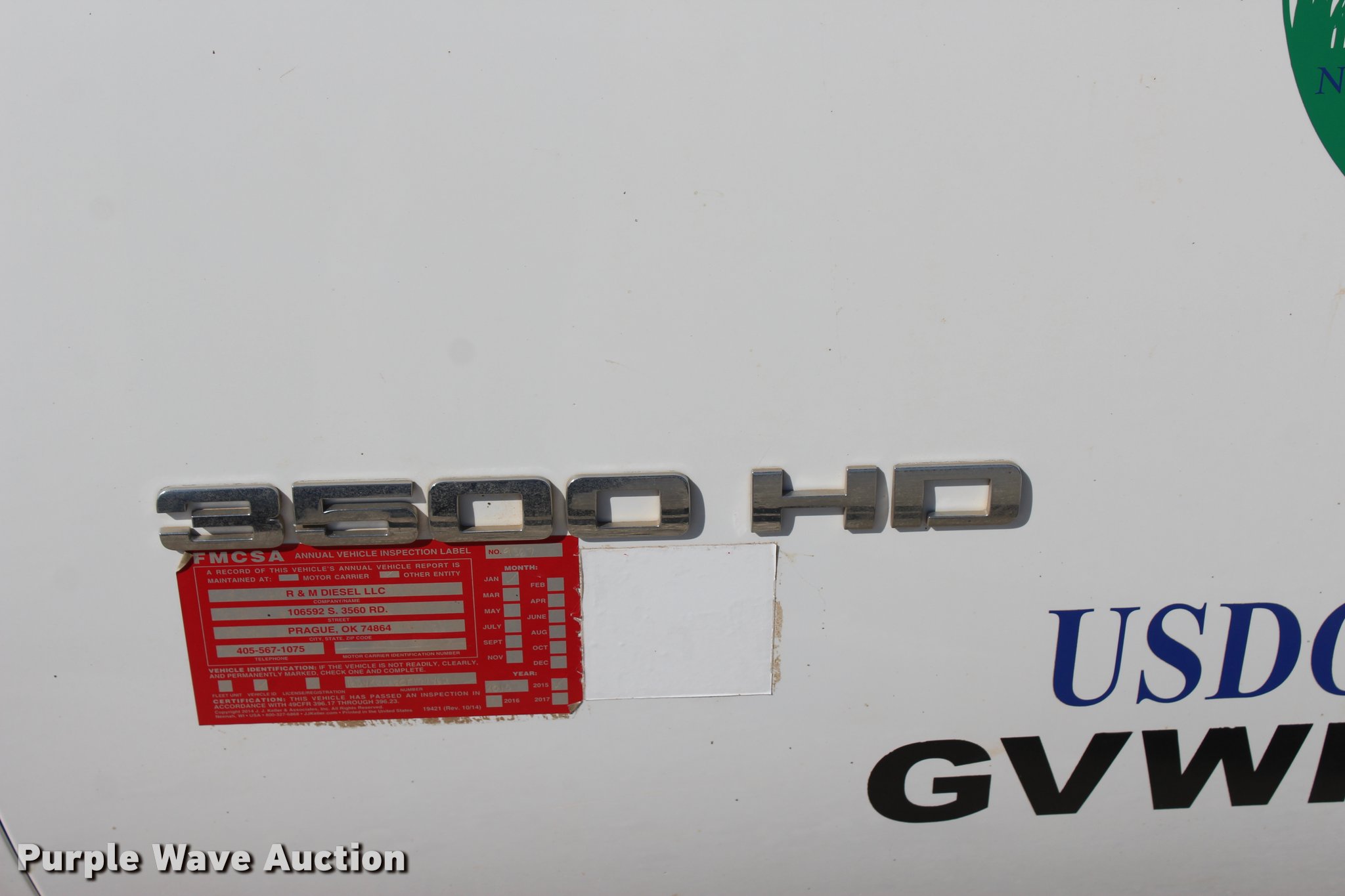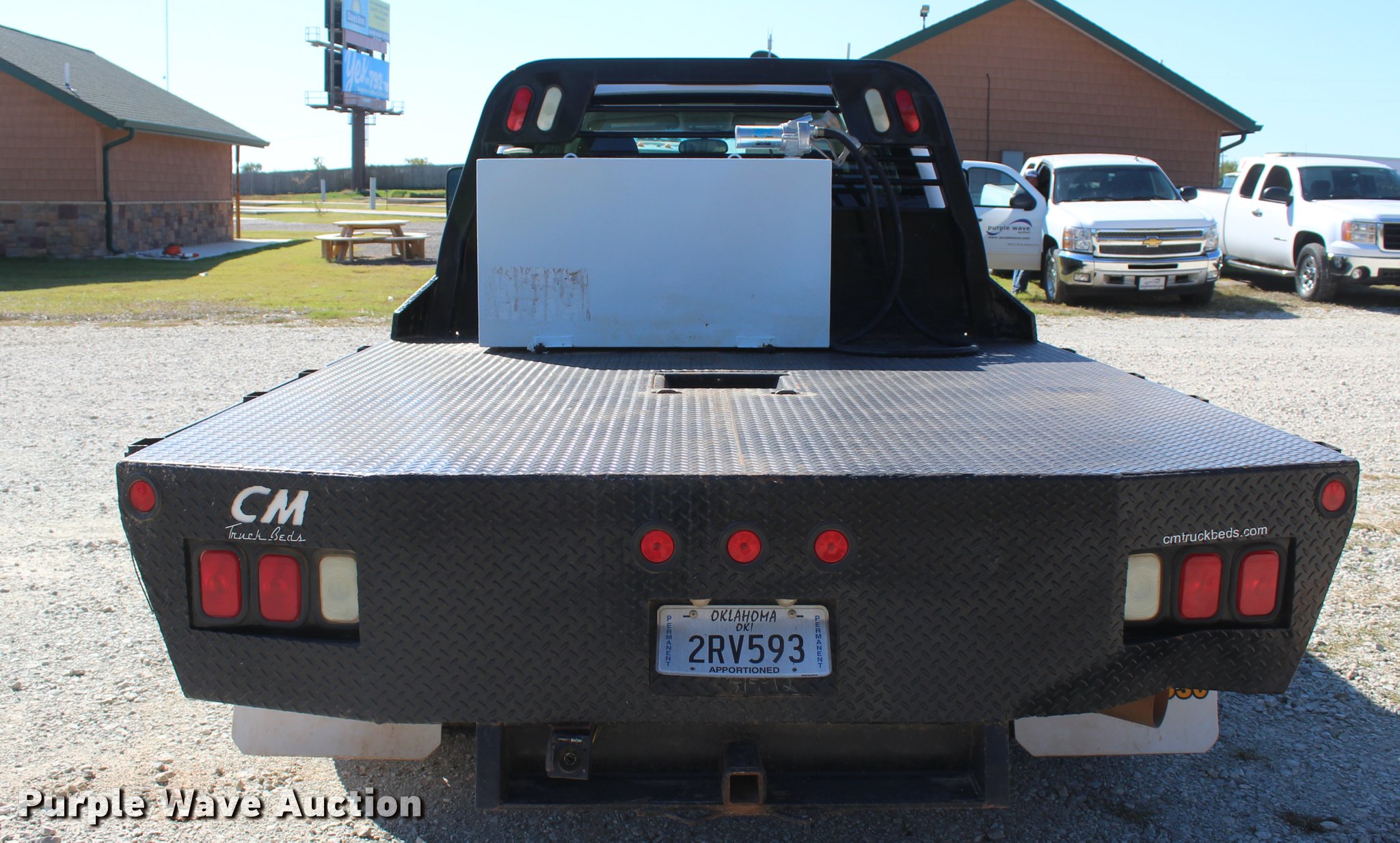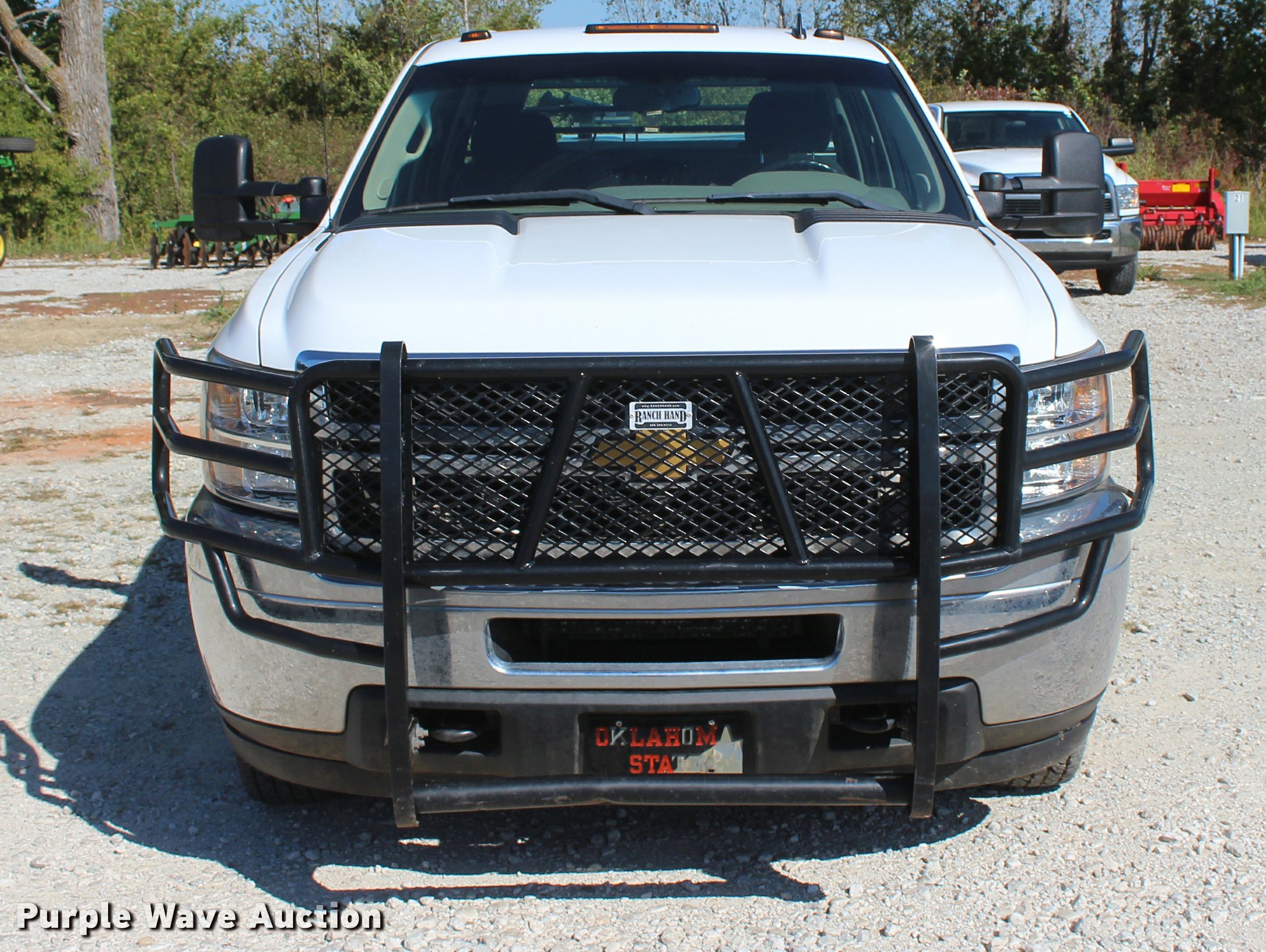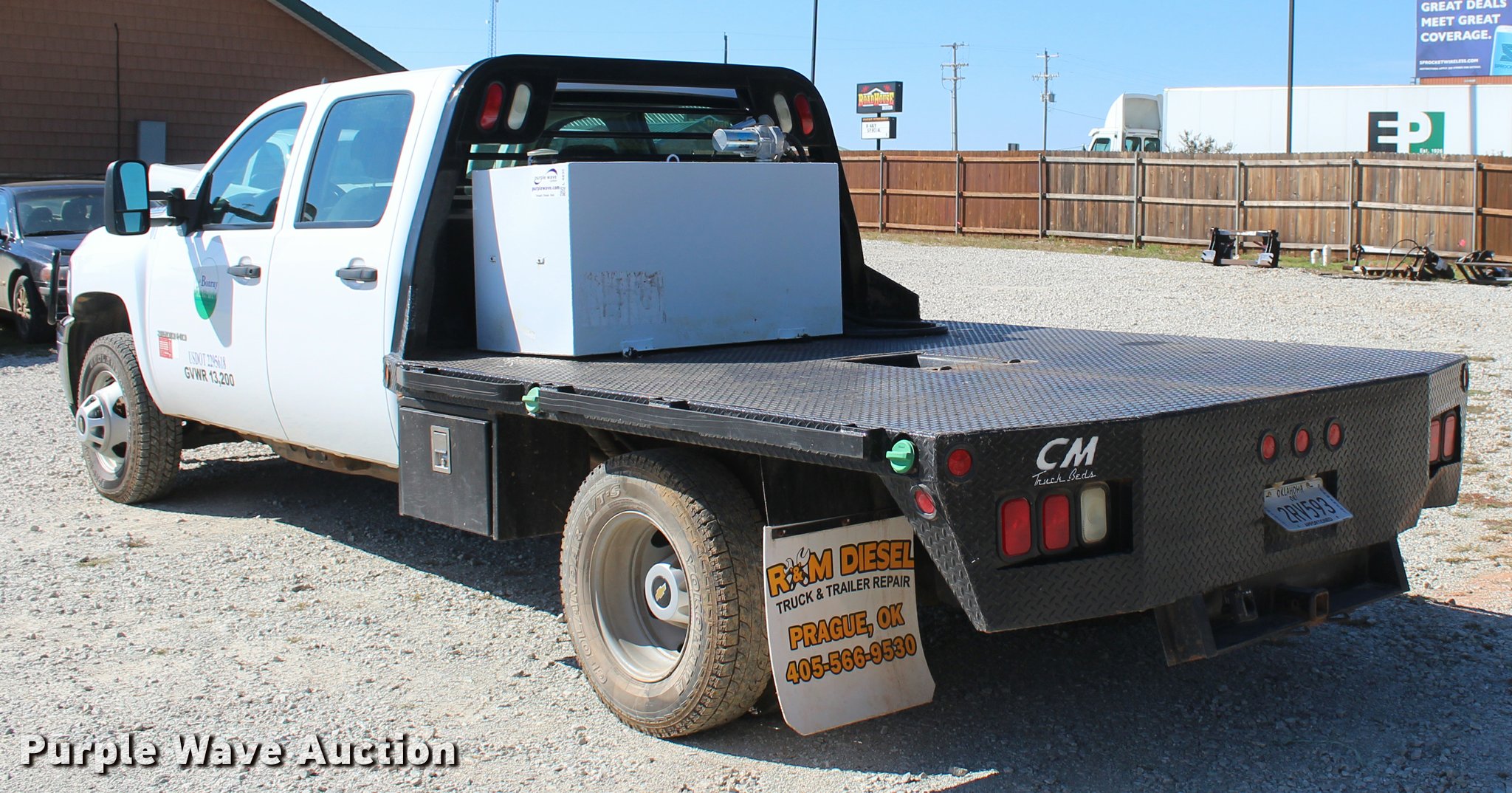 Purple Wave is selling a used 3/4 or 1 Ton Pickup or Van in Oklahoma. This item is a 2012 Chevrolet Silverado 3500HD Crew Cab flatbed pickup truck with the following: 65,240 miles on odometer, 2,131 hours on meter, 6.6L V8 OHV 32V turbo diesel engine, Automatic transmission, Four wheel drive, AC and heat, Tilt, Cruise, AM/FM/CD, Power windows, locks, and mirrors, Cloth interior, Trailer brake controller, CM 9'L x 96"W flatbed, Stake side pockets, Toolboxes, Delta 100 gallon fuel tank, GPI pump, Hose, Nozzle, Ranch Hand grill guard, Receiver hitch, Gooseneck hitch, Trailer wiring, LT235/80R17 tires, Unit# 01