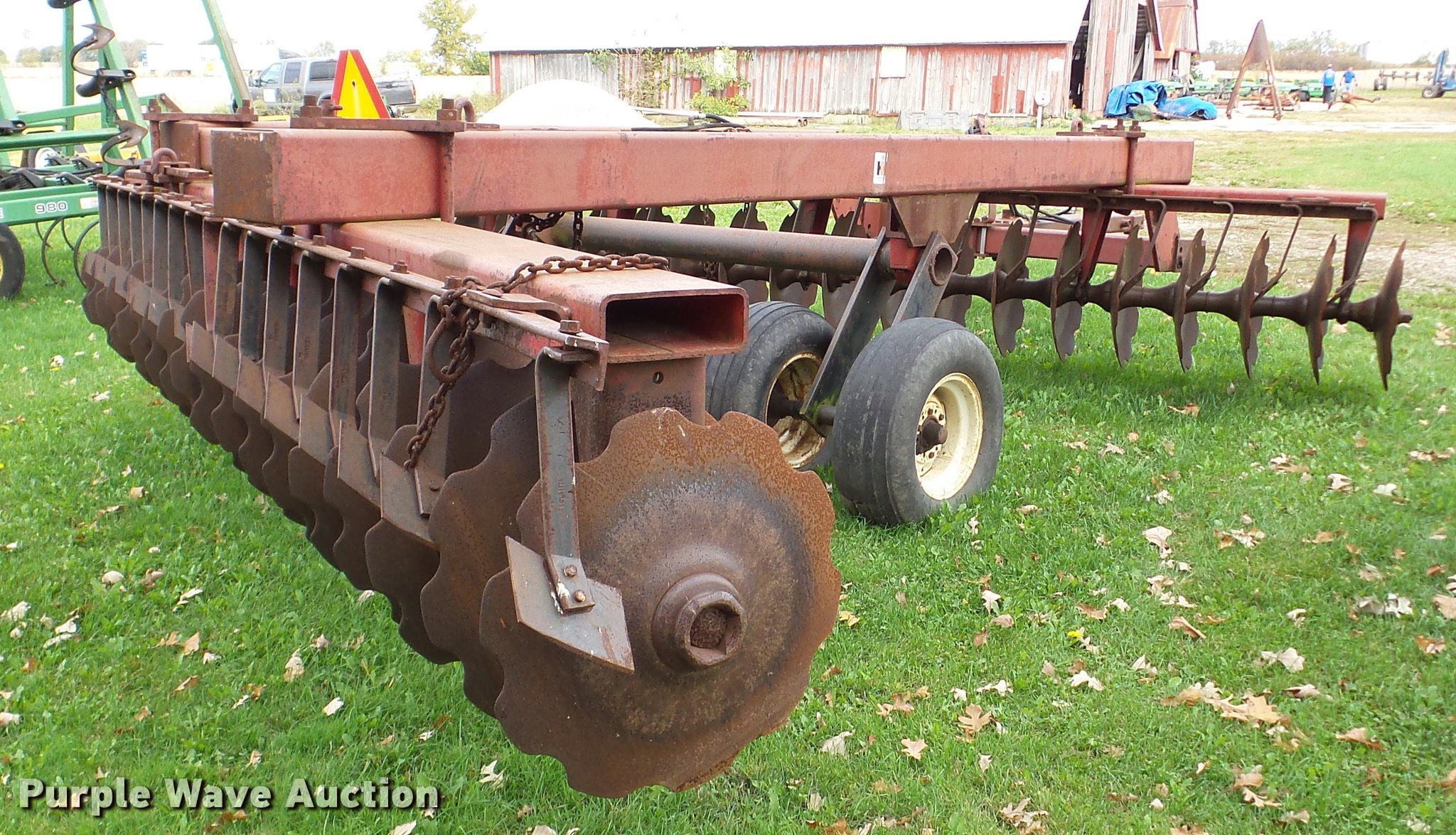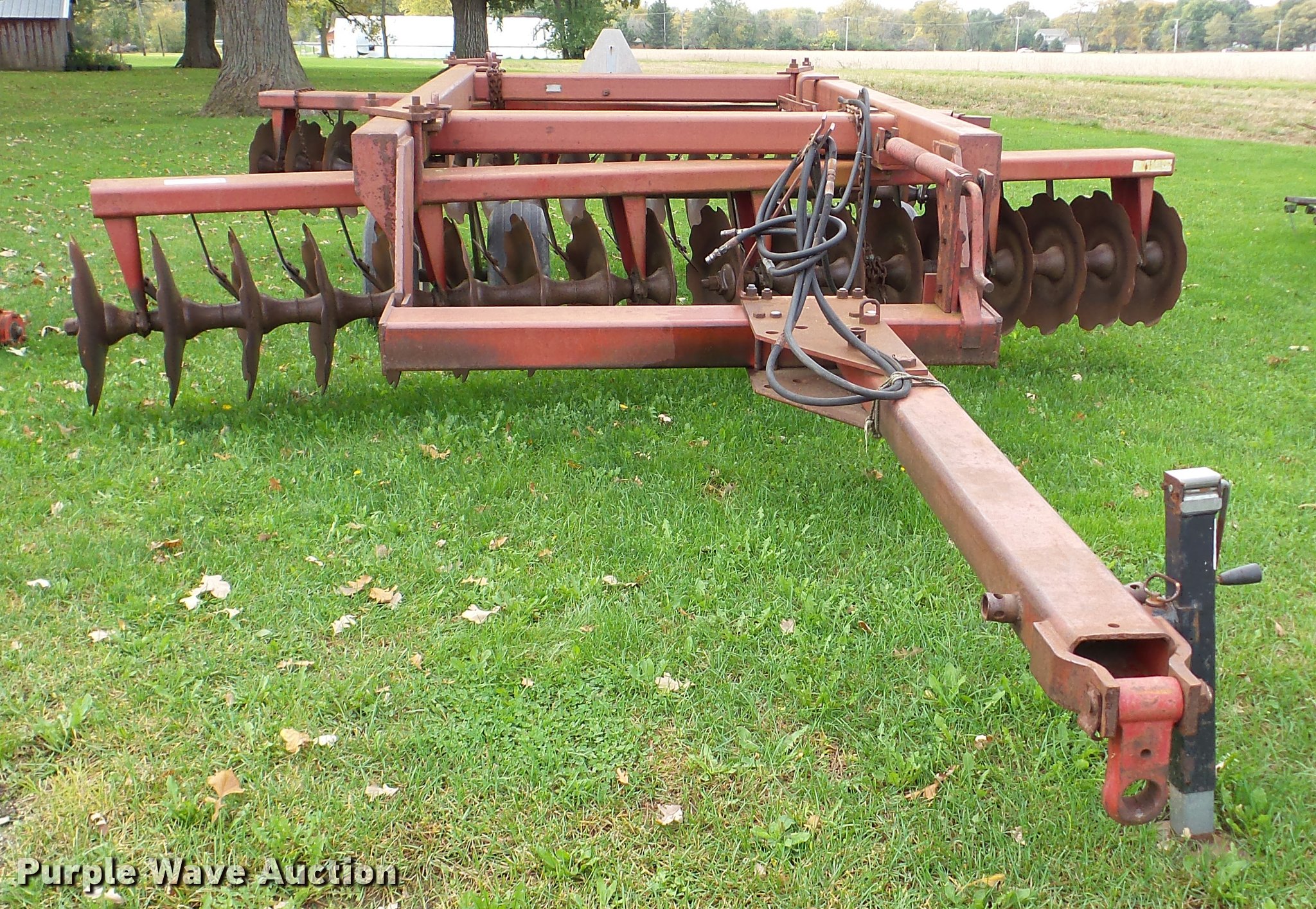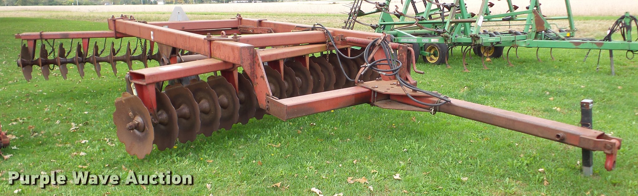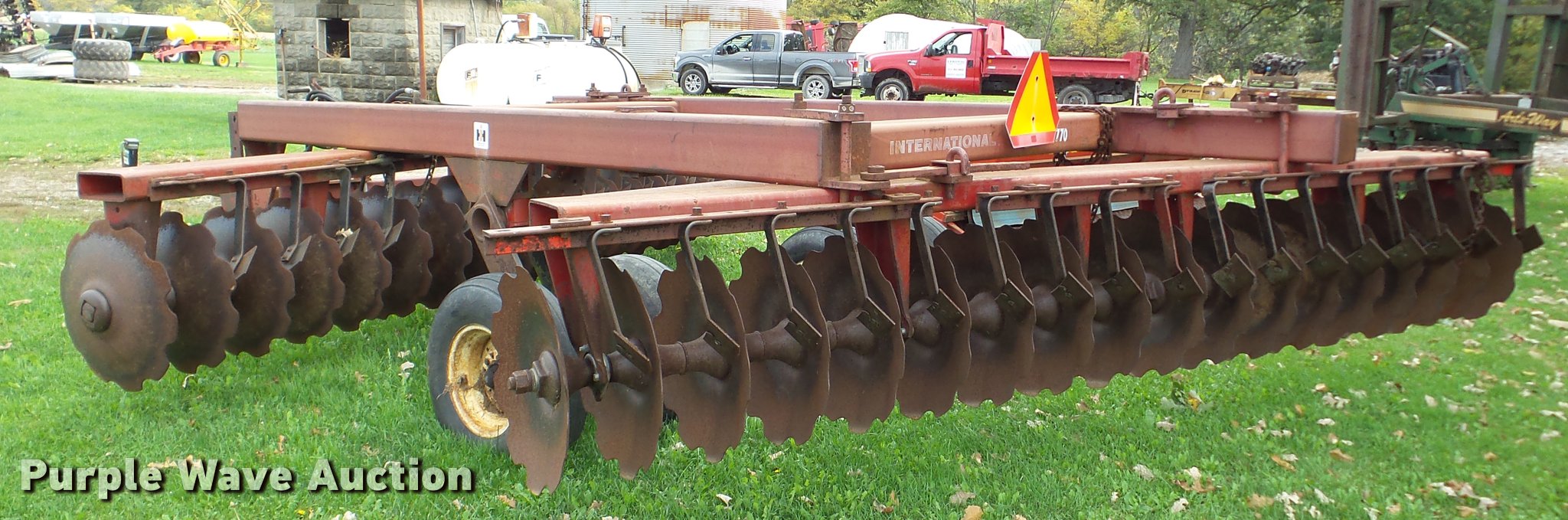 Purple Wave is selling a used Disk in Illinois. This item is a International 770 off-set disk with the following: 15'W, 24.5" diameter blades, Hydraulic lift, Pin hitch, 11L-15 tires, Serial 0470000V018152