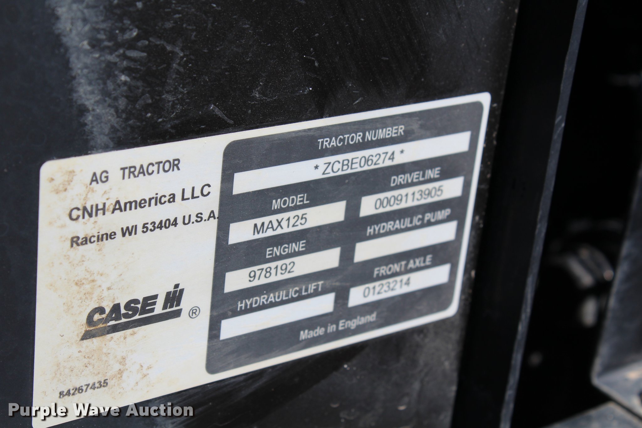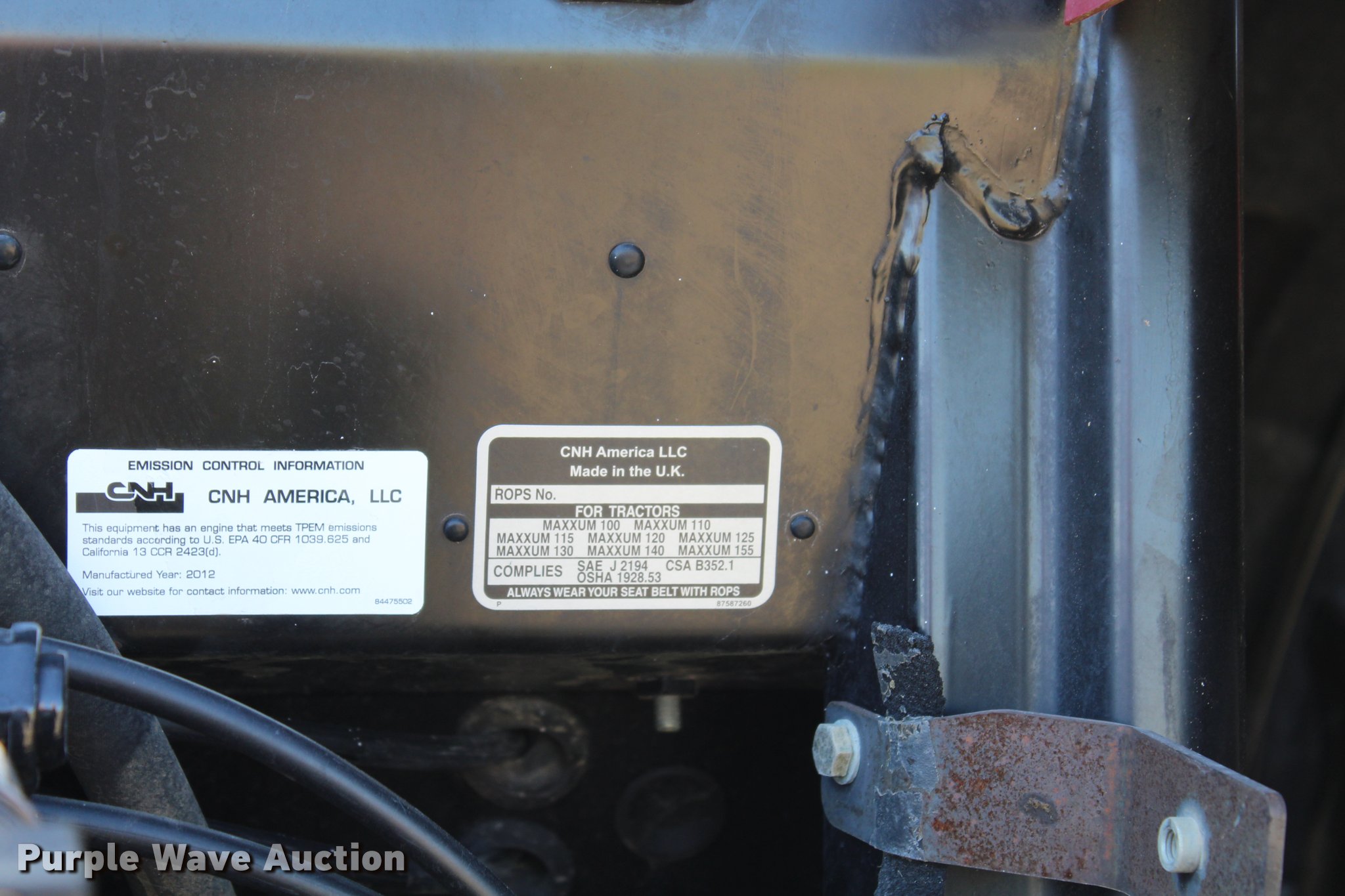 Purple Wave is selling a used Tractor in New Mexico. This item is a 2012 Case IH Maxxum 125 MFWA tractor with the following: 548 hours on meter, Case IH six cylinder diesel engine, Serial 978192, Powershift transmission, 12F-12R gears, Differential lock, Front wheel assist, AC and heat, Tilt steering wheel, AM/FM, Suspension seat, Instructor's seat, Shade, Three point, Top link, Seven pin outlet, 540 PTO, Auxiliary hydraulics, 102" wheelbase, 380/85R26 front tires, 380/90R46 rear tires, Serial ZCBE06274