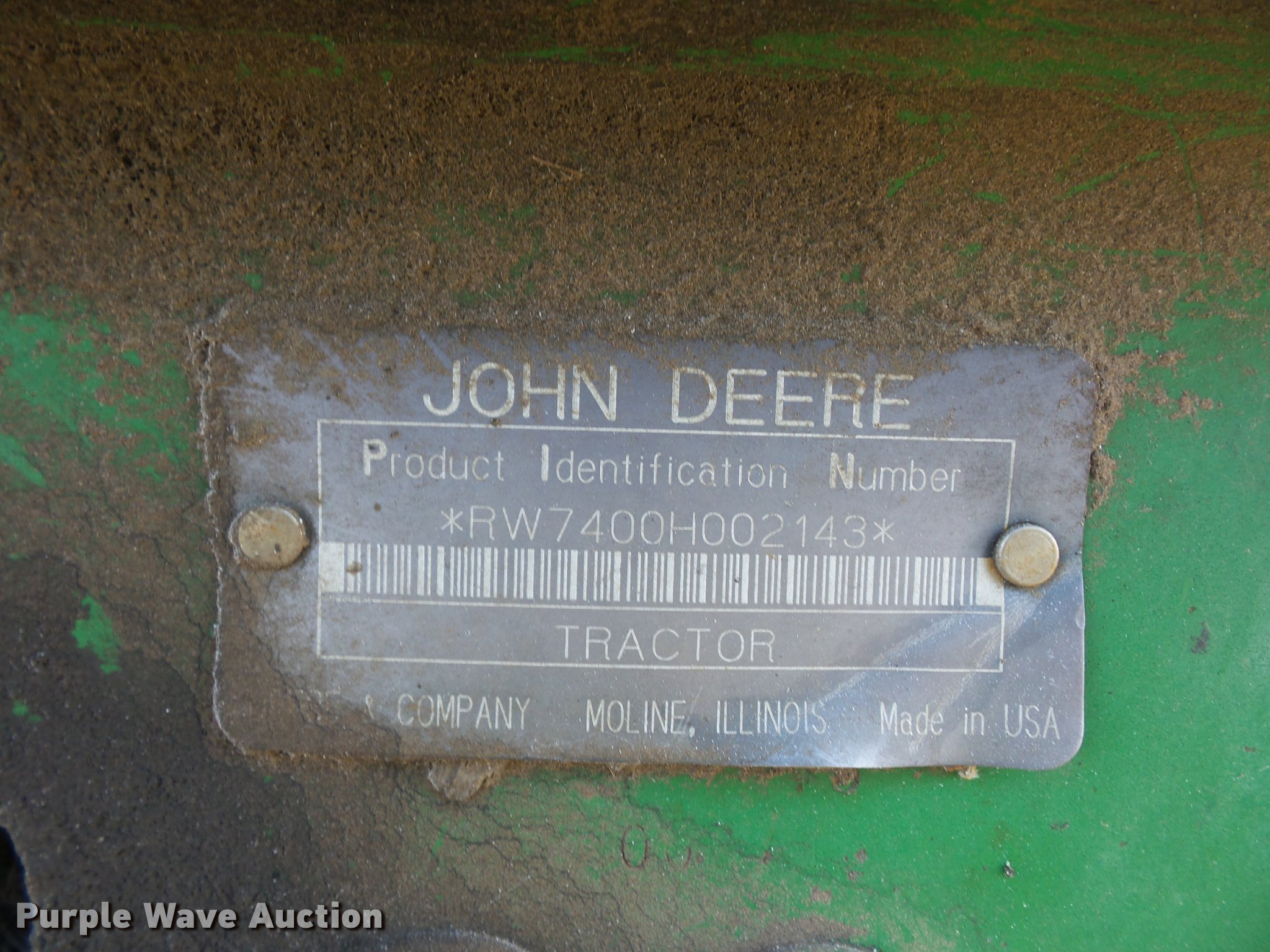 Purple Wave is selling a used Tractor in Kansas. This item is a 1994 John Deere 7400 MFWD tractor with the following: 11,716 hours on meter, John Deere six cylinder turbo diesel engine, Quad-Range transmission, 16F-16R gears, AC and heat, Joystick loader controls, Three point, 540 PTO, Front hydraulic remotes, (3) rear hydraulic remote sets, 340/85R28 front tires, 18.4R38 rear tires, Serial RW7400H002143