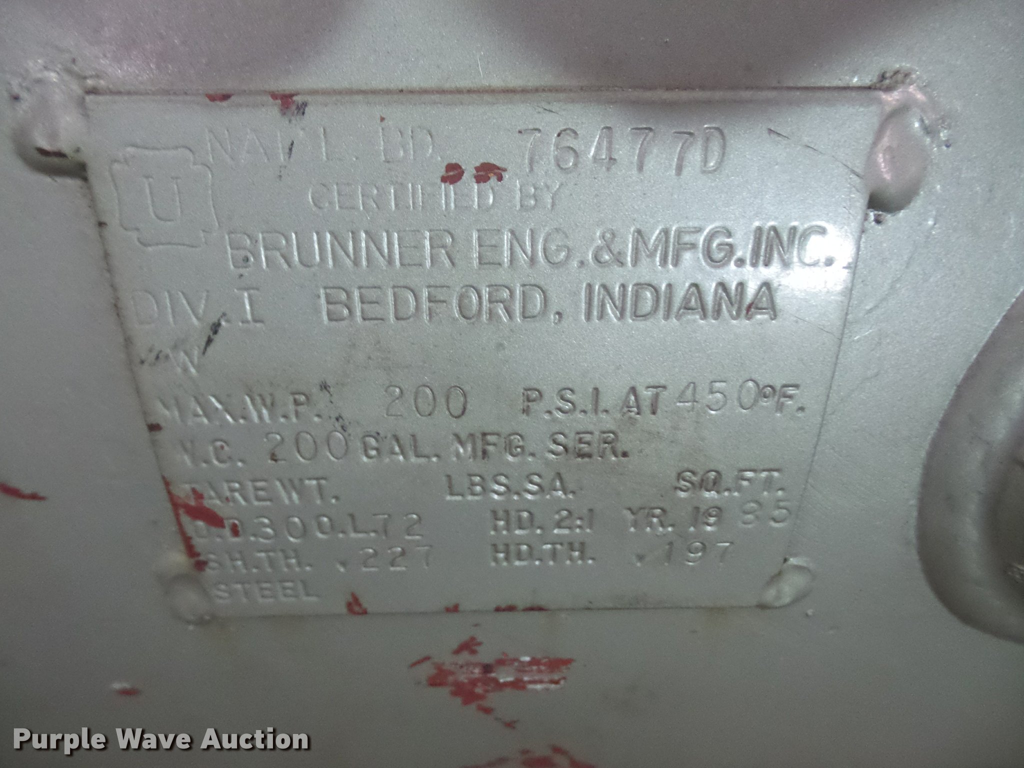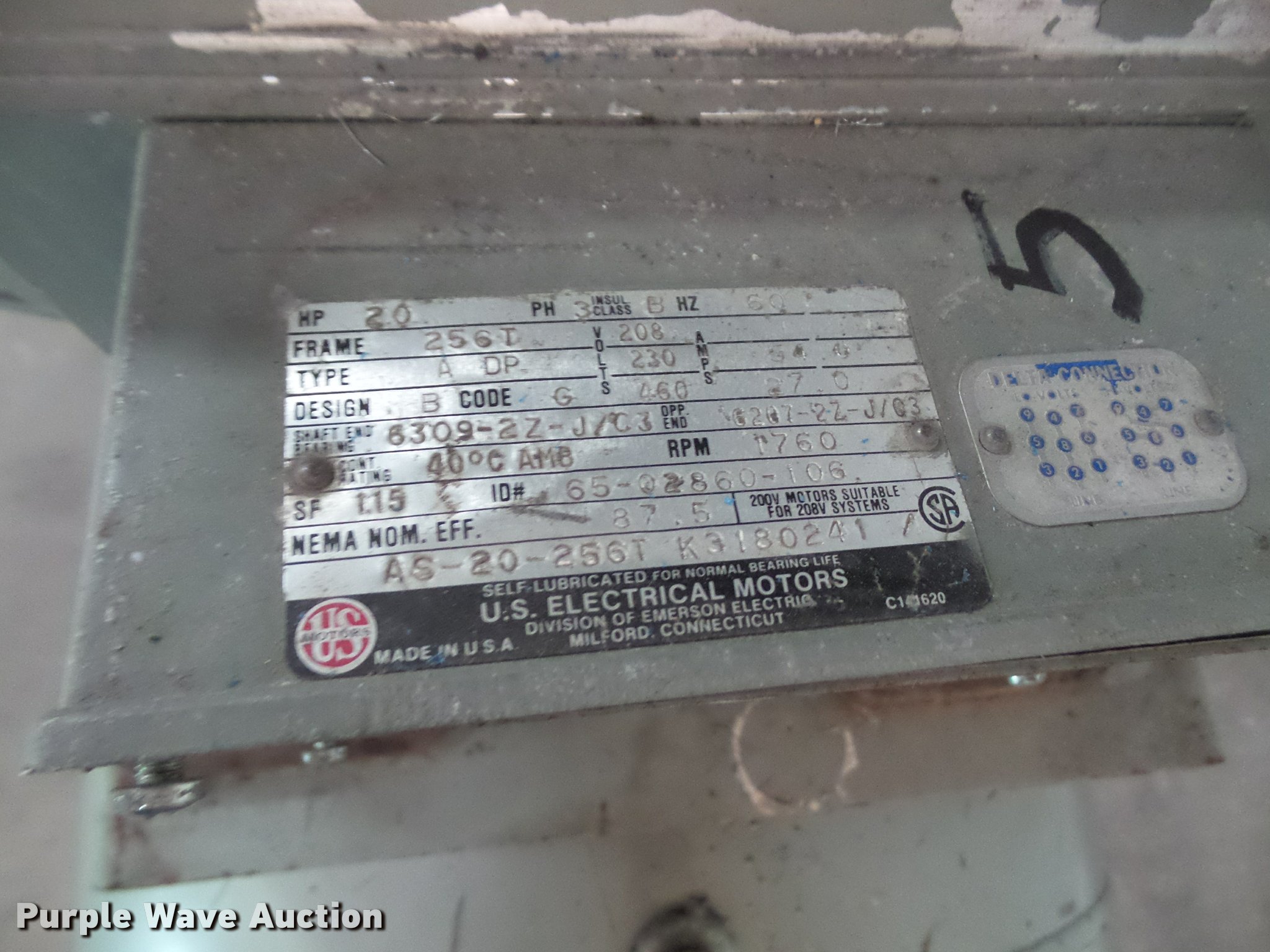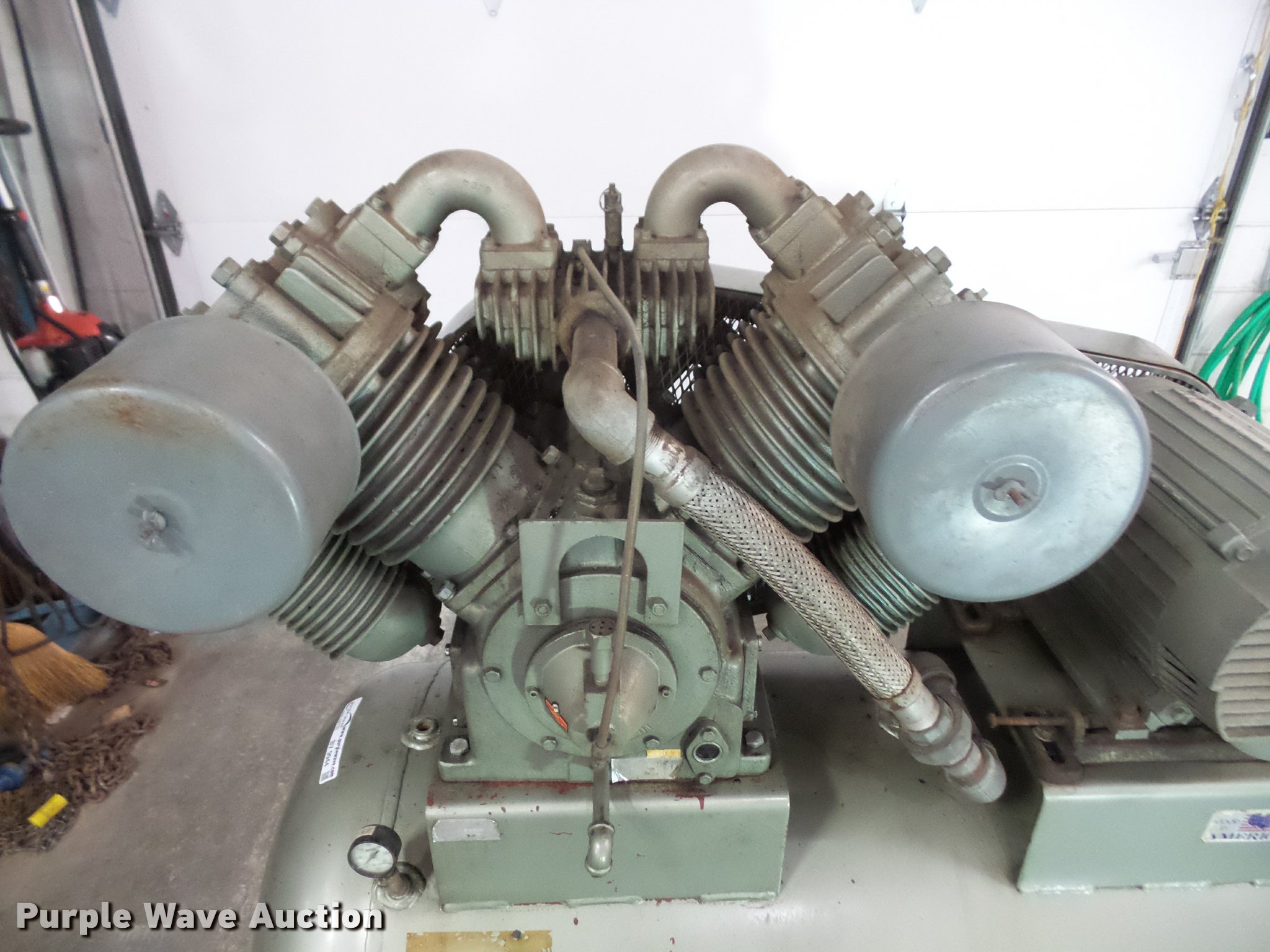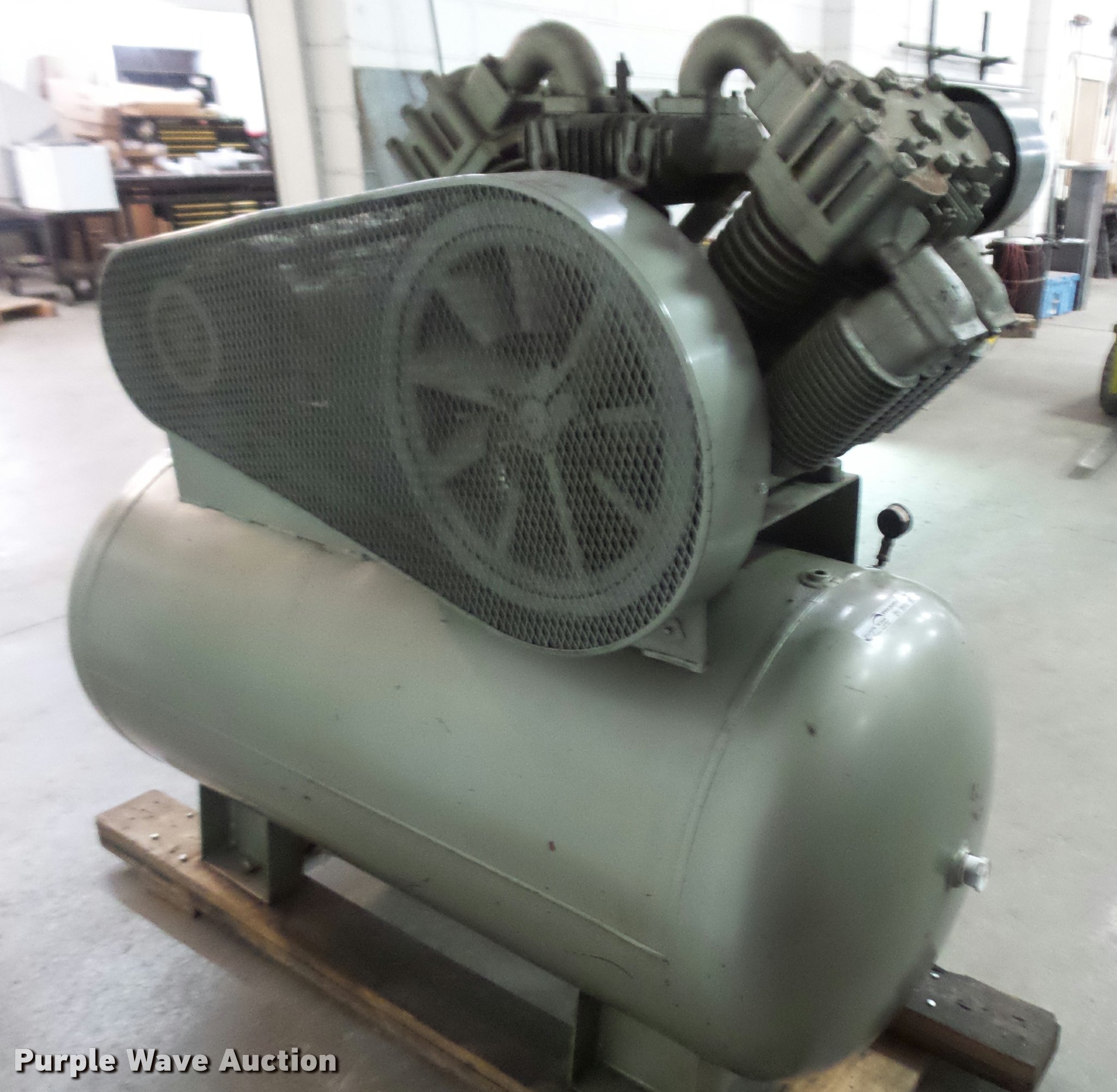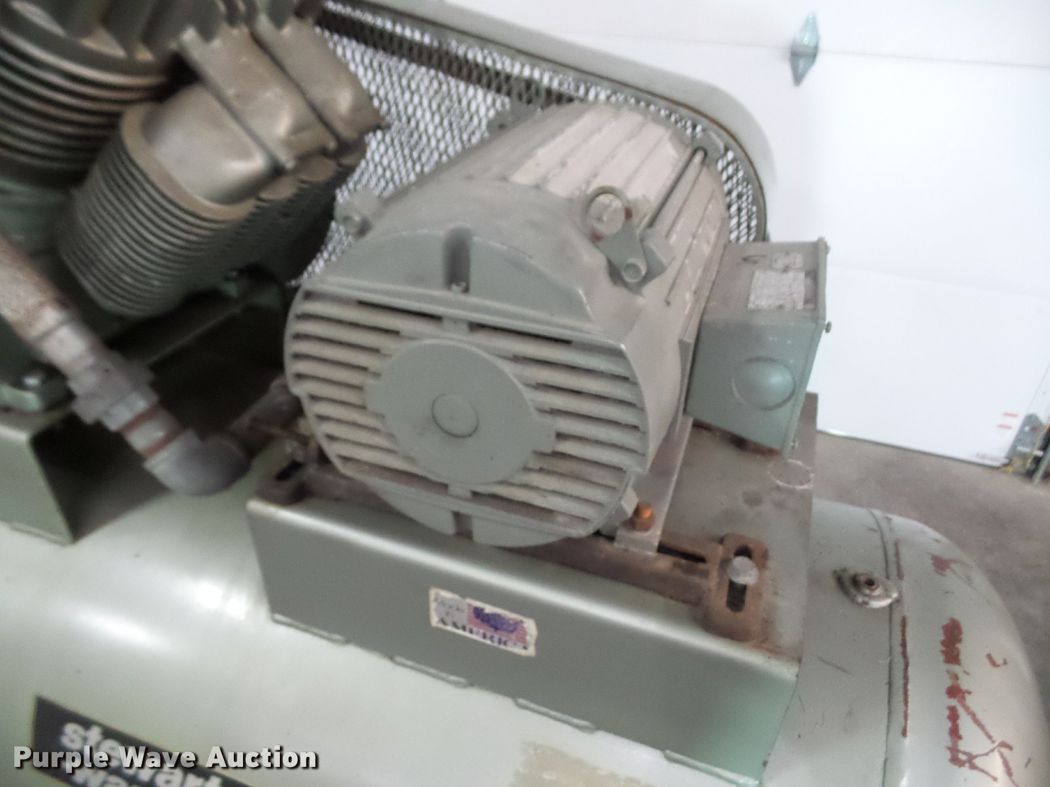Purple Wave is selling a used Air Compressor in Kansas. This item is a Stewart-Warner air compressor with the following: Model 46558, 20 HP, 208-230/460V, Three phase, 200 gallon, Compressor has a knock and needs repaired