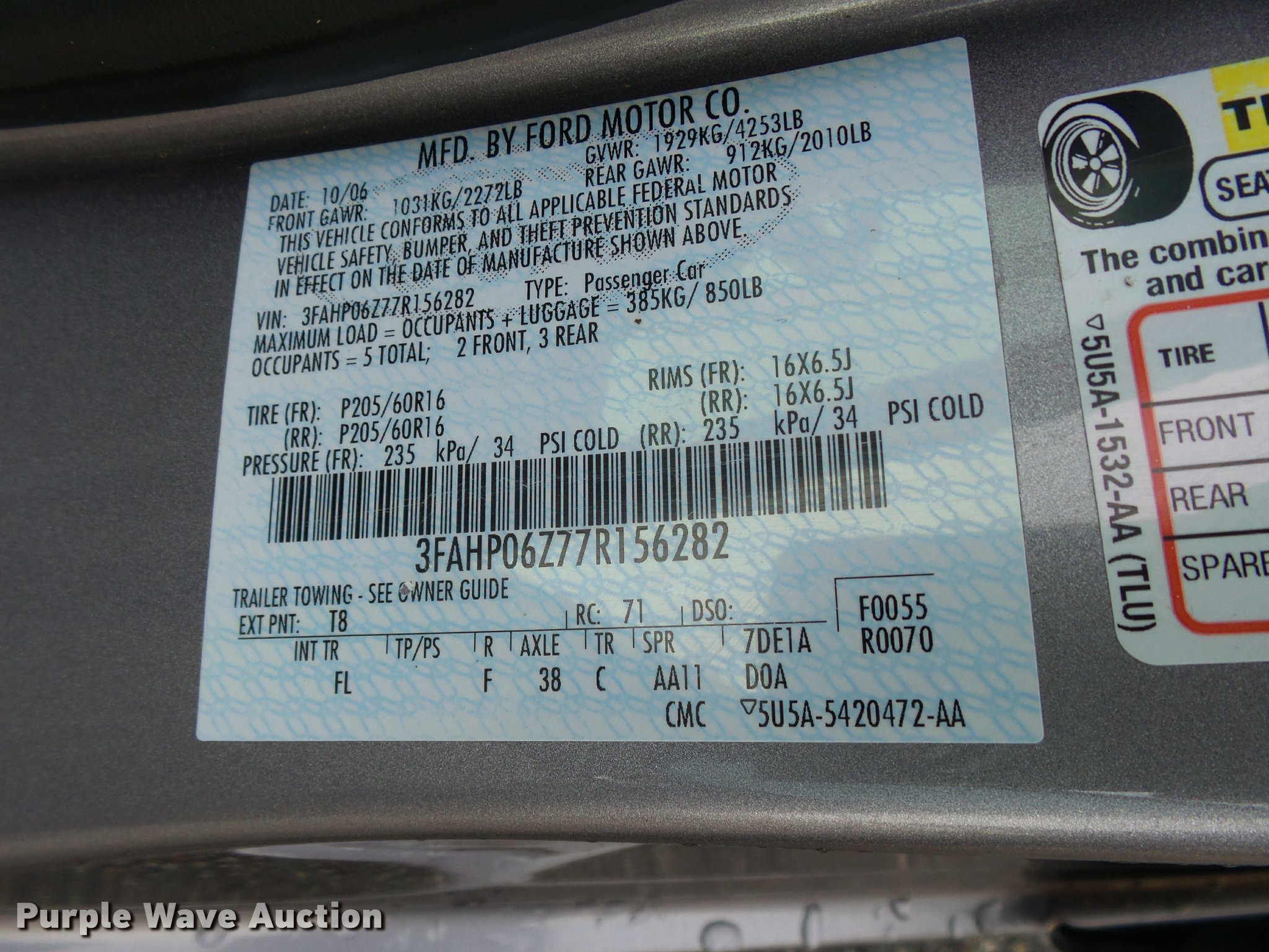 Purple Wave is selling a used Passenger Vehicle in Kansas. This item is a 2007 Ford Fusion with the following: 101,913 miles on odometer, 2.3L L4 DOHC 16V gas engine, Automatic transmission, AC and heat, Tilt, Cruise, AM/FM/CD, Power windows, locks, and mirrors, Cloth interior, 205/60R16 tires, Non-operational radio display, Hail damage