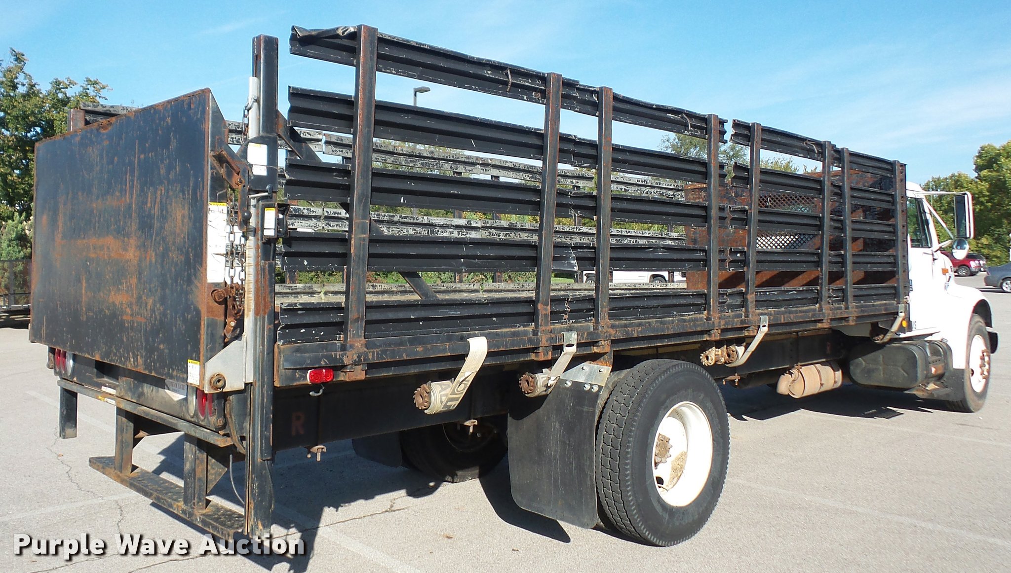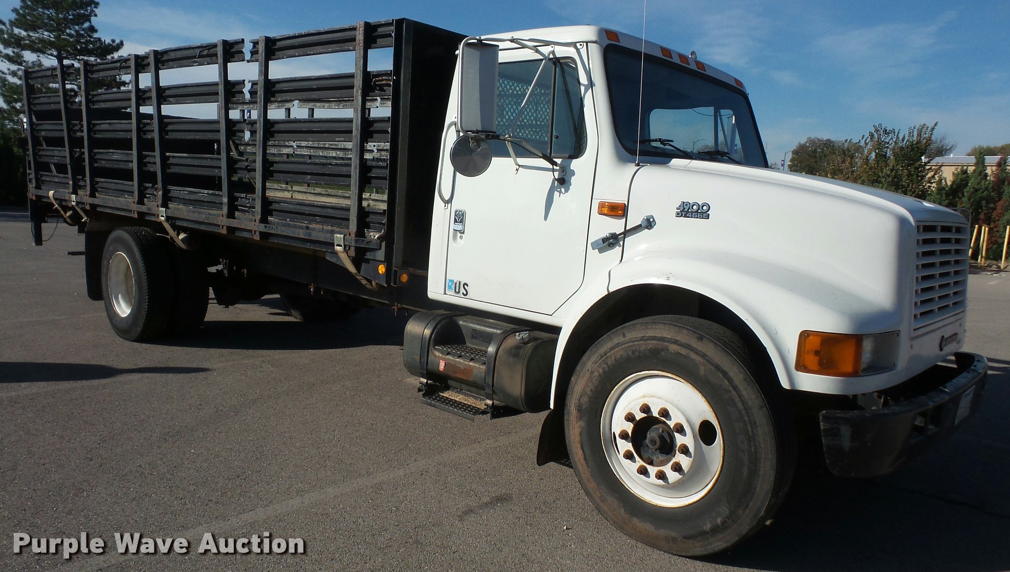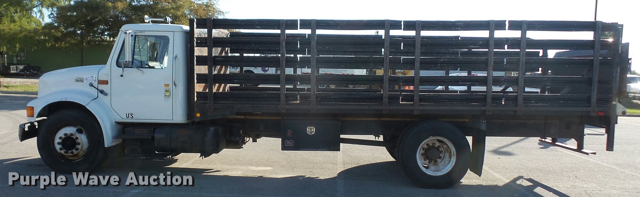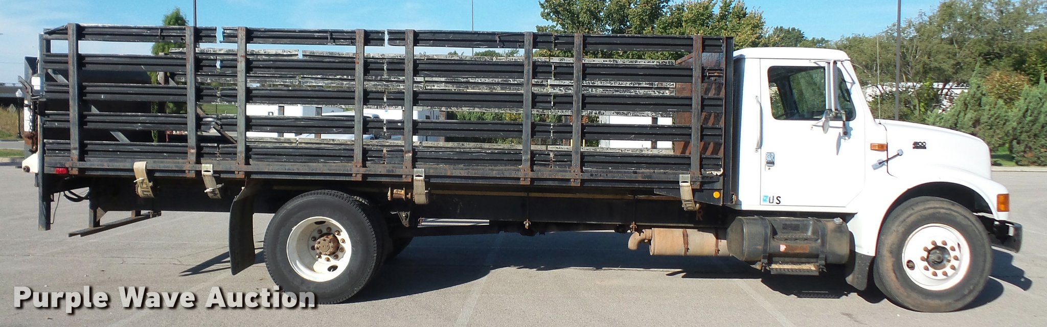 Purple Wave is selling a used Flat Bed Truck in Kansas. This item is a 2000 International 4900 flatbed truck with the following: 296,162 miles on odometer, International DT466 7.6L L6 turbo diesel engine, Eaton Fuller six speed manual transmission, Single axle, AC and heat, AM/FM, Air suspension seat, 21'L x 96"W flatbed, Steel floor, Stake side pockets, 48" removable side boards, Headache rack, (5) ratchet tie-down straps, One strap missing, Toolbox, Tommy gate end lift gate, 1,600 lbs maximum lift capacity,, Dual fuel tanks, Spring suspension, Air brakes, 11R22.5 tires