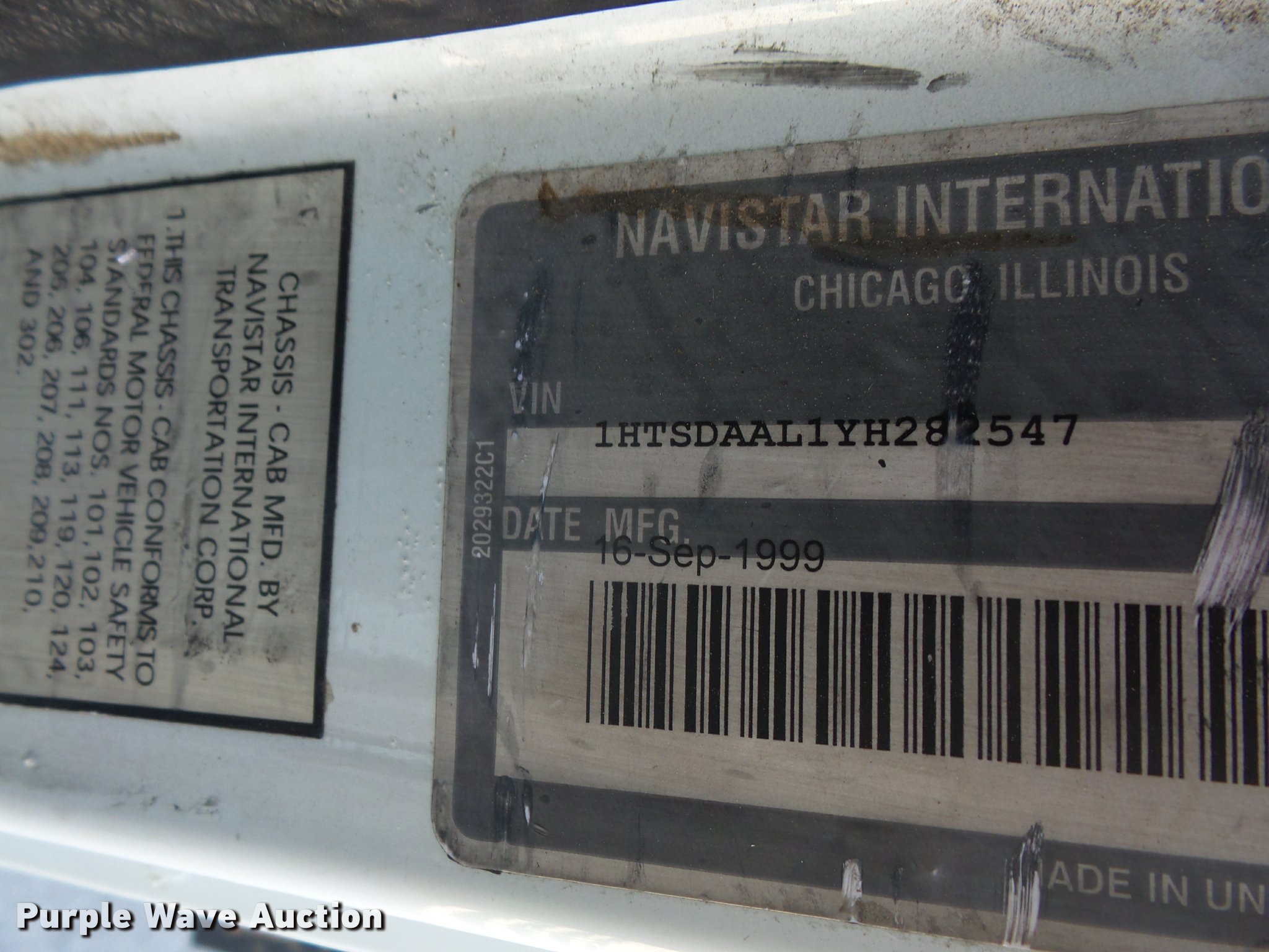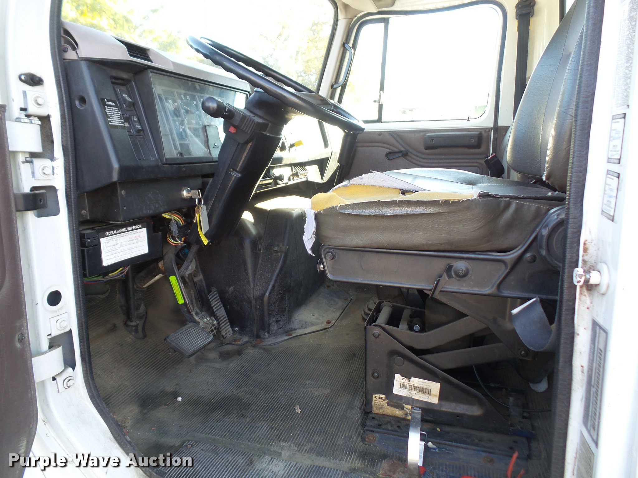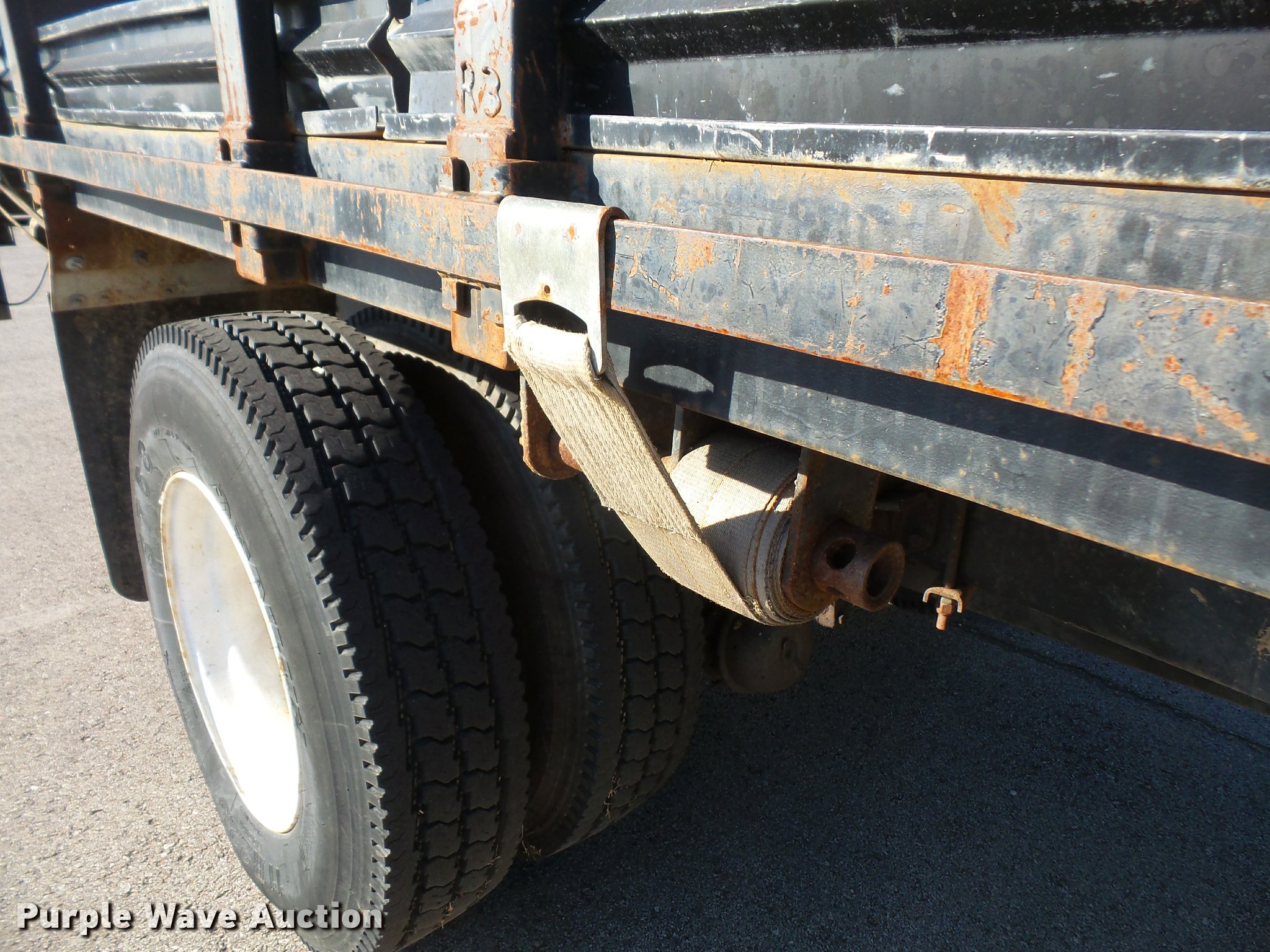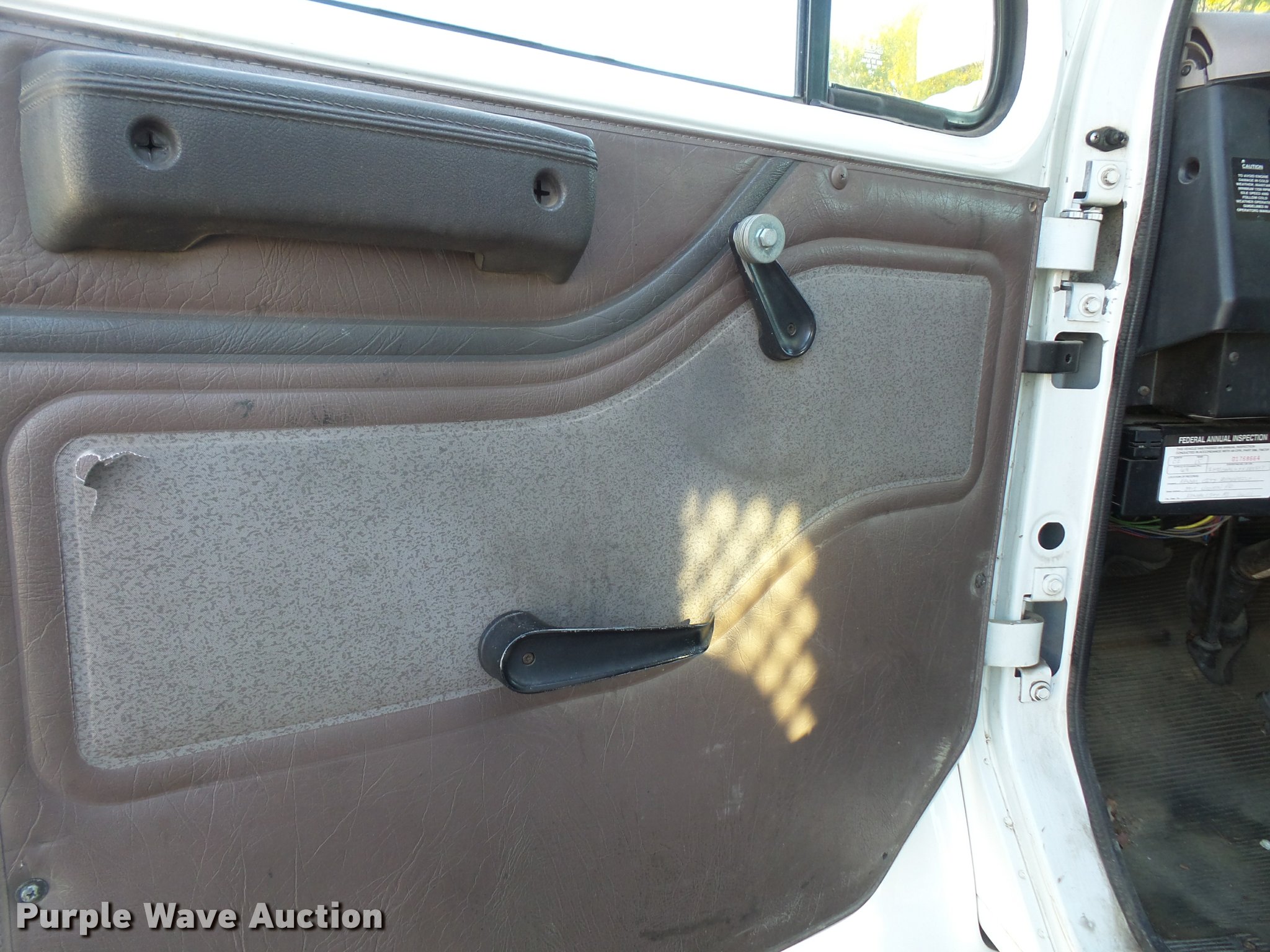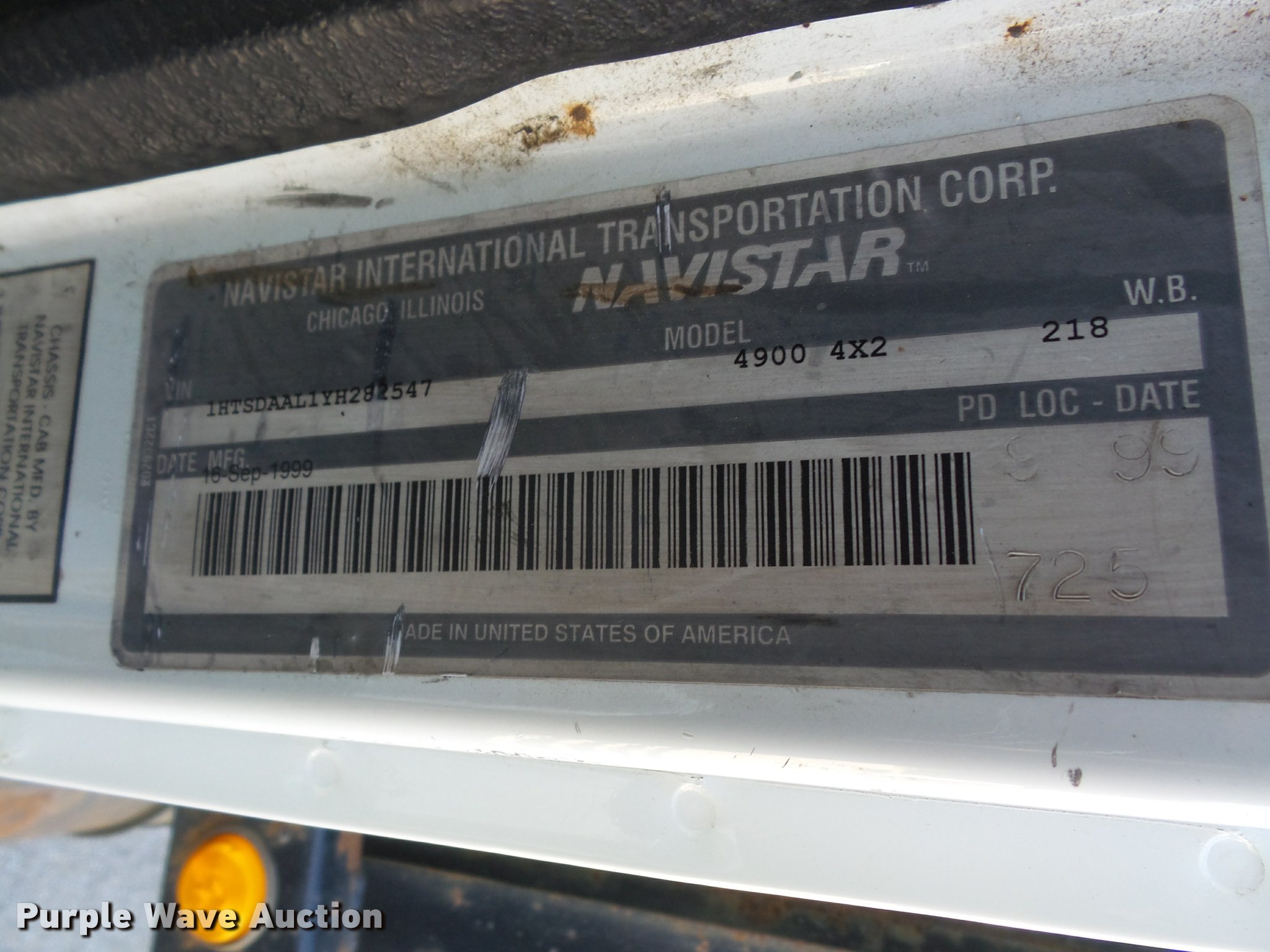Purple Wave is selling a used Flat Bed Truck in Kansas. This item is a 2000 International 4900 flatbed truck with the following: 296,162 miles on odometer, International DT466 7.6L L6 turbo diesel engine, Eaton Fuller six speed manual transmission, Single axle, AC and heat, AM/FM, Air suspension seat, 21'L x 96"W flatbed, Steel floor, Stake side pockets, 48" removable side boards, Headache rack, (5) ratchet tie-down straps, One strap missing, Toolbox, Tommy gate end lift gate, 1,600 lbs maximum lift capacity,, Dual fuel tanks, Spring suspension, Air brakes, 11R22.5 tires