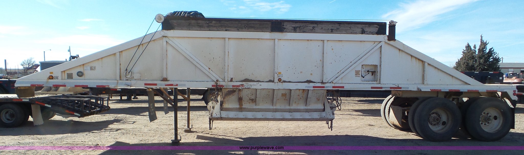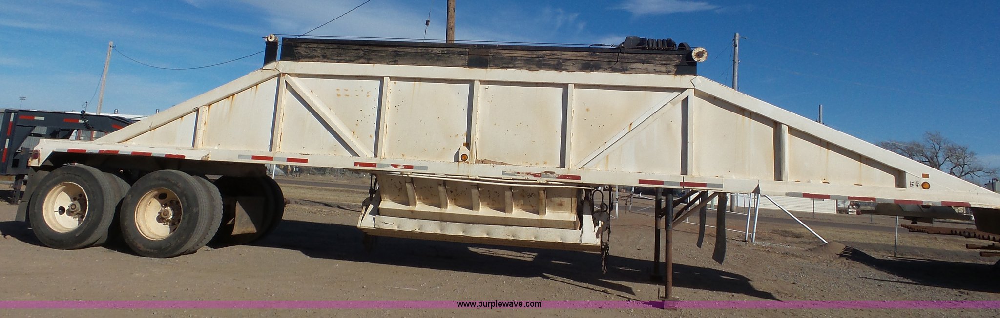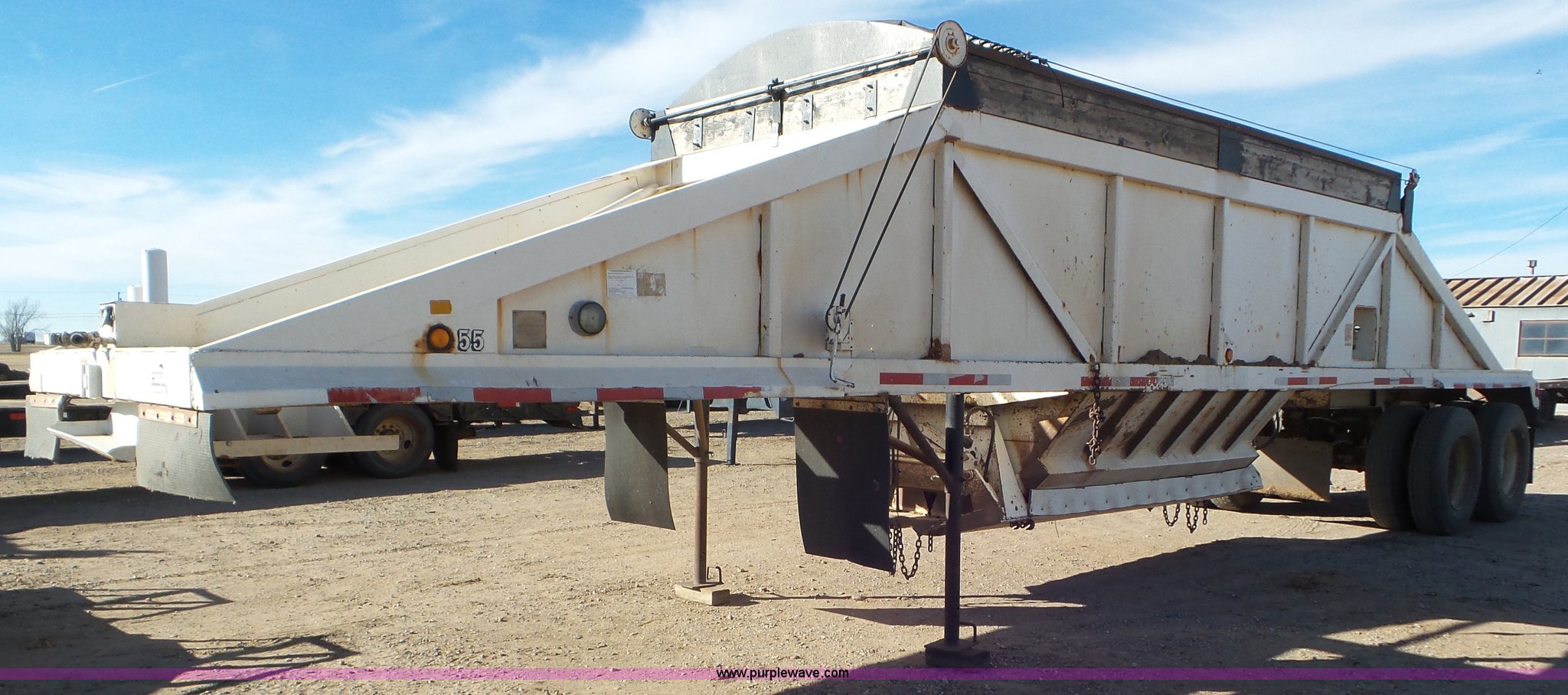 1985 Ranch bottom dump trailer. 38' overall length, 56" side height, Steel construction, Air operated clamshell gate, Trailer controls, Manual tarp, Dual leg landing gear, Fifth wheel plate, Tandem axle, Spring suspension, Air brakes, 11R24.5 tires, GVWR 80,000 lbs, GAWR 20,000 lbs, Unit# 55. Kansas title. Title distribution may be delayed up to 30 days from verification of funds. 1R9BSD503FL008356. Gilmore's Roustabout Service. 1910 W 3rd St. Liberal, KS 67905