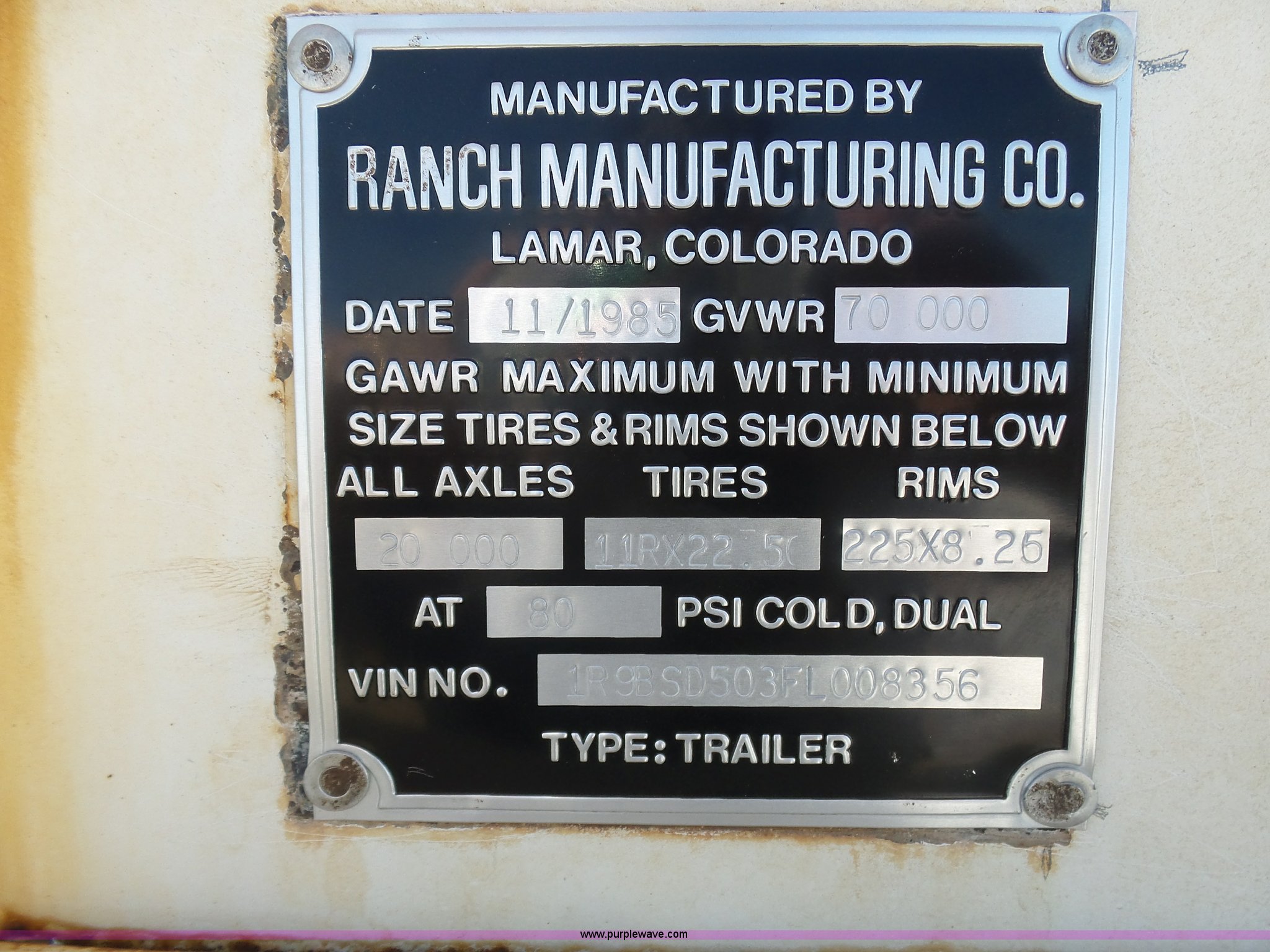 Purple Wave is selling a used Bottom Dump Trailer in Kansas. This item is a 1985 Ranch bottom dump trailer with the following: 38' overall length, 56" side height, Steel construction, Air operated clamshell gate, Trailer controls, Manual tarp, Dual leg landing gear, Fifth wheel plate, Tandem axle, Spring suspension, Air brakes, 11R24.5 tires, GVWR 80,000 lbs, GAWR 20,000 lbs, Unit# 55