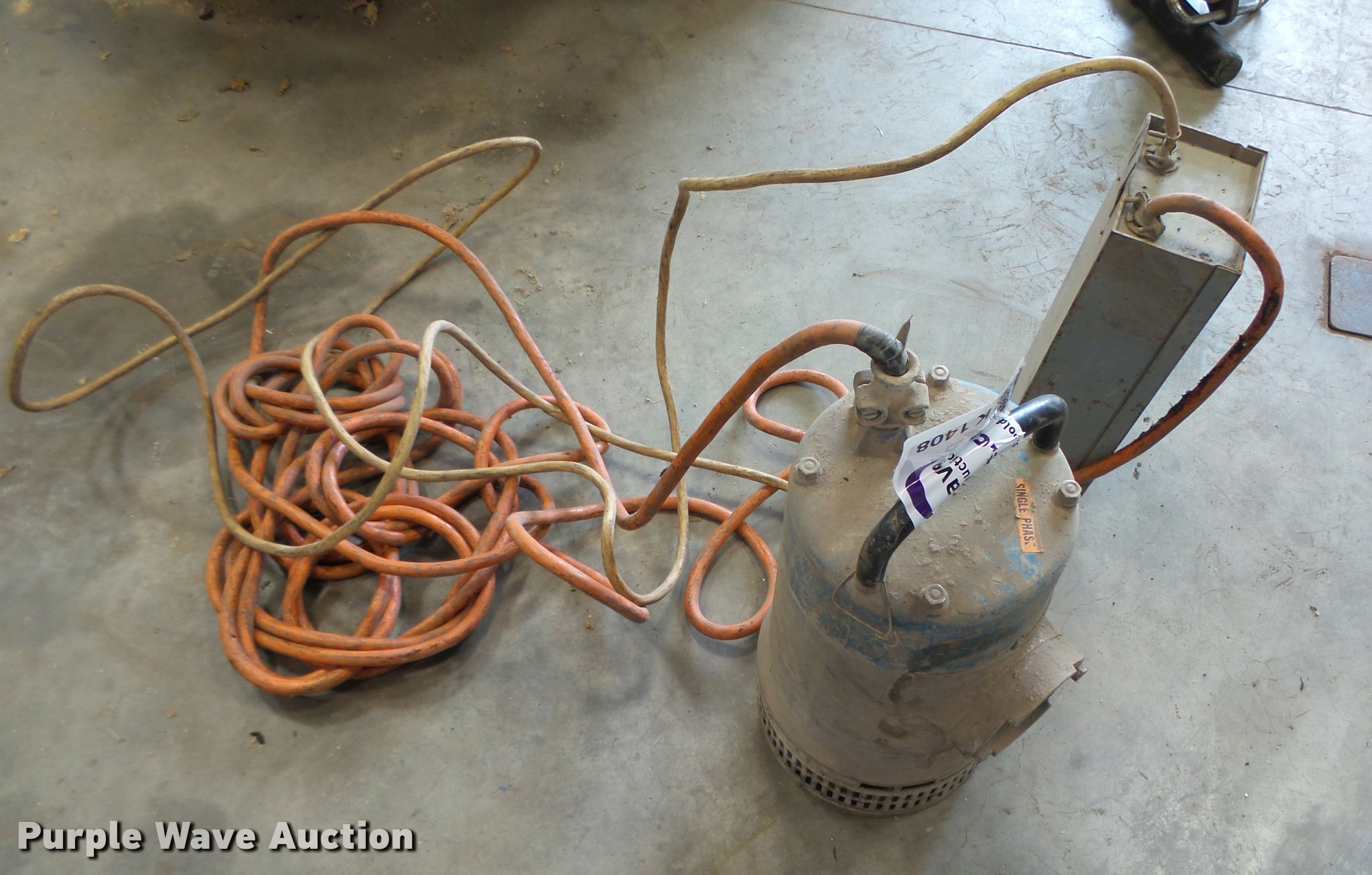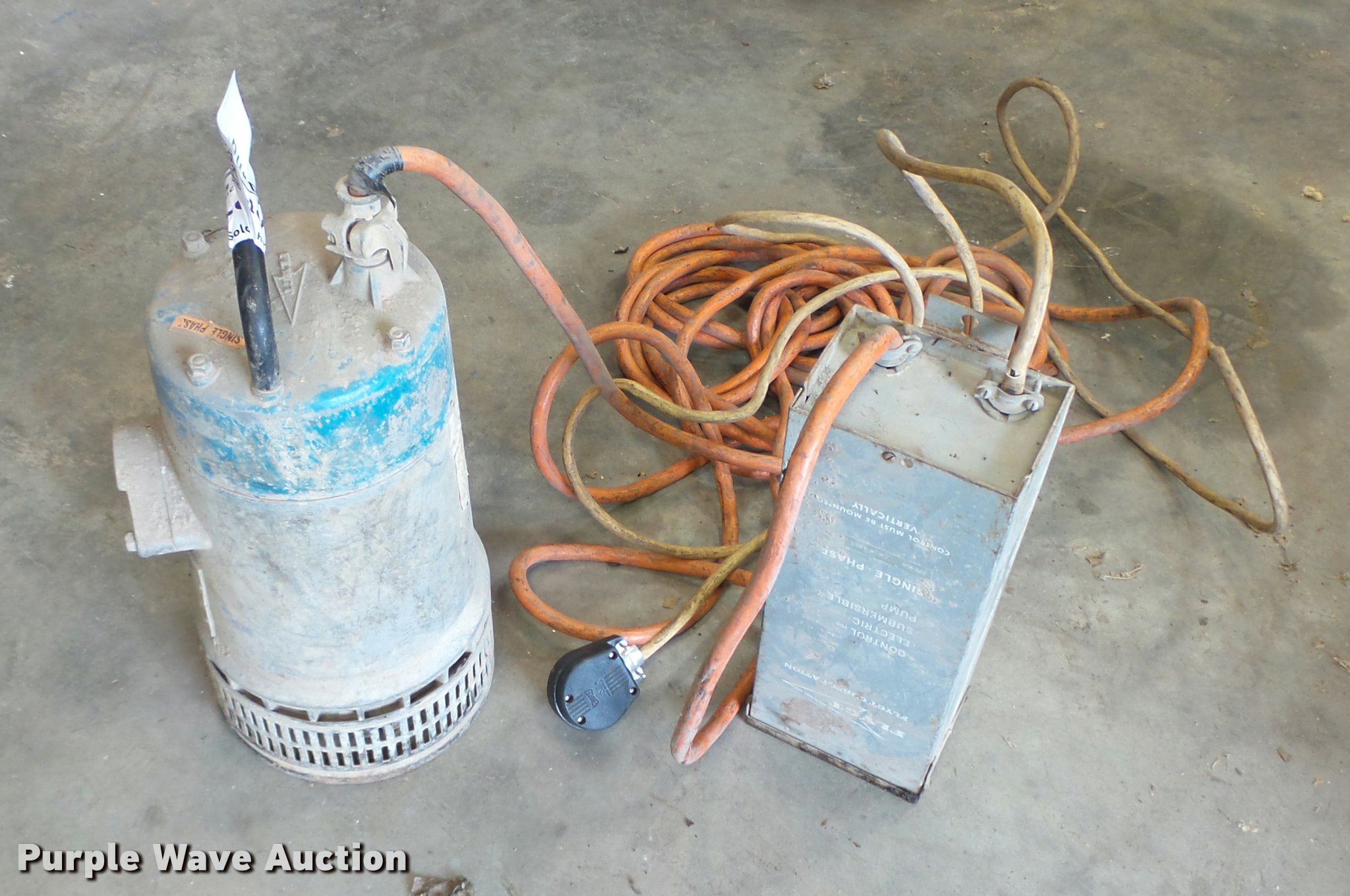 Purple Wave is selling a used Pump in Iowa. This item is a Flygt B2066 submersible water pump with the following: Electric operation, 220V, 60 Hz, Single phase, Controller box, Cord