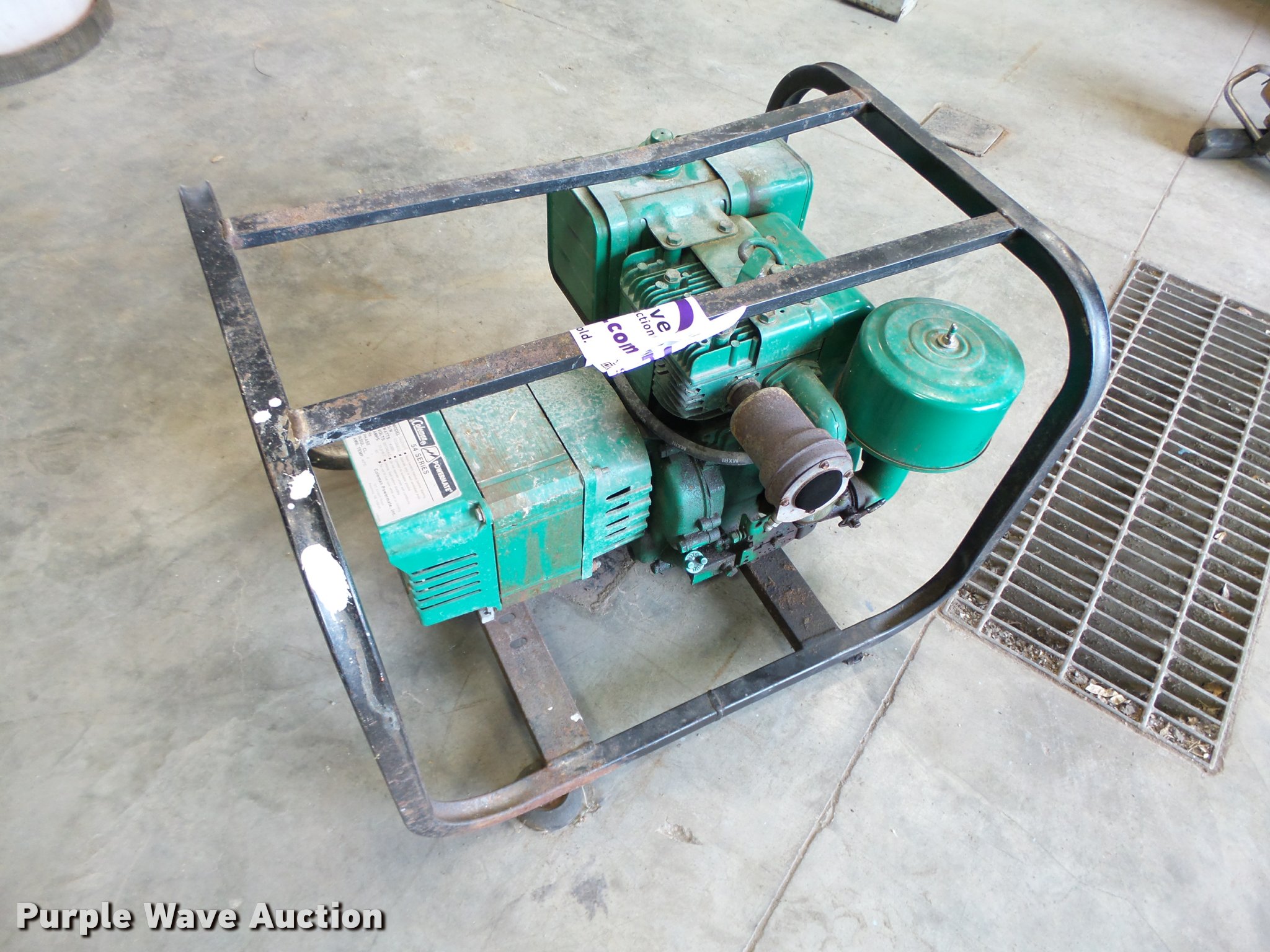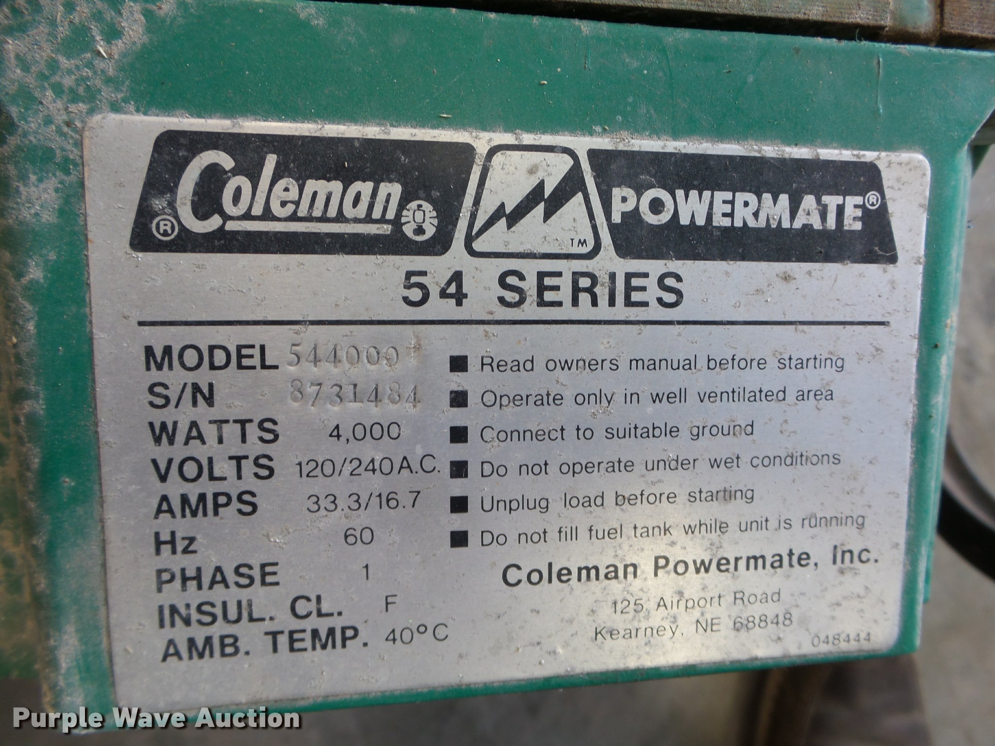 Purple Wave is selling a used Generator Set in Iowa. This item is a Coleman 544000 generator with the following: Briggs & Stratton gas engine, 8 HP, 4,000 watts, Single phase, 120/240V, Serial 87331481