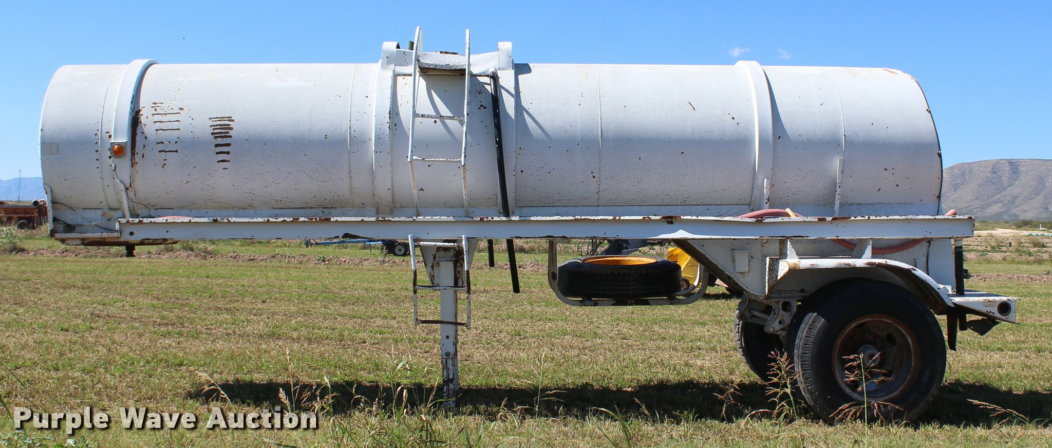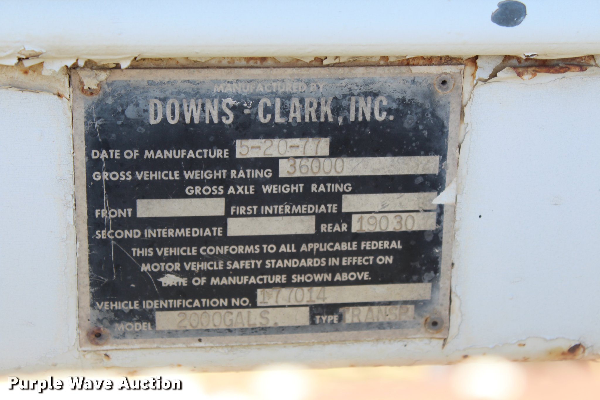 Purple Wave is selling a used Tank Trailer in New Mexico. This item is a 1977 Downs-Clark tank trailer with the following: Steel tank, 2,000 gallon capacity, Single compartment, 18"W manway, Dual leg landing gear, Fifth wheel plate, Single axle, 10-22 tires, Unknown operating condition, Rust