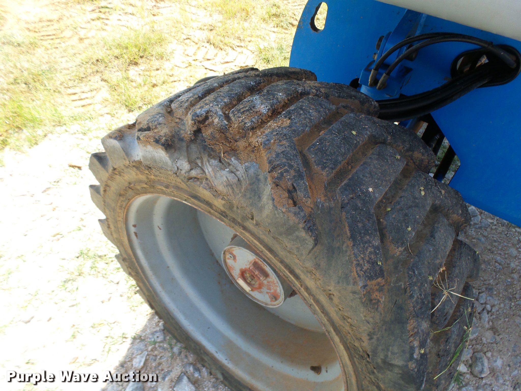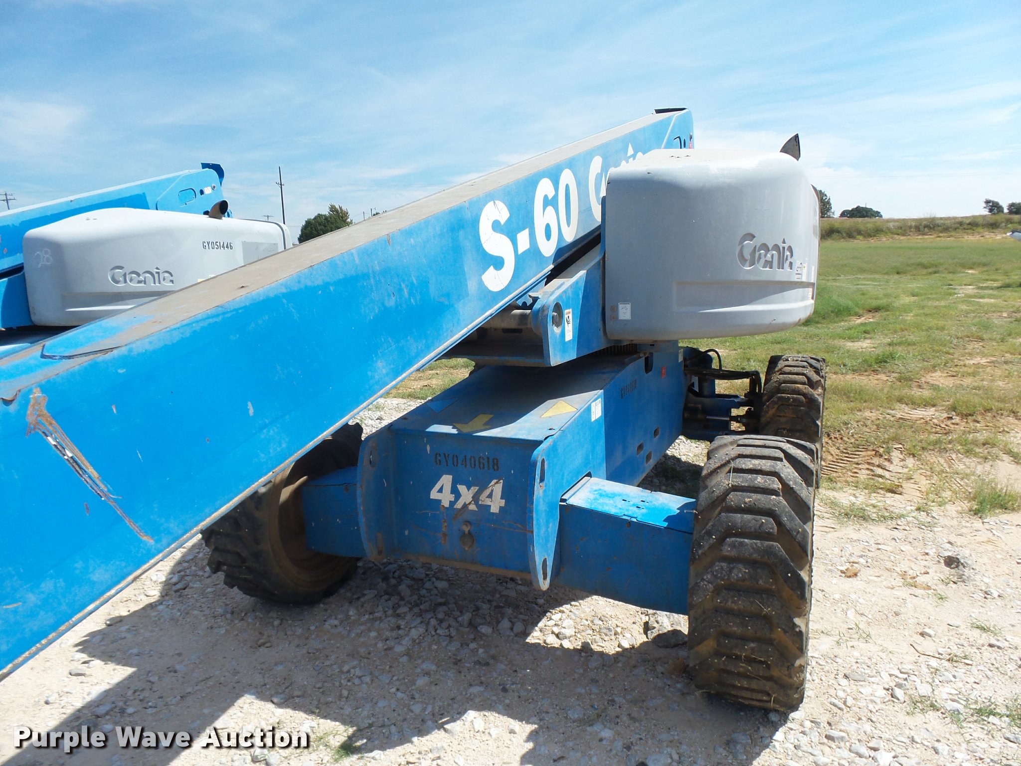 2004 Genie S60 boom lift. 7,077 hours on meter, Deutz three cylinder diesel engine, Hydrostatic transmission, Four wheel drive, 500 lbs maximum lift capacity, Approximately 66' maximum reach, 360 degree turn table, Platform and ground controls, 355/55D625 tires, Serial S6004-10123. CMB Services LLC.. Chester, OK 73838