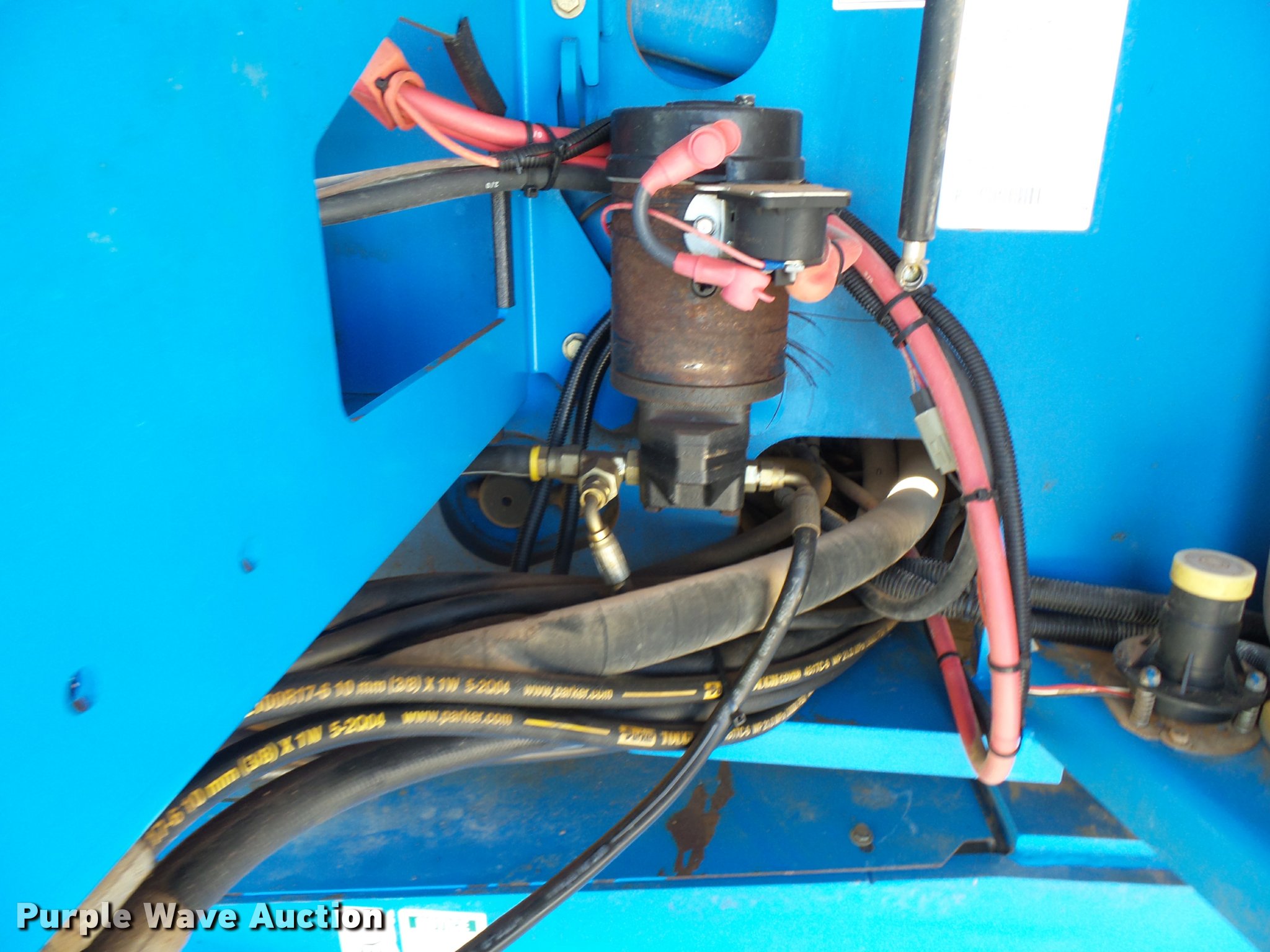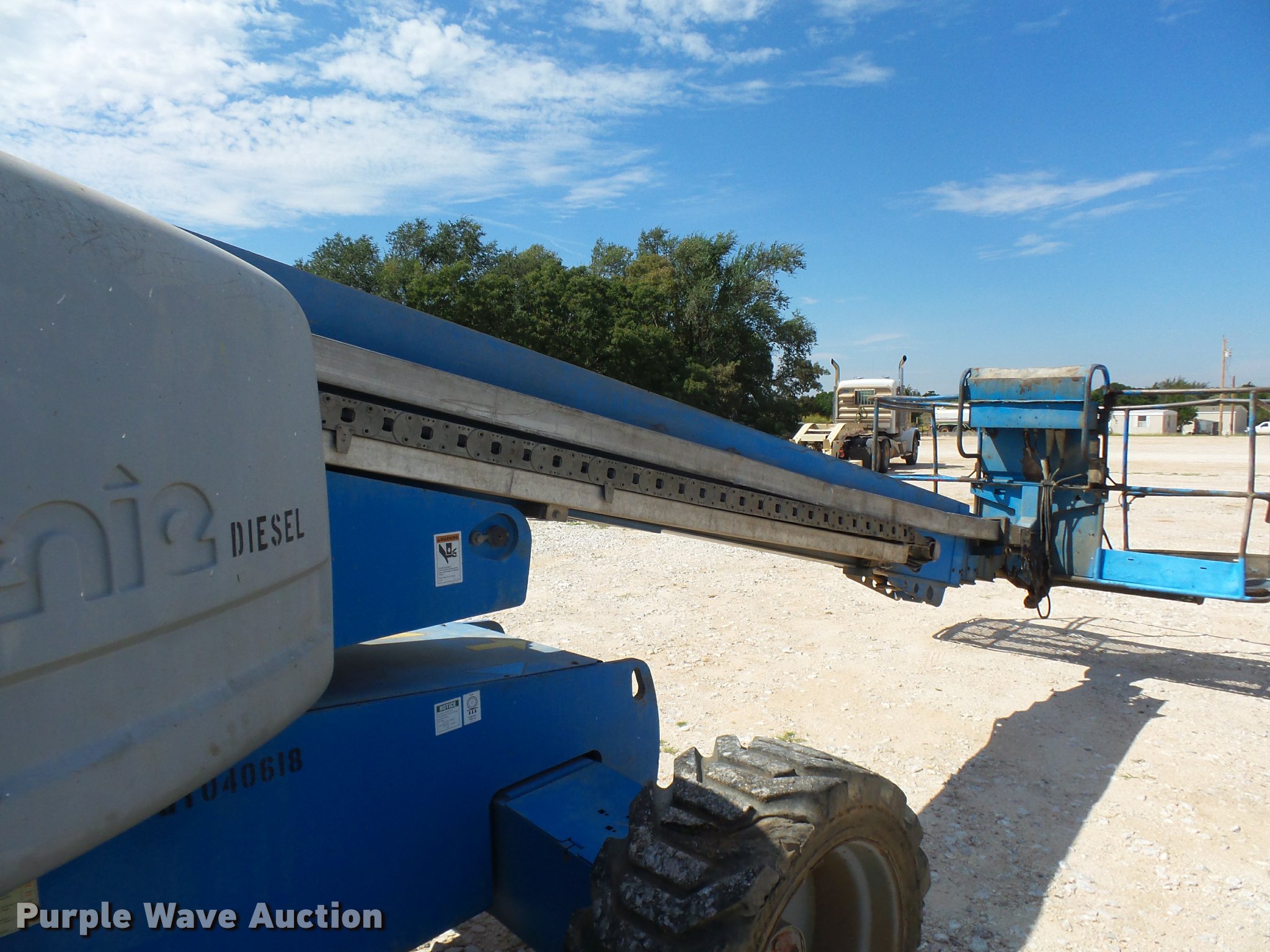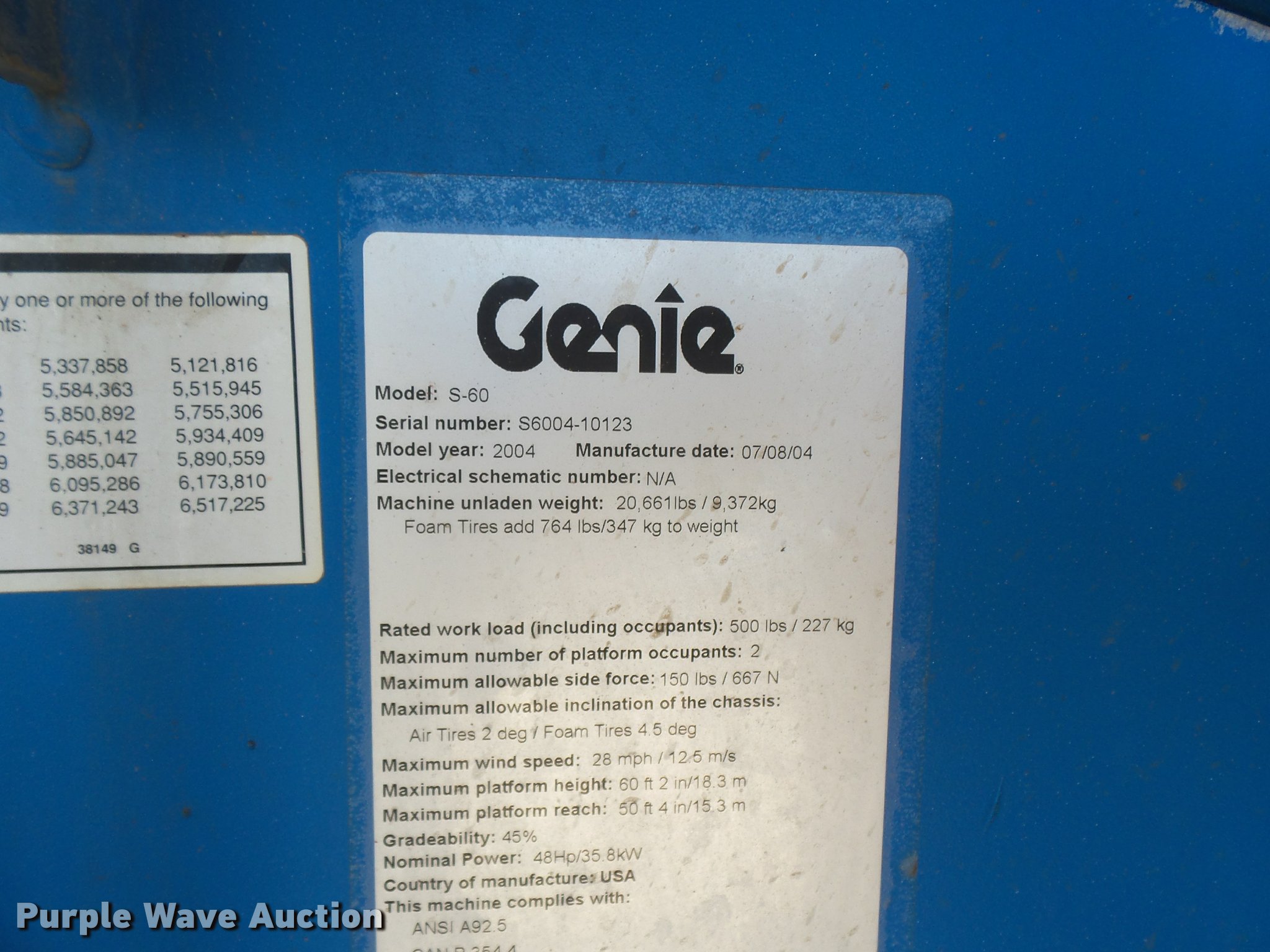 Purple Wave is selling a used Boom Lift in Oklahoma. This item is a 2004 Genie S60 boom lift with the following: 7,077 hours on meter, Deutz three cylinder diesel engine, Hydrostatic transmission, Four wheel drive, 500 lbs maximum lift capacity, Approximately 66' maximum reach, 360 degree turn table, Platform and ground controls, 355/55D625 tires, Serial S6004-10123