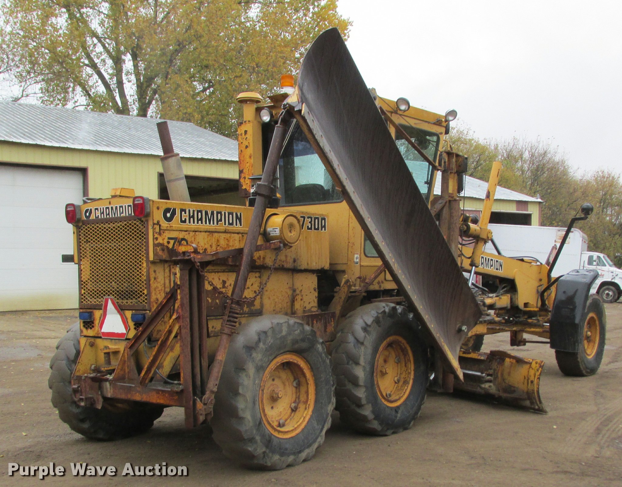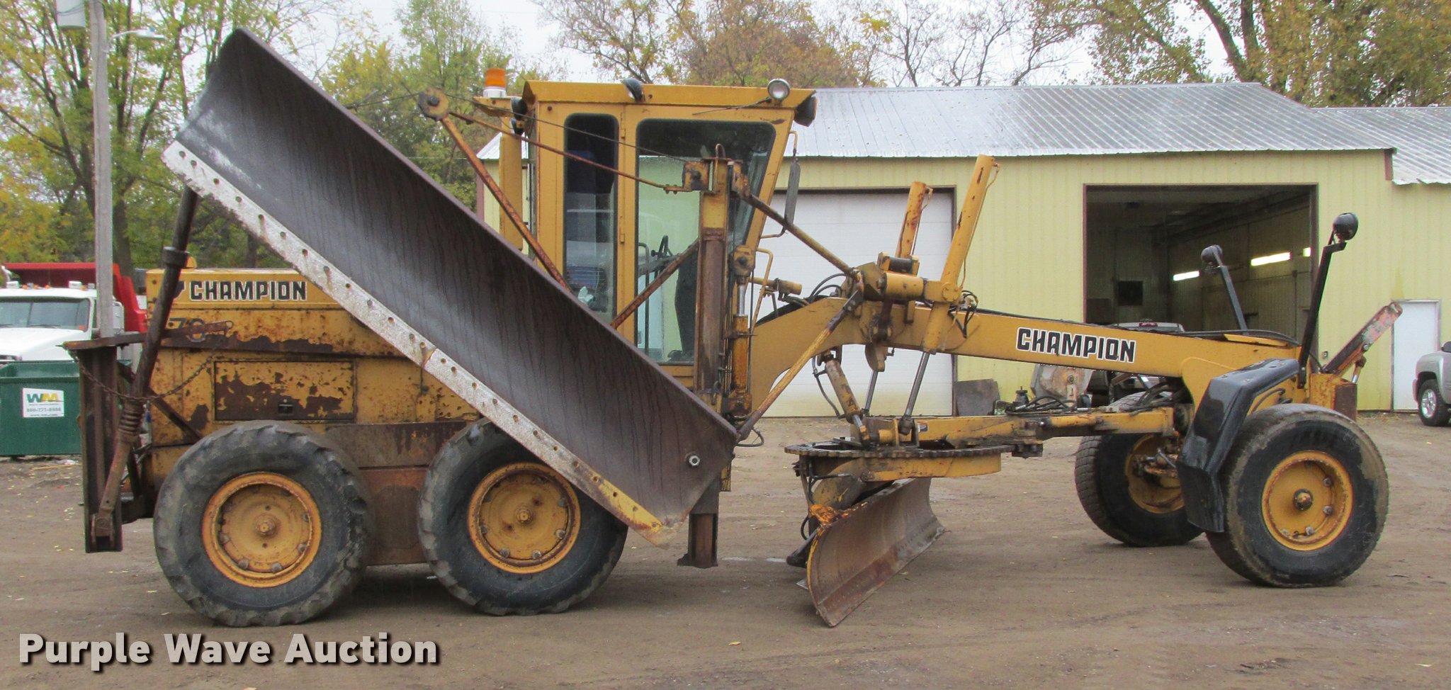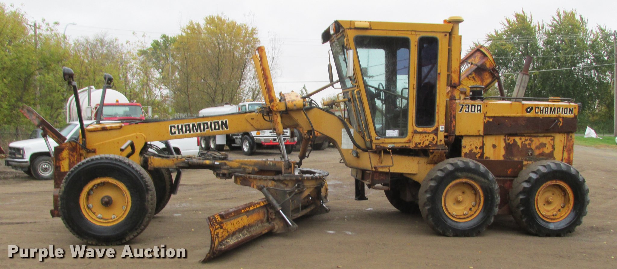 Purple Wave is selling a used Motor Grader in Minnesota. This item is a 1989 Champion 730A motor grader with the following: 986 hours on meter, Cummins six cylinder diesel engine, Powershift transmission, 8F-4R gears, EROPS, AC and heat, Suspension seat, Nine control valves, Front and rear work lights, 16'W moldboard, Right blade extension, Tip control, Side shift, Falls front mounted lift group, 12' snow wing, 14.00-24 tires, Non-operational AC, Glass cracked, Serial 730A-177-474-19828-89
