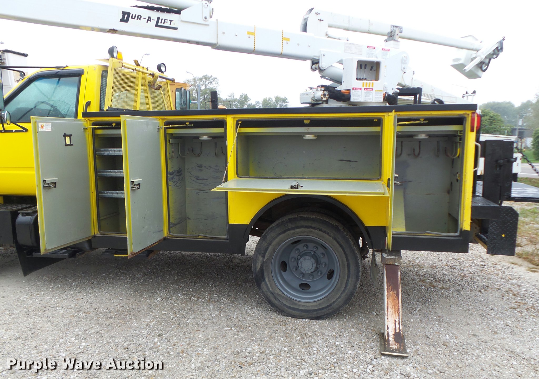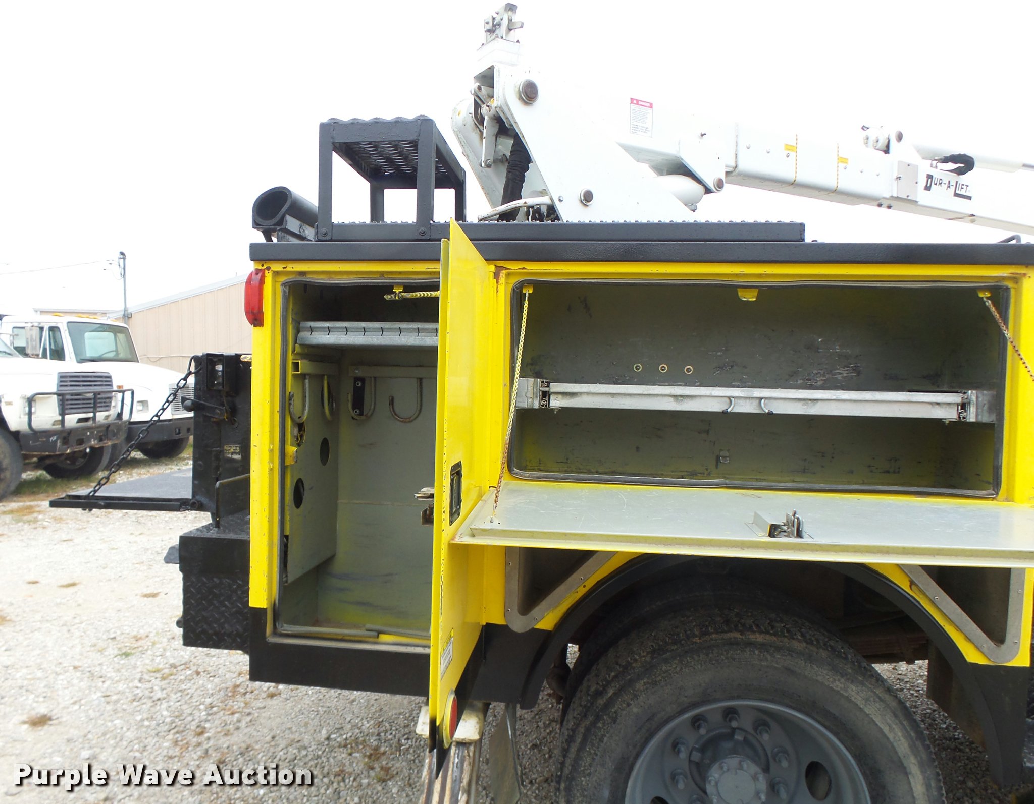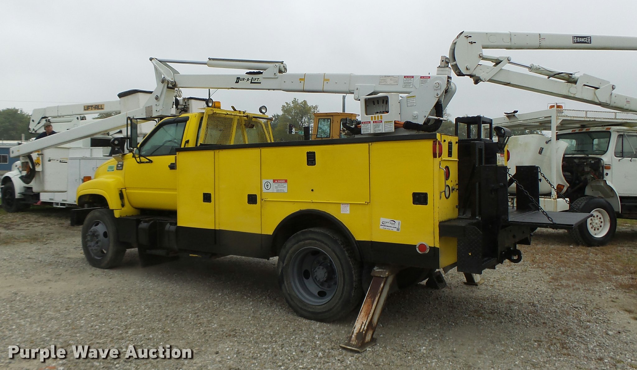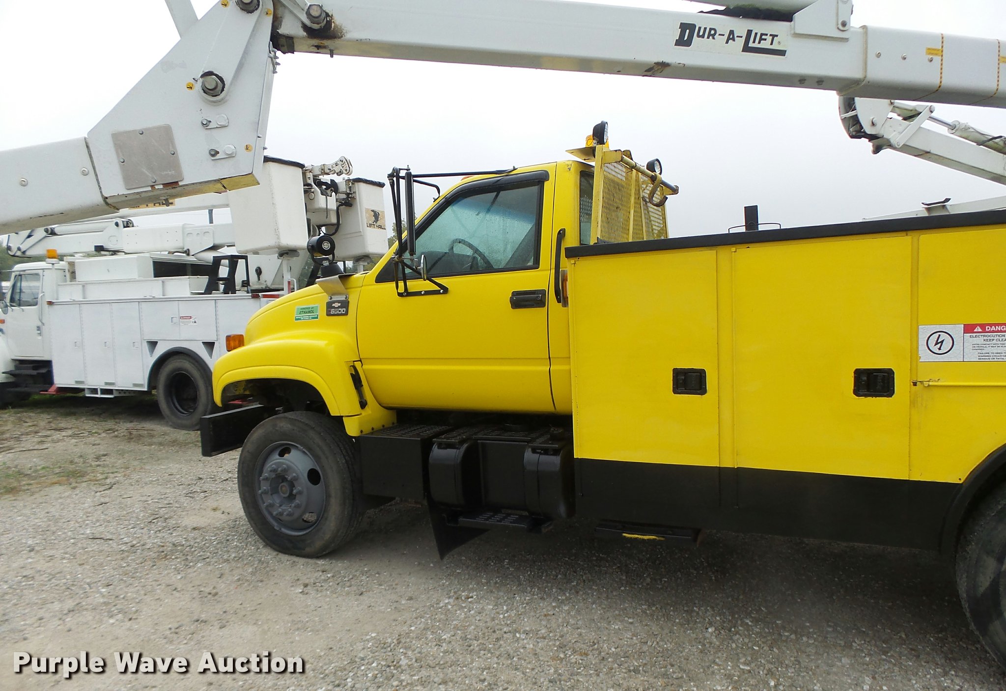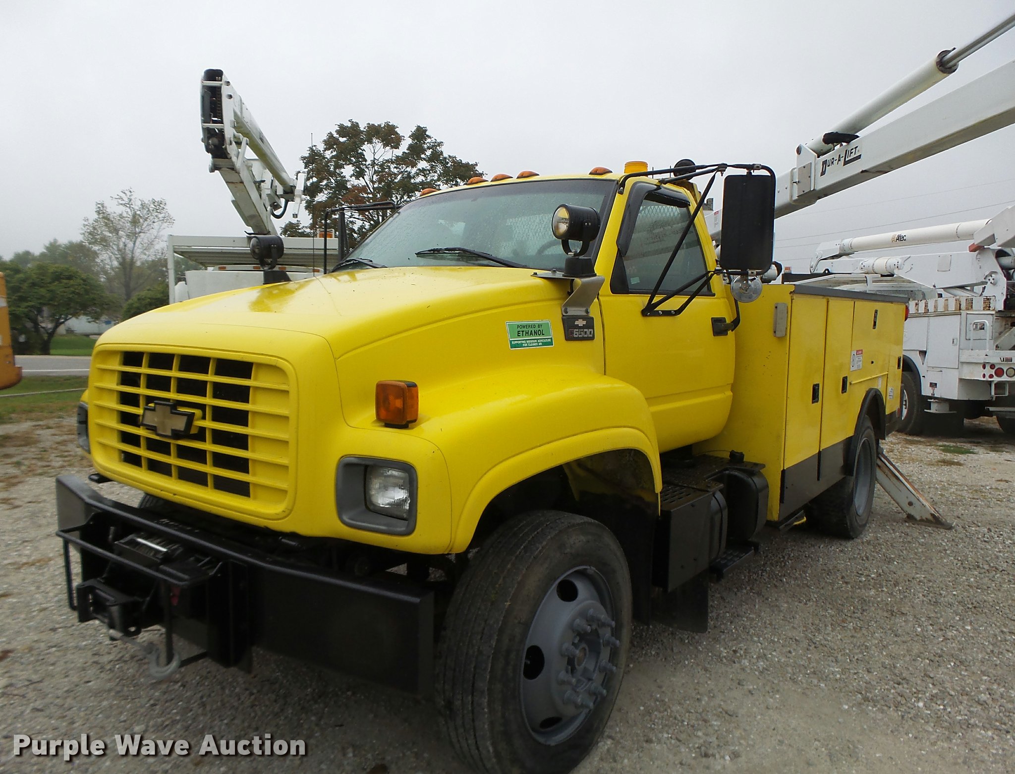 Purple Wave is selling a used Bucket Truck in Missouri. This item is a 2001 Chevrolet C6500 bucket truck with the following: 166,164 miles on odometer, 8.1L V8 gas engine, Automatic transmission, Single axle, AC and heat, AM/FM, Beacon light, PTO, Reading ZAT132ADW service bed, 11'L, Shelving, Slide-out drawers, Compartment lights, Work lights, Serial B448265, Pintle hitch, Trailer wiring, Winch, Remote, Duralift D0-36 boom, Serial A5252, 350 lbs maximum lift capacity, 41' maximum lift height, Man basket, Ground and platform controls, Boom rotation, Outriggers, Dual fuel tanks, Spring suspension, Hydraulic brakes, 255/70R22.5 front tires, 265/75R22.5 rear tires