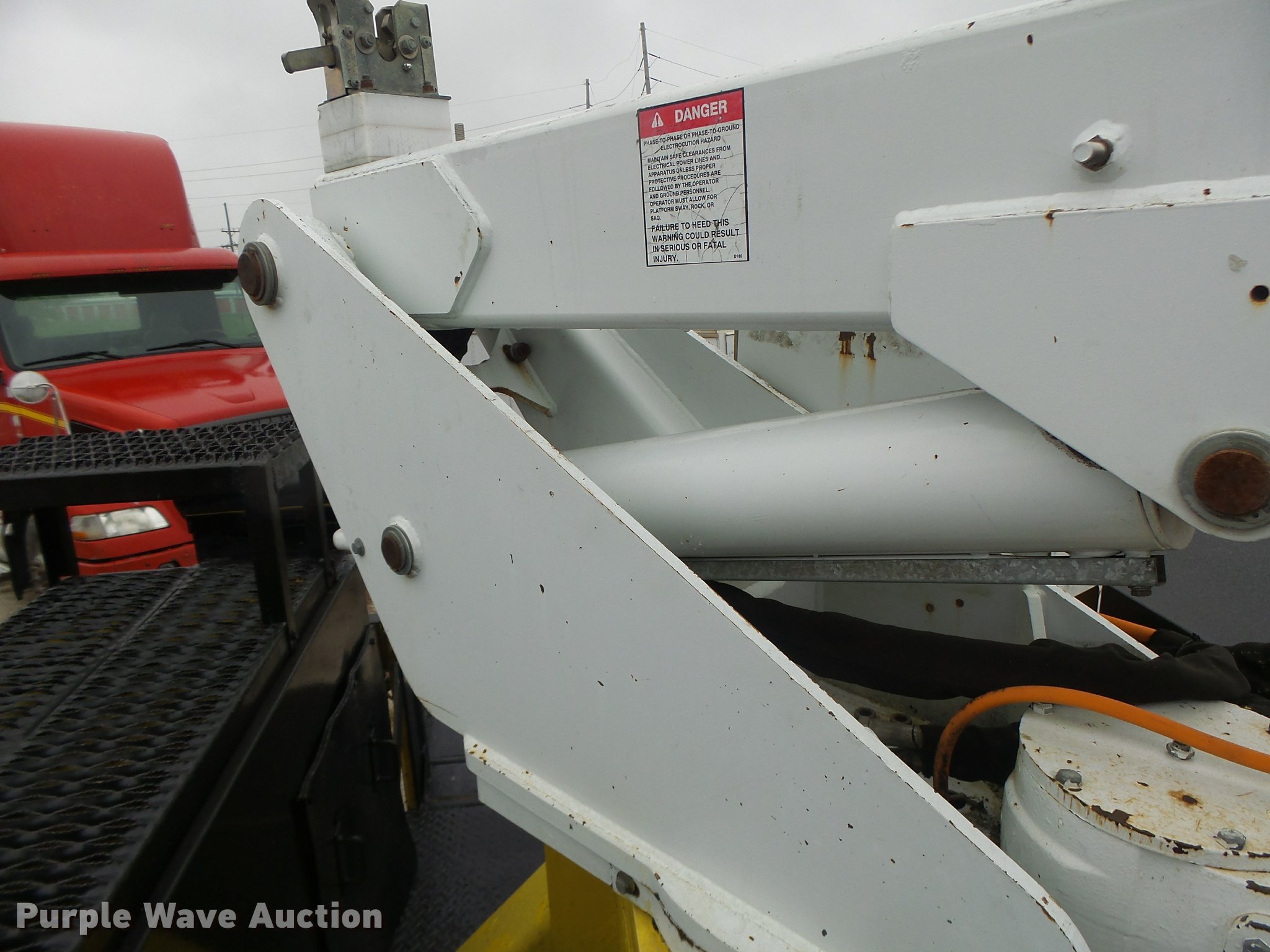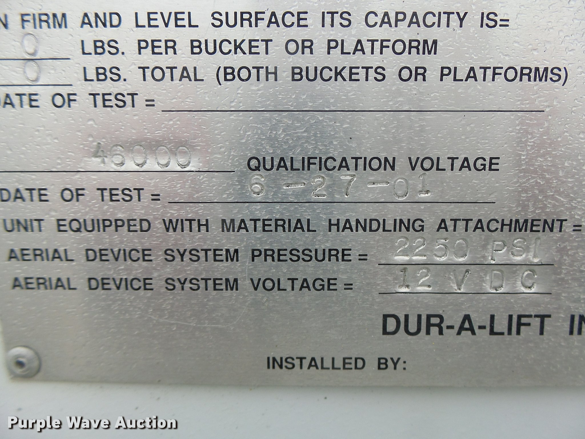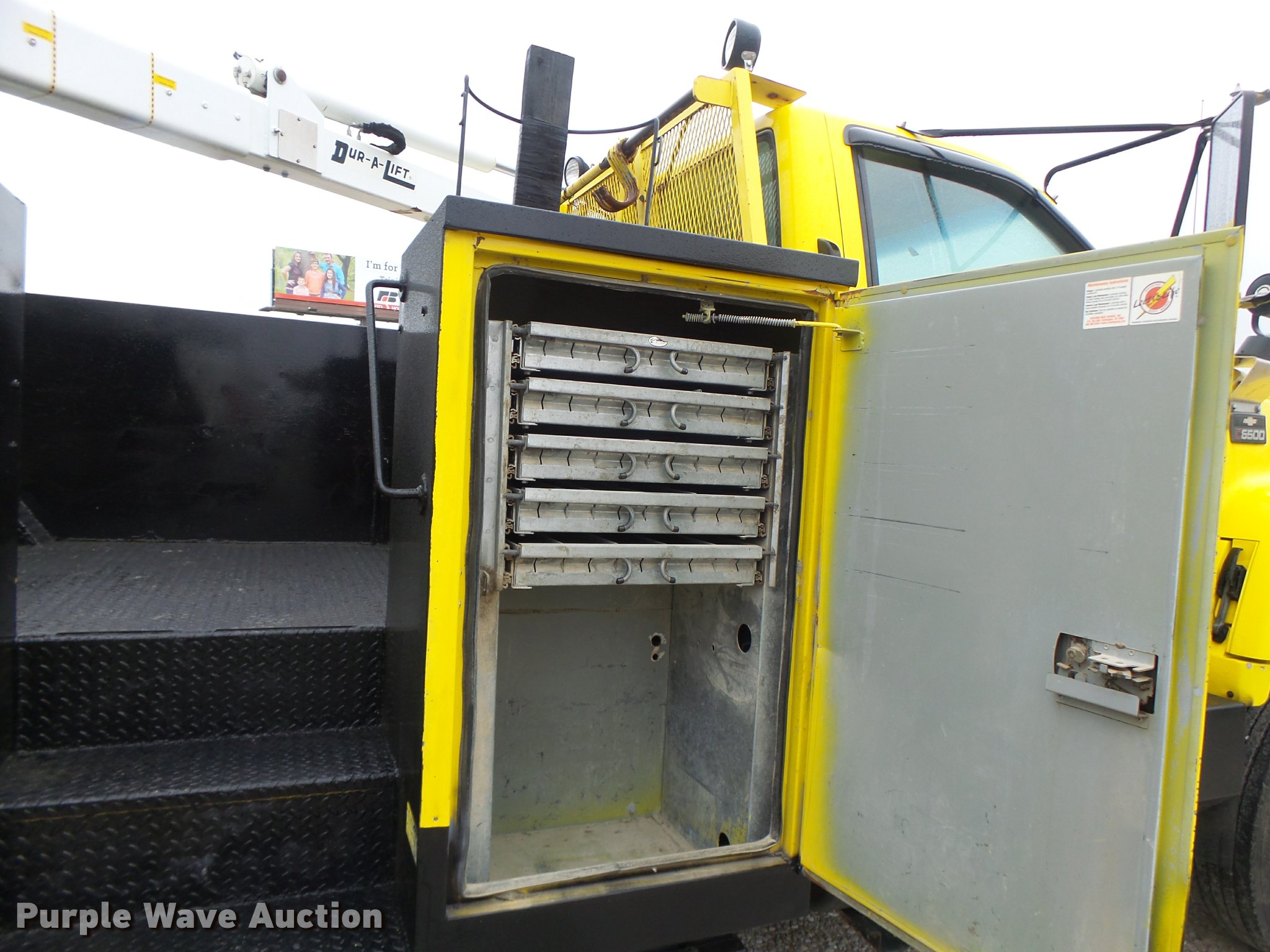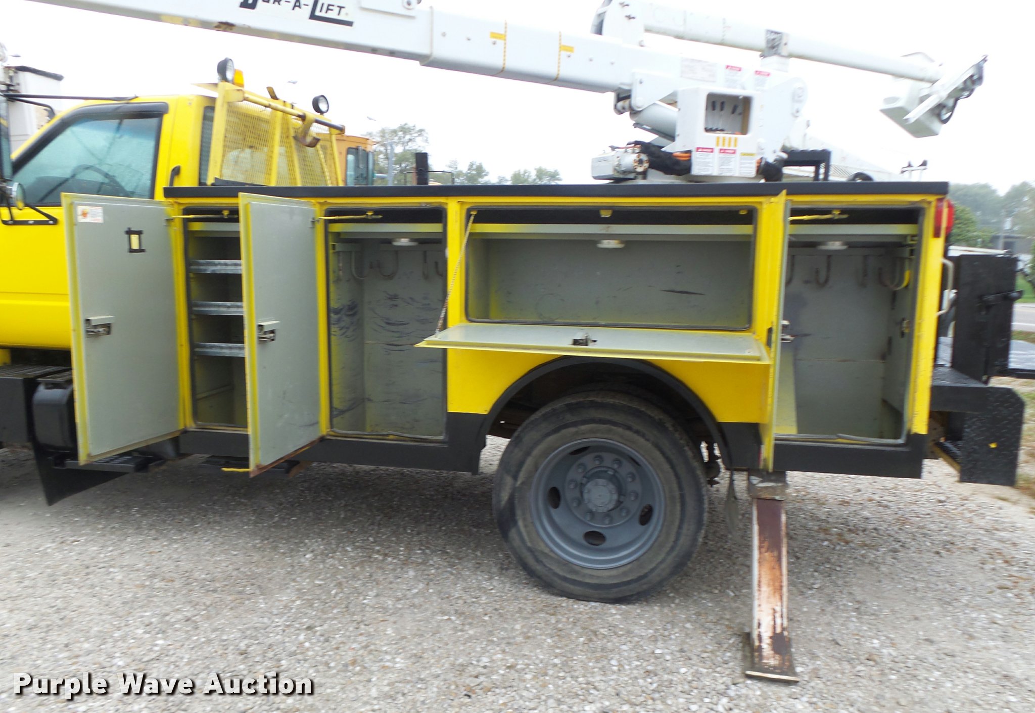 Purple Wave is selling a used Bucket Truck in Missouri. This item is a 2001 Chevrolet C6500 bucket truck with the following: 166,164 miles on odometer, 8.1L V8 gas engine, Automatic transmission, Single axle, AC and heat, AM/FM, Beacon light, PTO, Reading ZAT132ADW service bed, 11'L, Shelving, Slide-out drawers, Compartment lights, Work lights, Serial B448265, Pintle hitch, Trailer wiring, Winch, Remote, Duralift D0-36 boom, Serial A5252, 350 lbs maximum lift capacity, 41' maximum lift height, Man basket, Ground and platform controls, Boom rotation, Outriggers, Dual fuel tanks, Spring suspension, Hydraulic brakes, 255/70R22.5 front tires, 265/75R22.5 rear tires