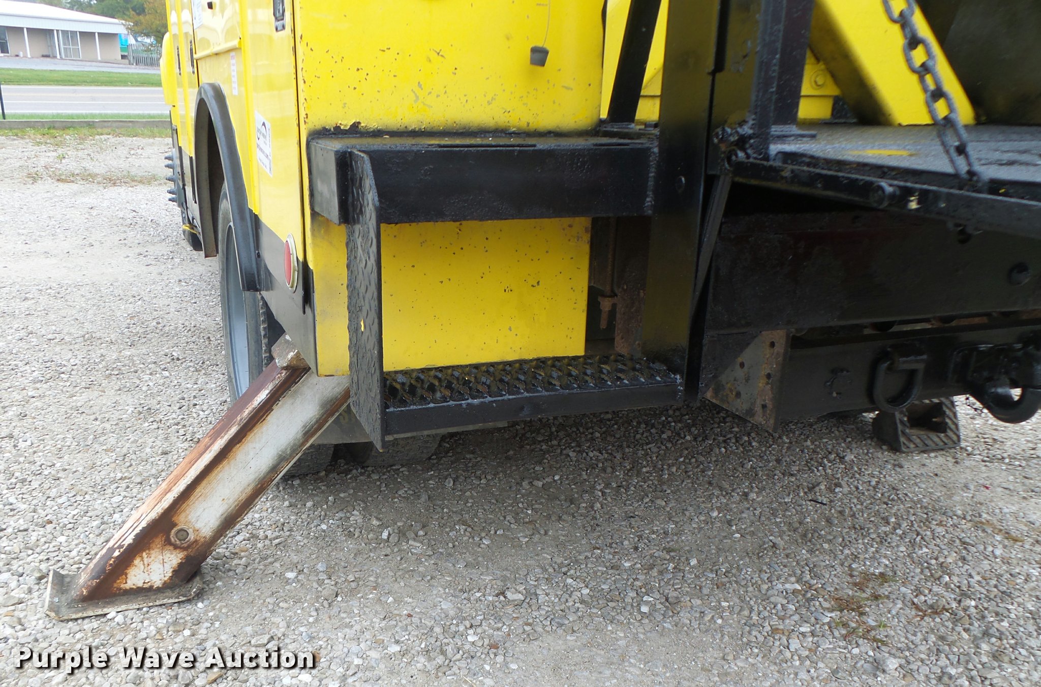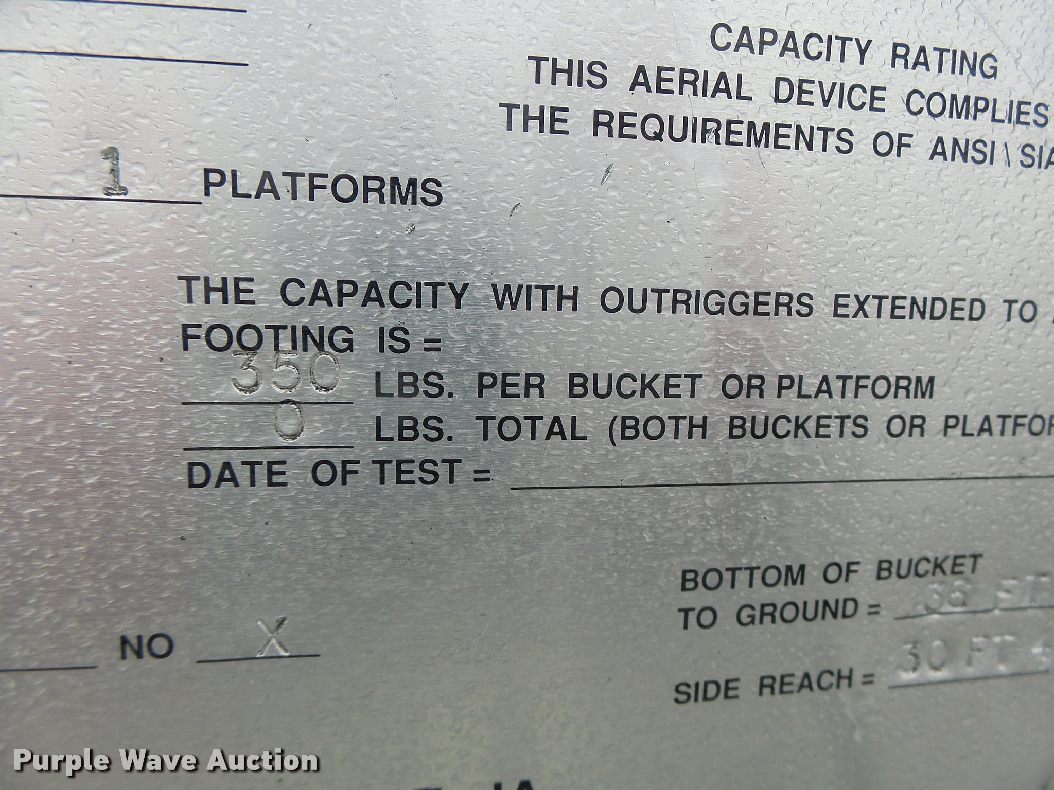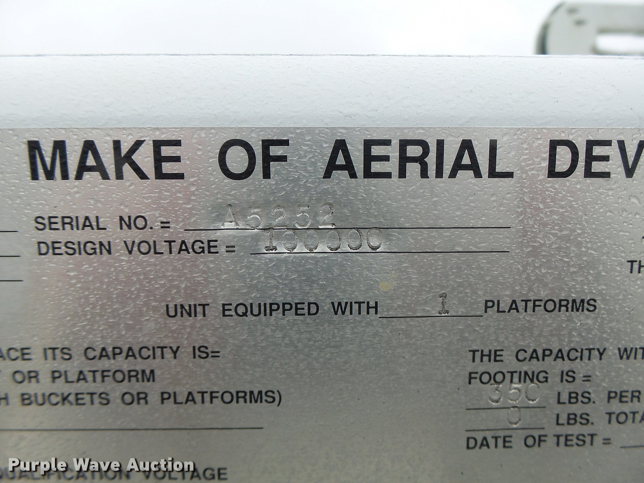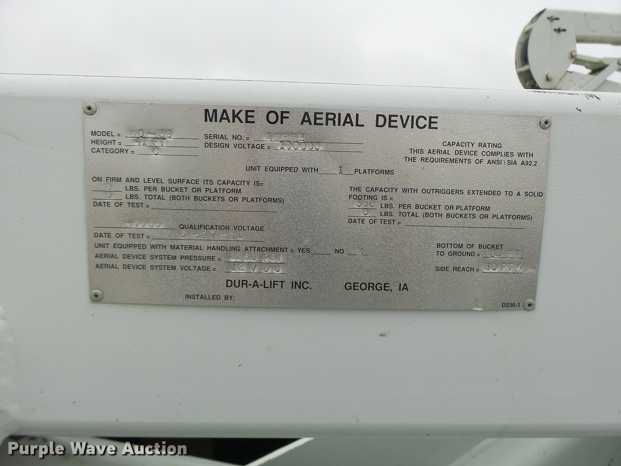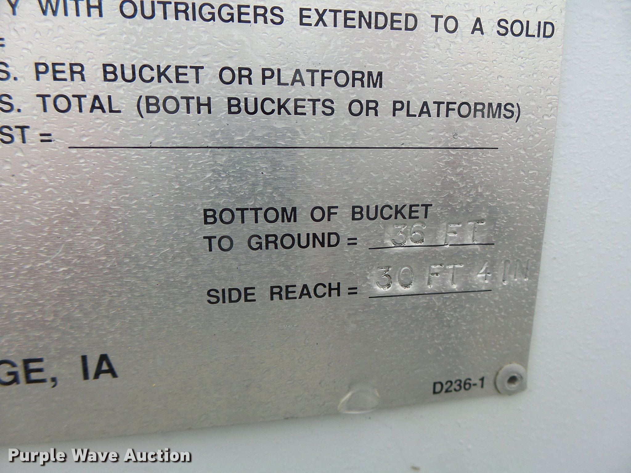 Purple Wave is selling a used Bucket Truck in Missouri. This item is a 2001 Chevrolet C6500 bucket truck with the following: 166,164 miles on odometer, 8.1L V8 gas engine, Automatic transmission, Single axle, AC and heat, AM/FM, Beacon light, PTO, Reading ZAT132ADW service bed, 11'L, Shelving, Slide-out drawers, Compartment lights, Work lights, Serial B448265, Pintle hitch, Trailer wiring, Winch, Remote, Duralift D0-36 boom, Serial A5252, 350 lbs maximum lift capacity, 41' maximum lift height, Man basket, Ground and platform controls, Boom rotation, Outriggers, Dual fuel tanks, Spring suspension, Hydraulic brakes, 255/70R22.5 front tires, 265/75R22.5 rear tires