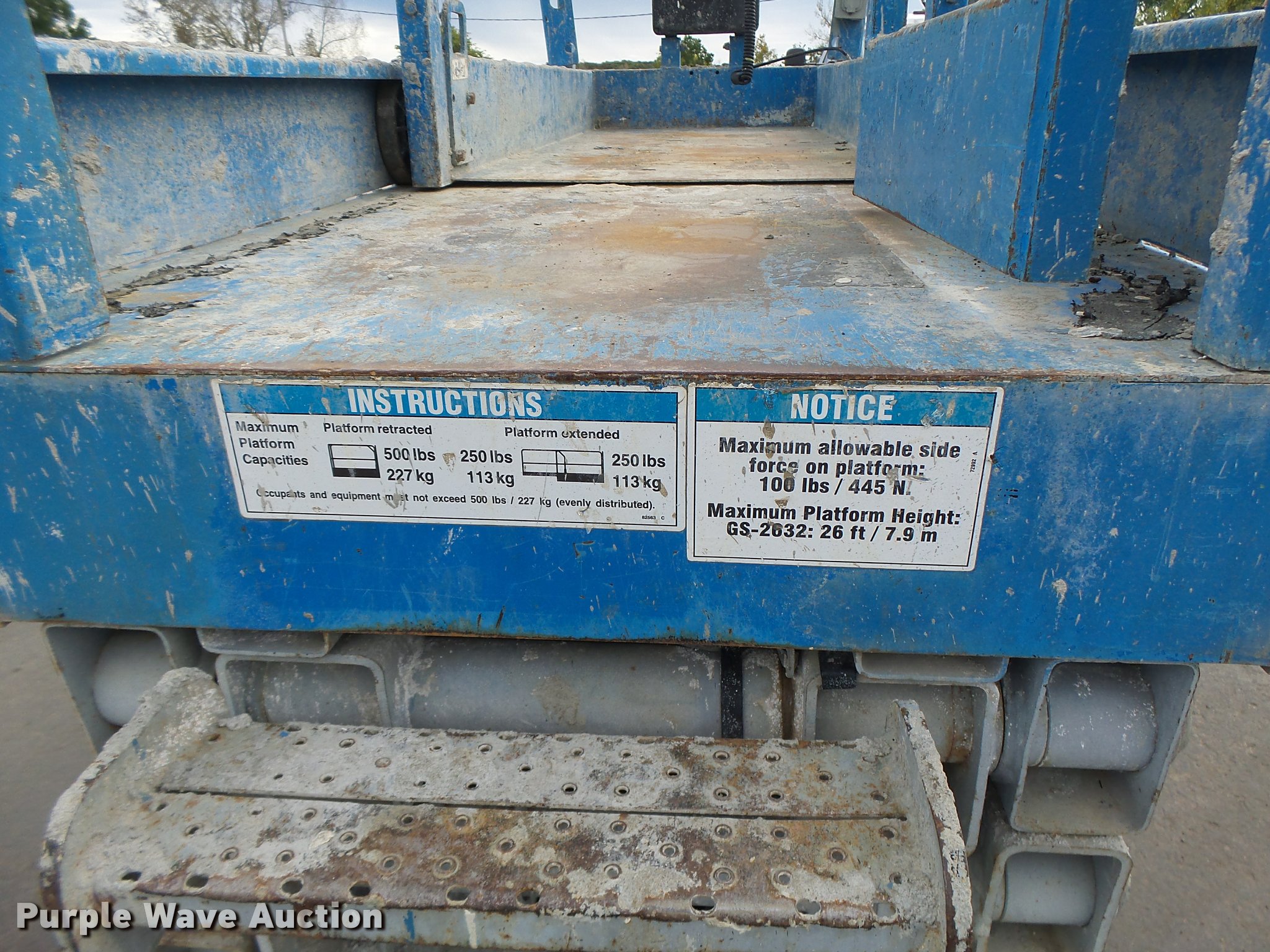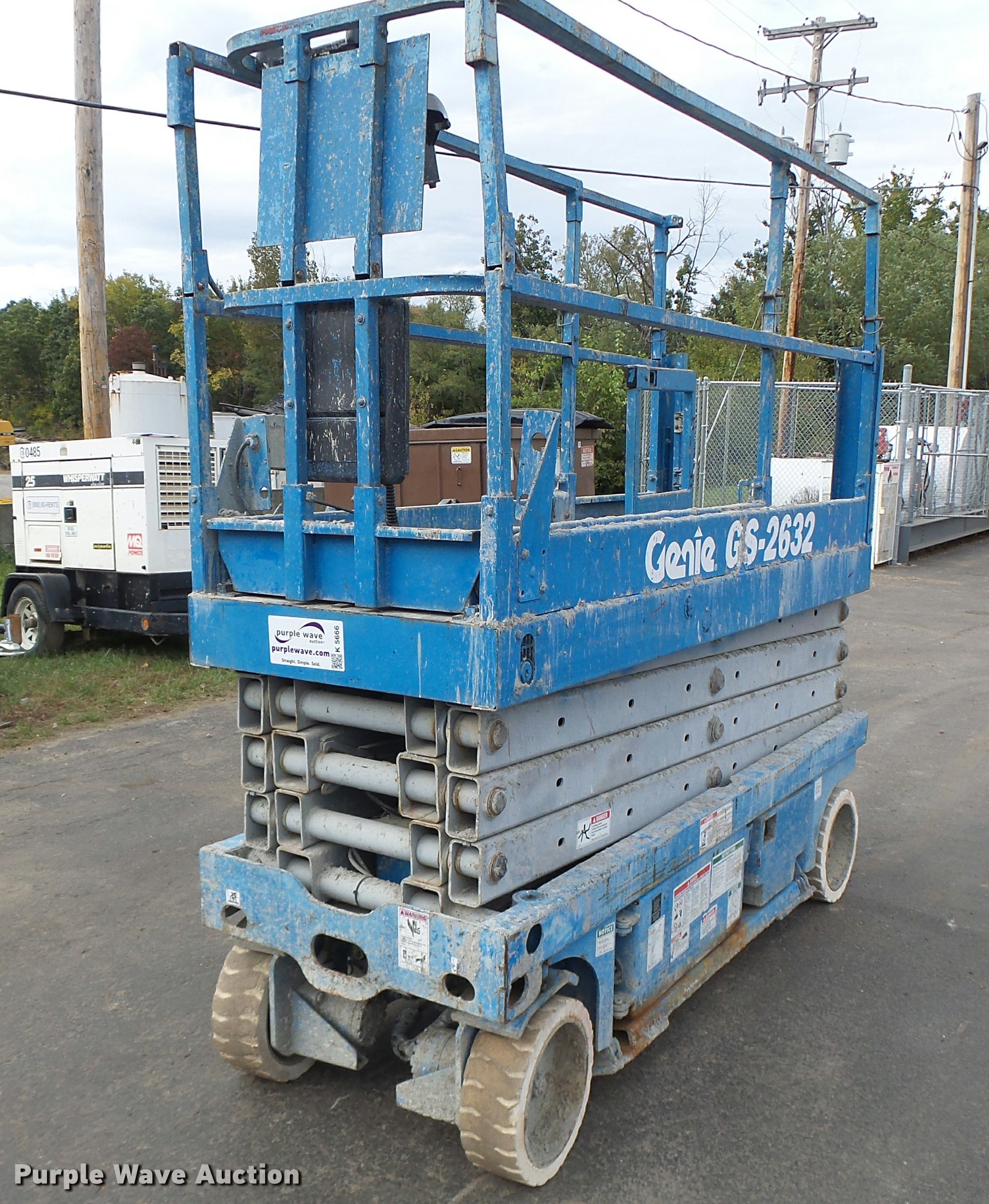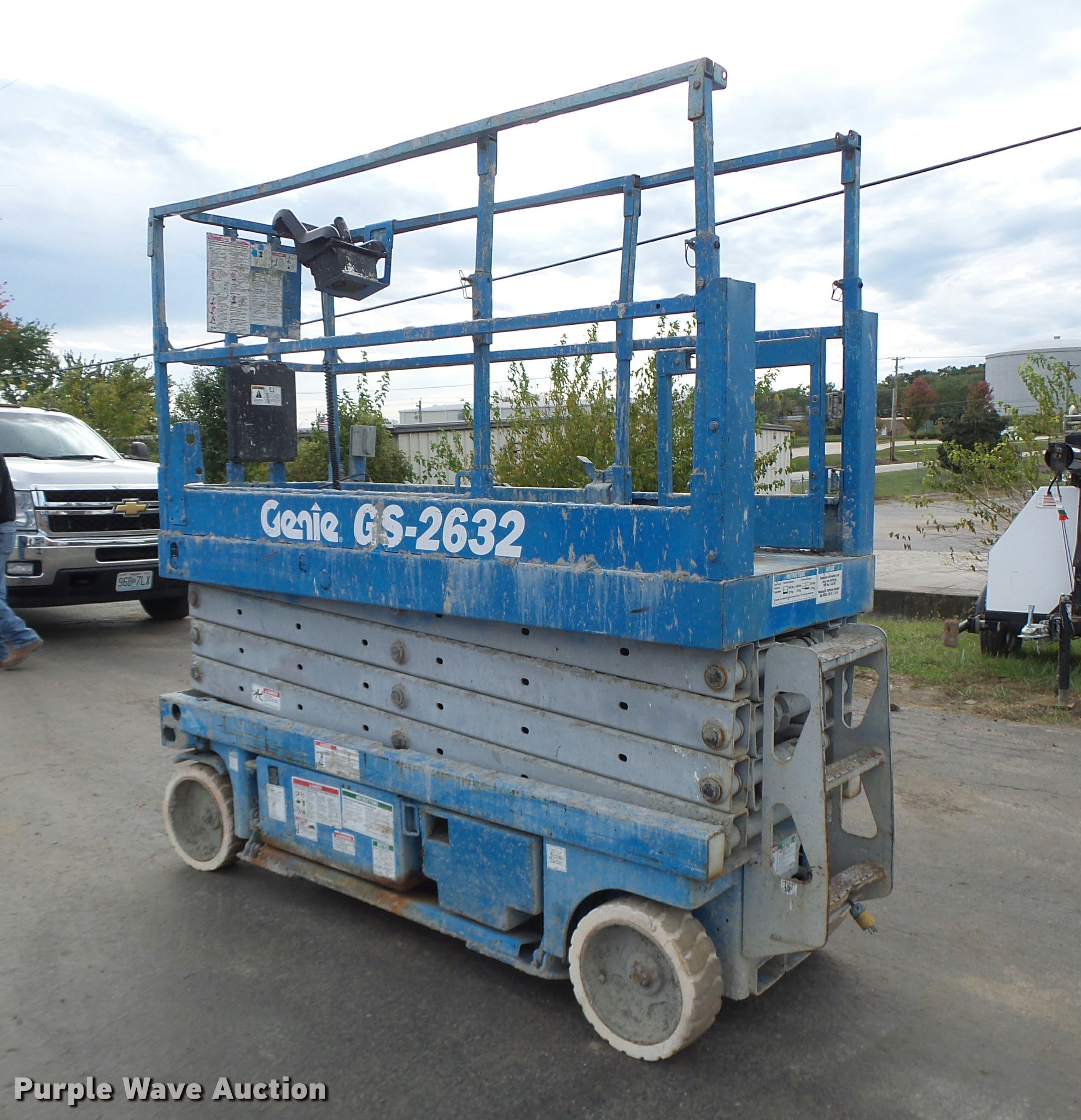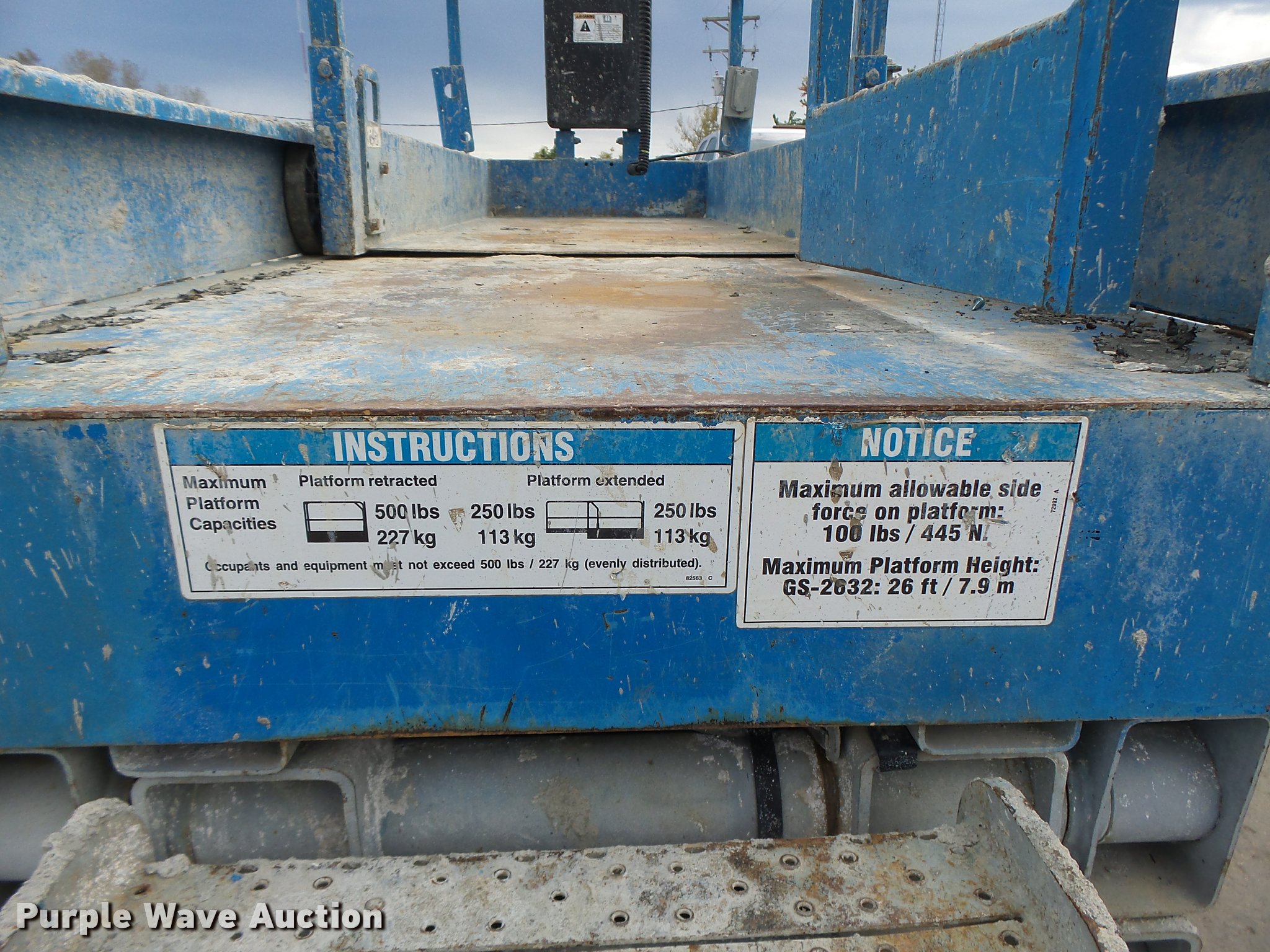 Purple Wave is selling a used Scissor or Vertical Lift in Missouri. This item is a 2004 Genie 2632 scissor lift with the following: 554 hours on meter, Electric operation, 500 lbs maximum lift capacity, 26' maximum lift height, 7'5"L x 32"W platform, Platform and ground controls, Manual platform extensions, AC power outlet, Safety alarm, Solid tires, Serial GS3204-51870