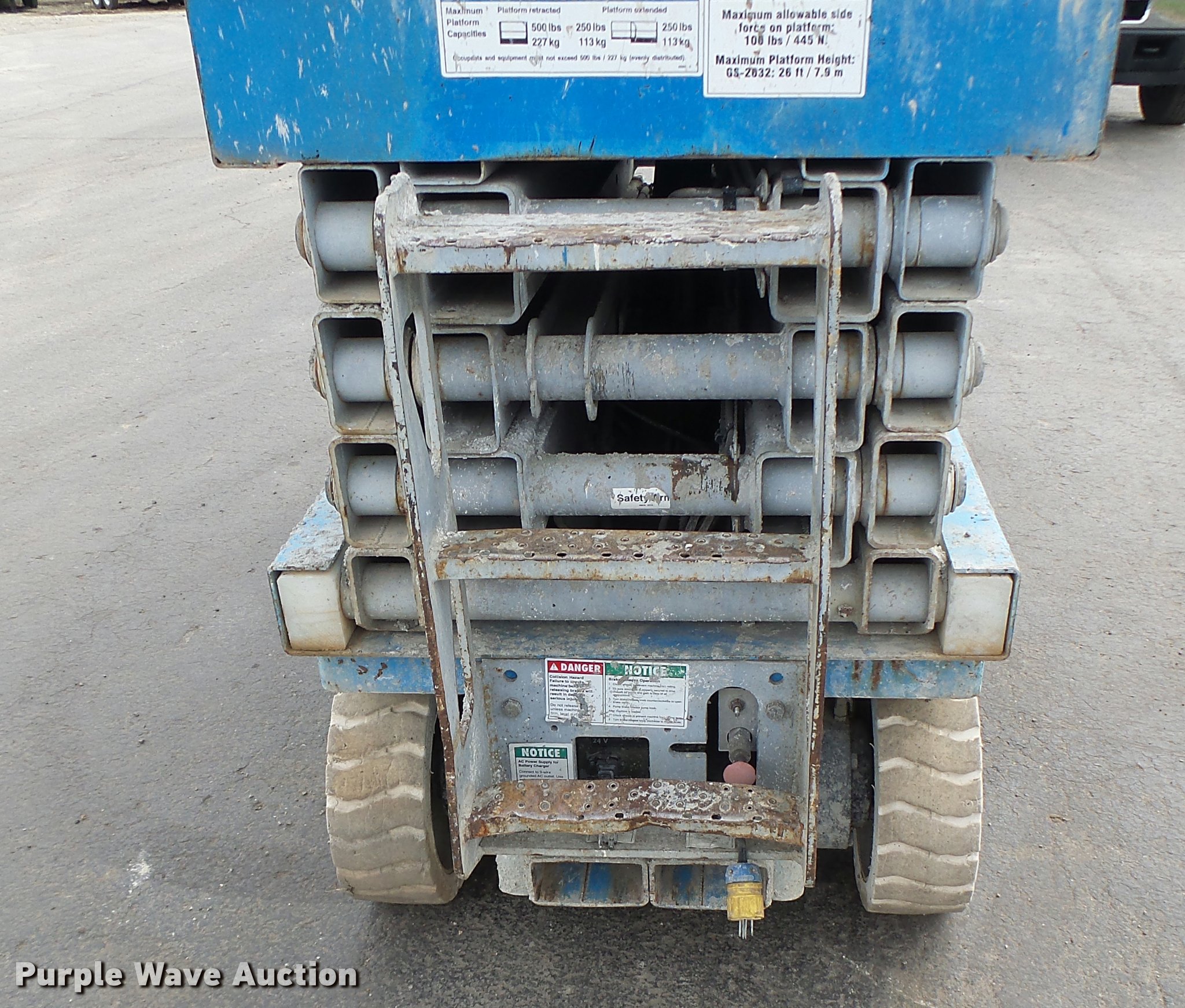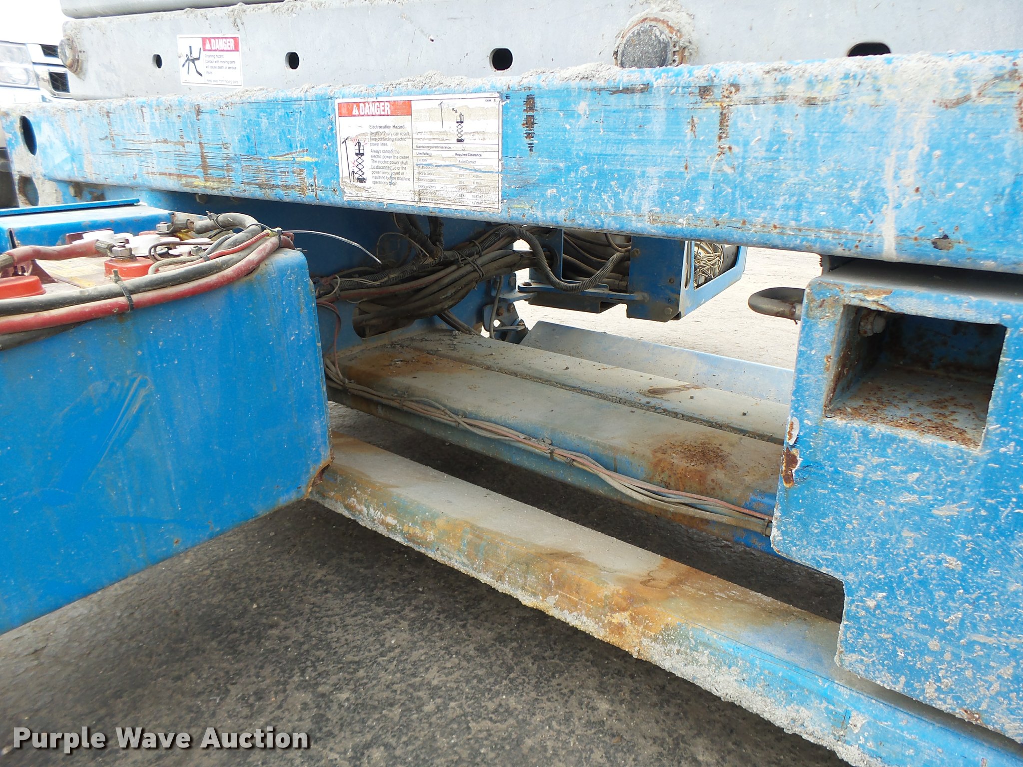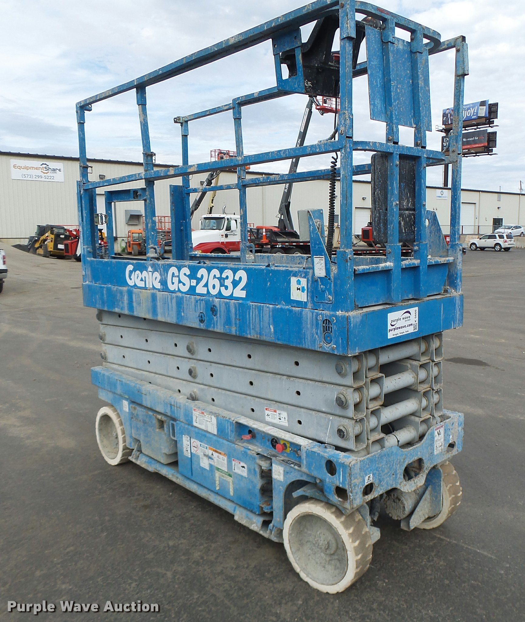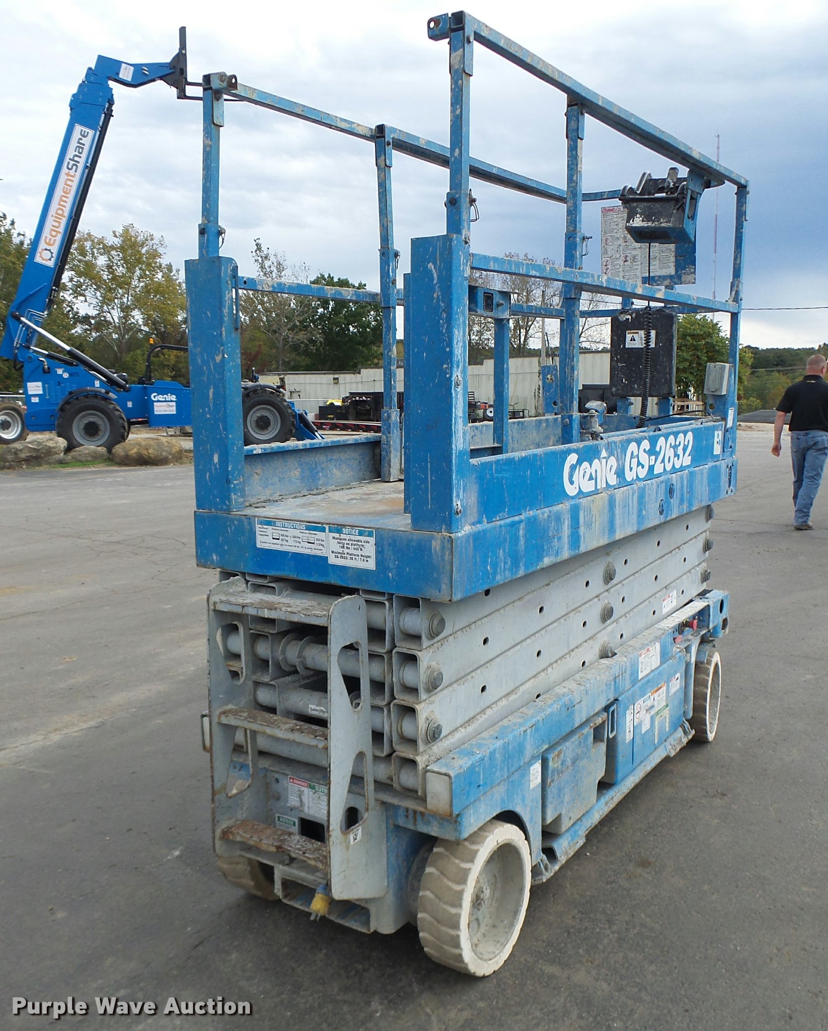 Purple Wave is selling a used Scissor or Vertical Lift in Missouri. This item is a 2004 Genie 2632 scissor lift with the following: 554 hours on meter, Electric operation, 500 lbs maximum lift capacity, 26' maximum lift height, 7'5"L x 32"W platform, Platform and ground controls, Manual platform extensions, AC power outlet, Safety alarm, Solid tires, Serial GS3204-51870