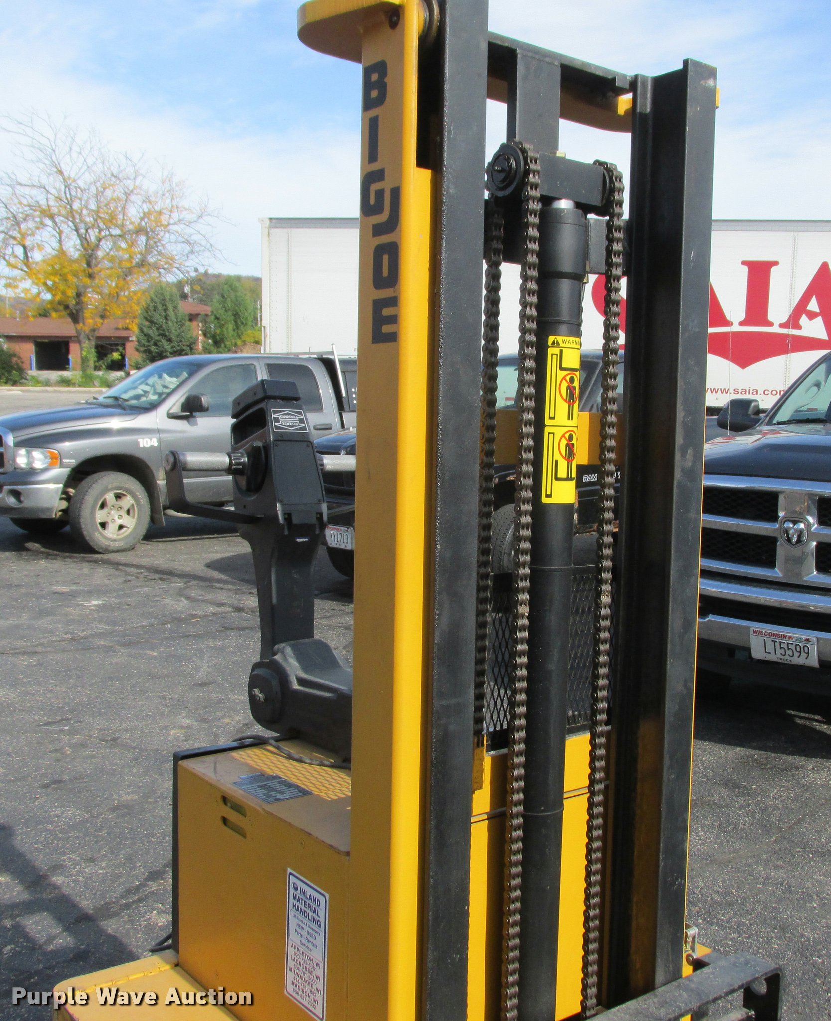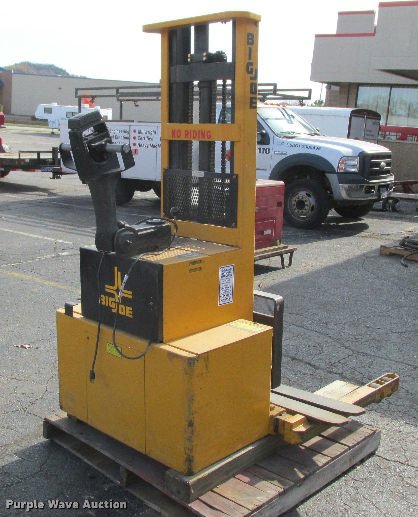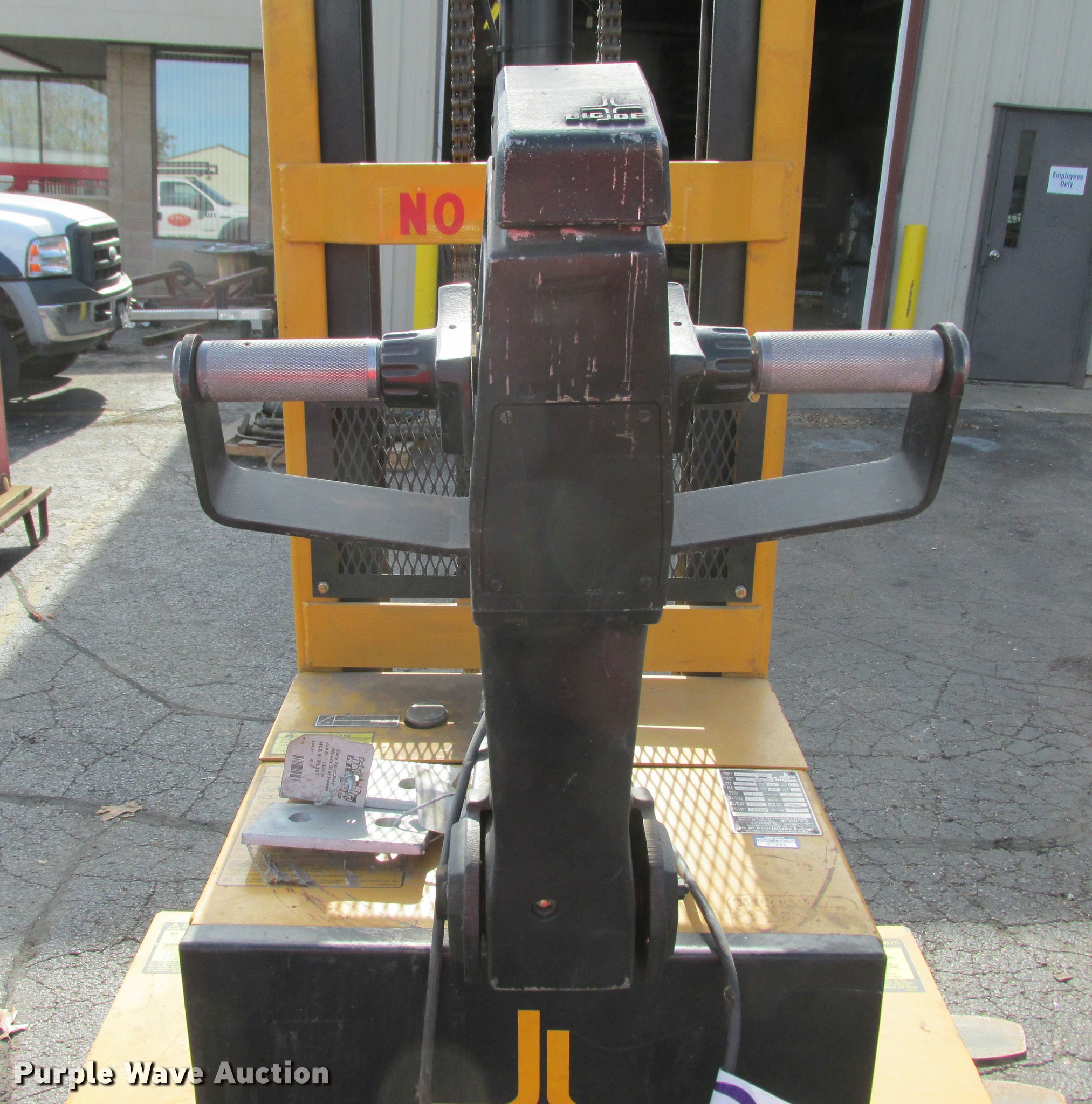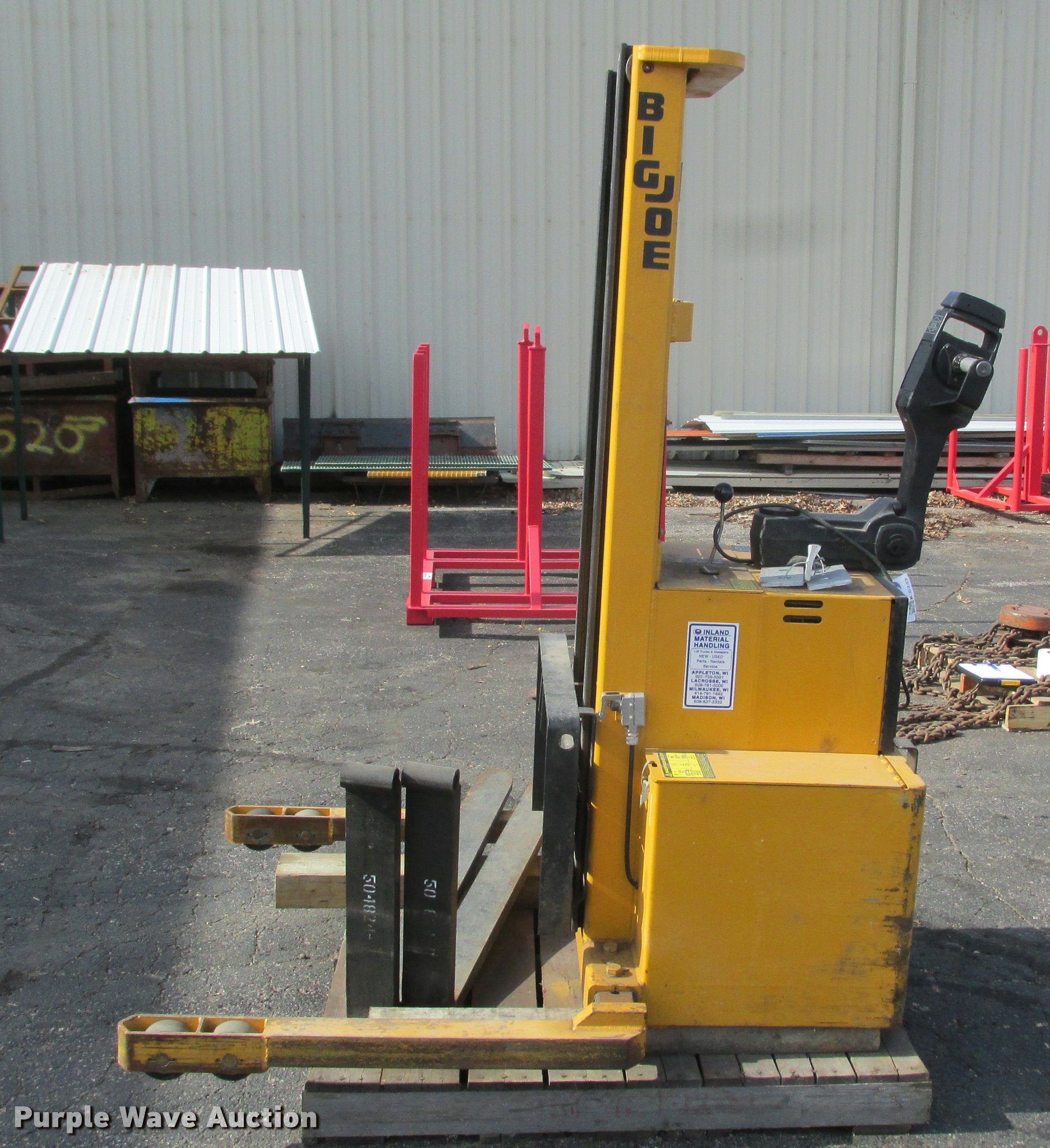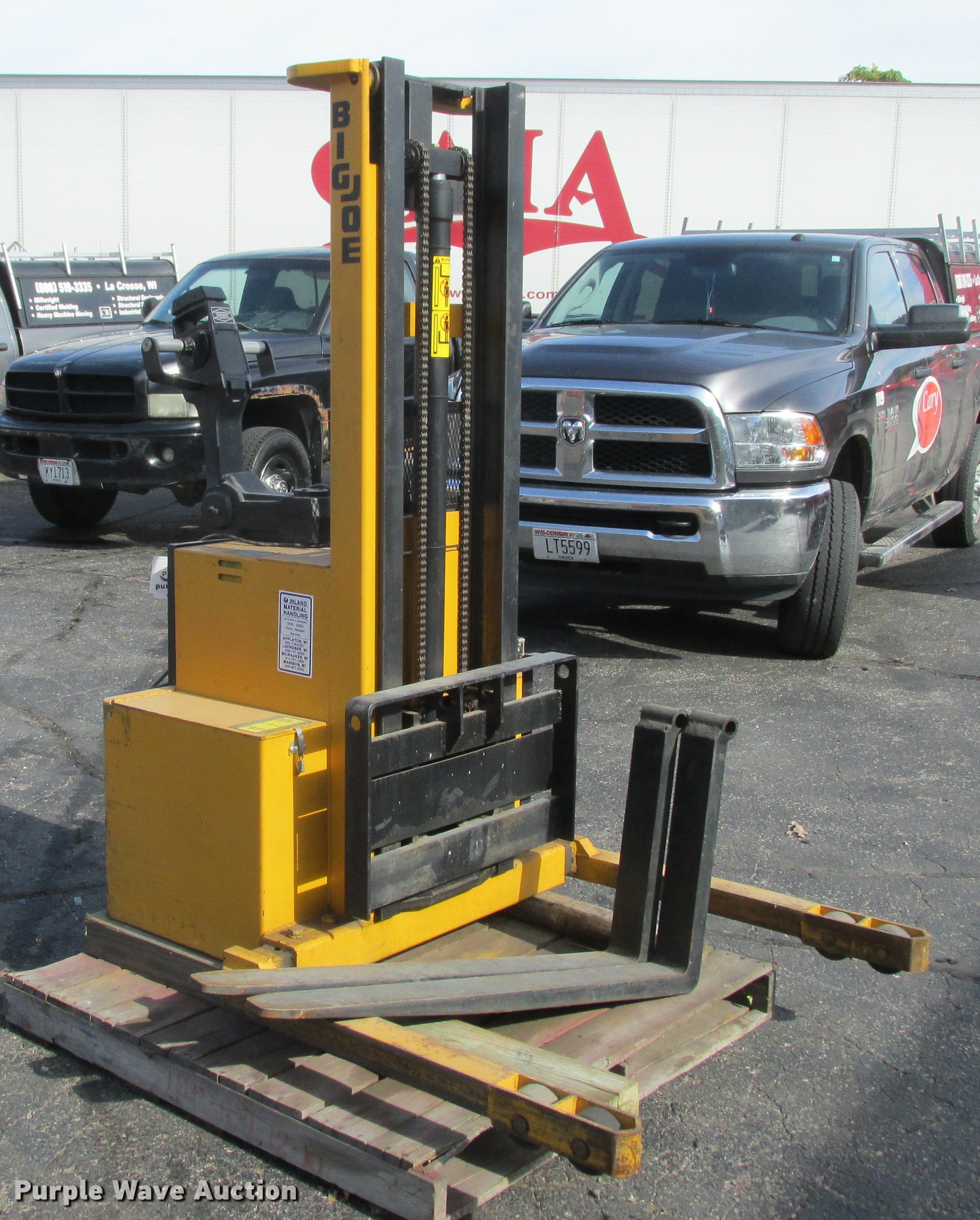 Purple Wave is selling a used Warehouse Forklift in Wisconsin. This item is a Big Joe PDM-30-106 forklift with the following: 12V operation, 3,000 lbs maximum lift capacity, 106" maximum lift height, 44"L forks, Serial 345384