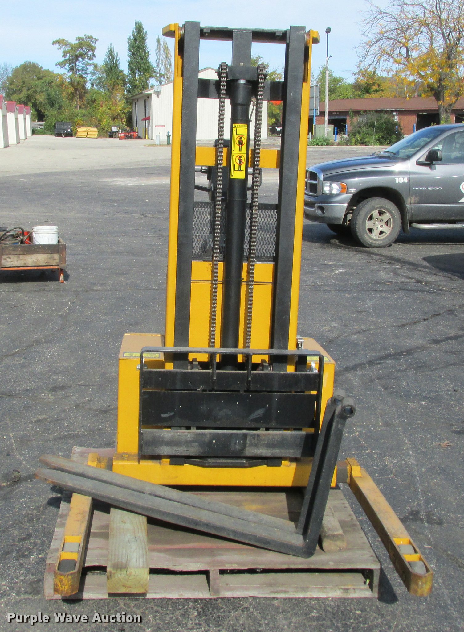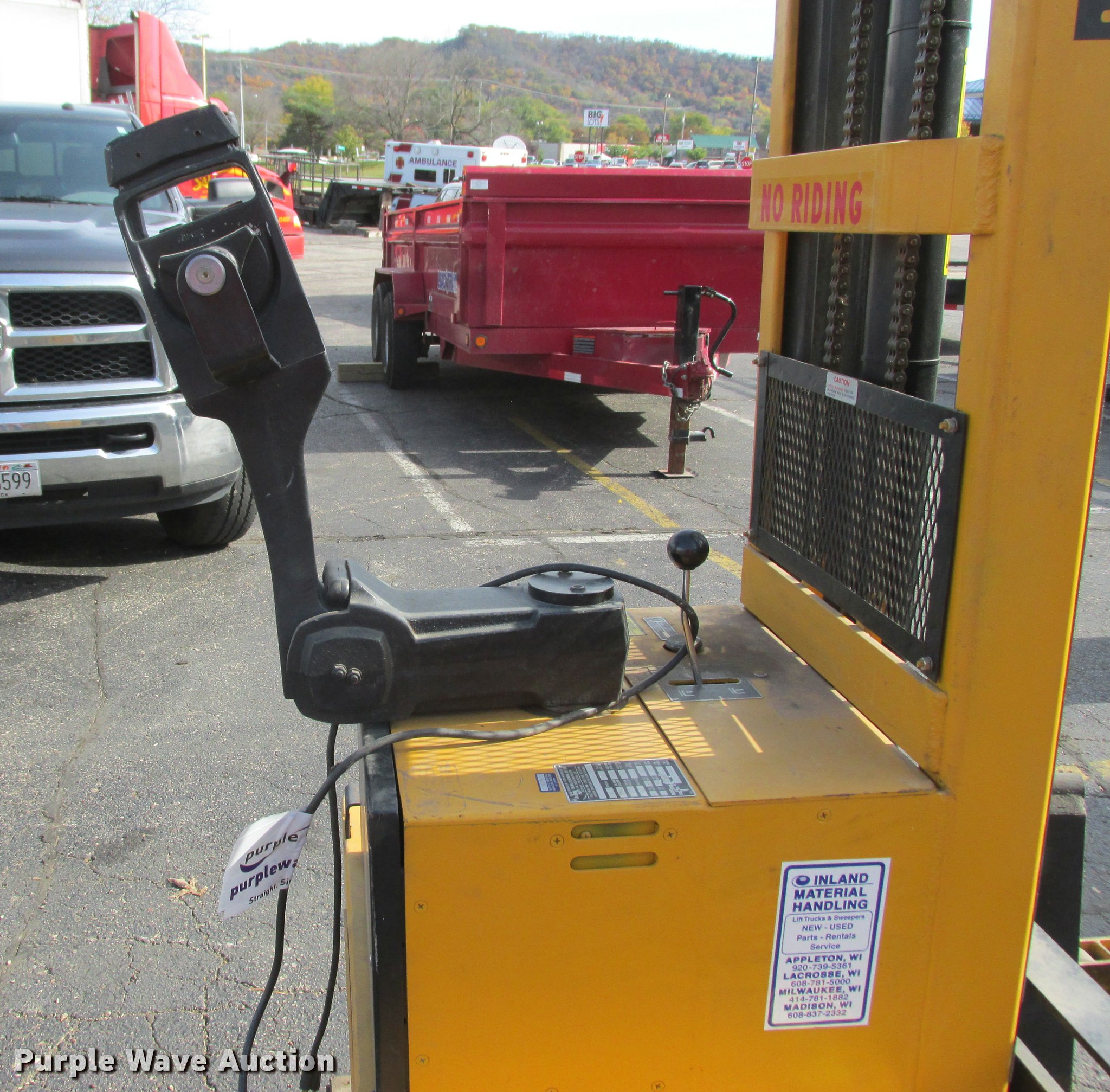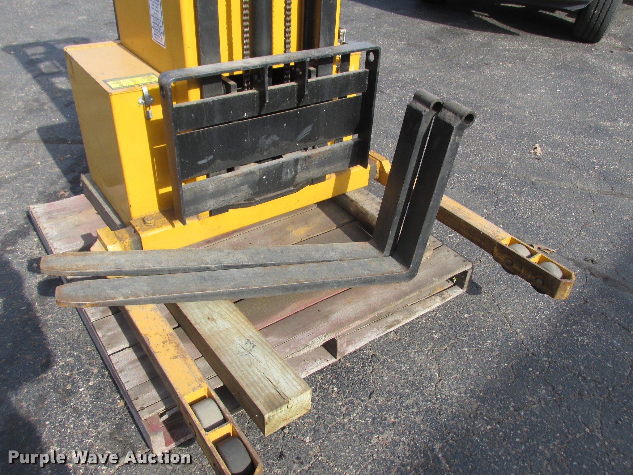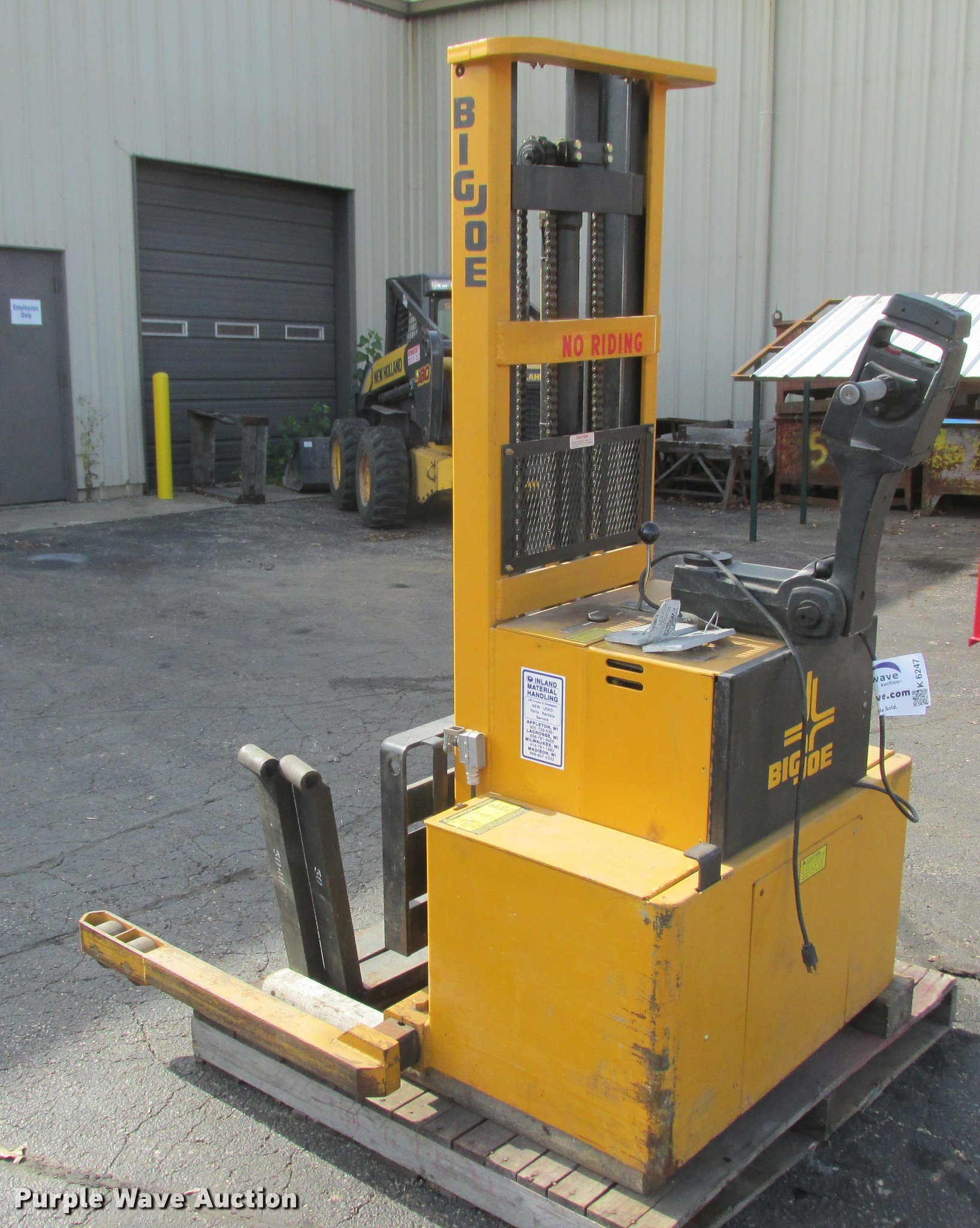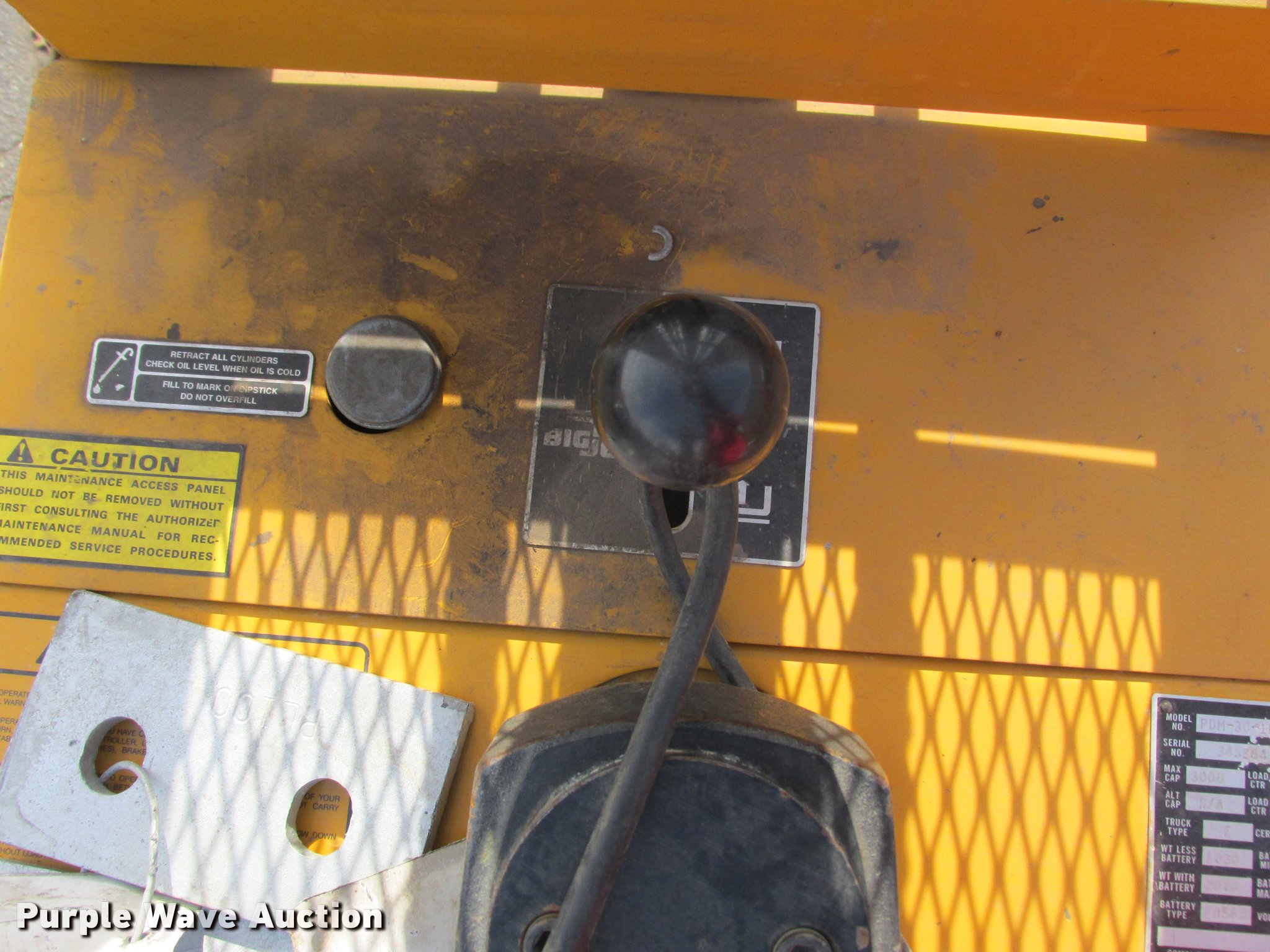 Purple Wave is selling a used Warehouse Forklift in Wisconsin. This item is a Big Joe PDM-30-106 forklift with the following: 12V operation, 3,000 lbs maximum lift capacity, 106" maximum lift height, 44"L forks, Serial 345384