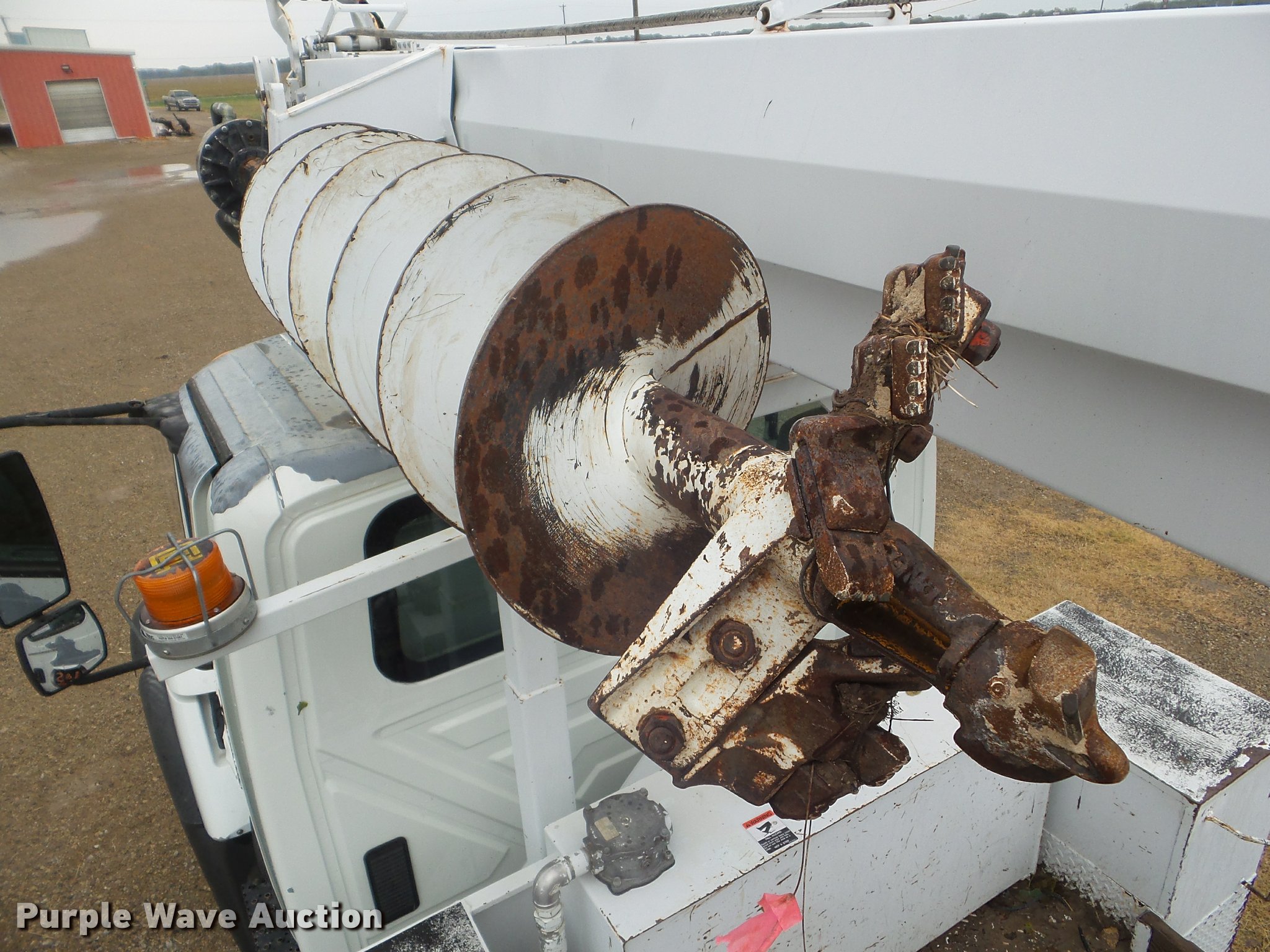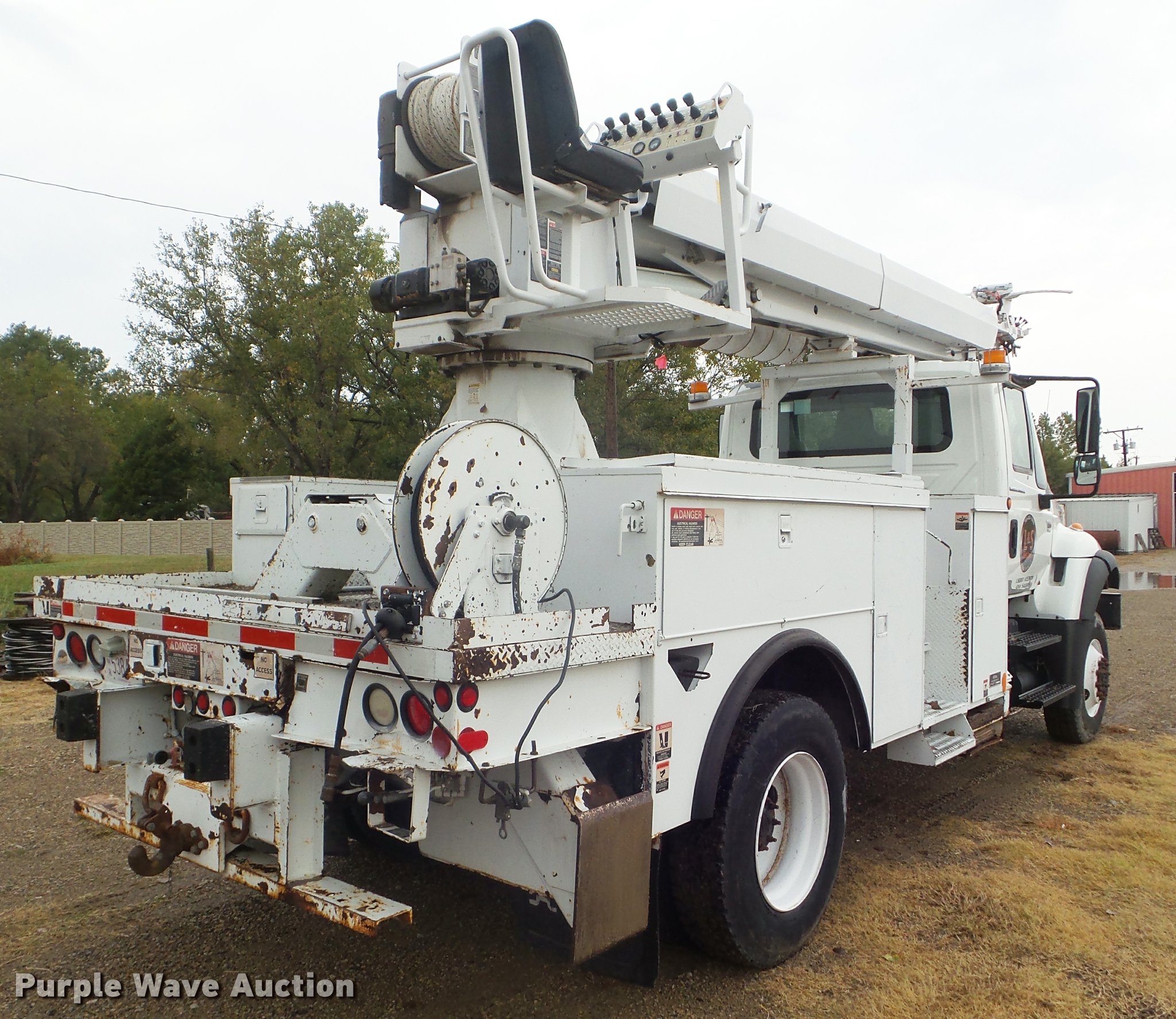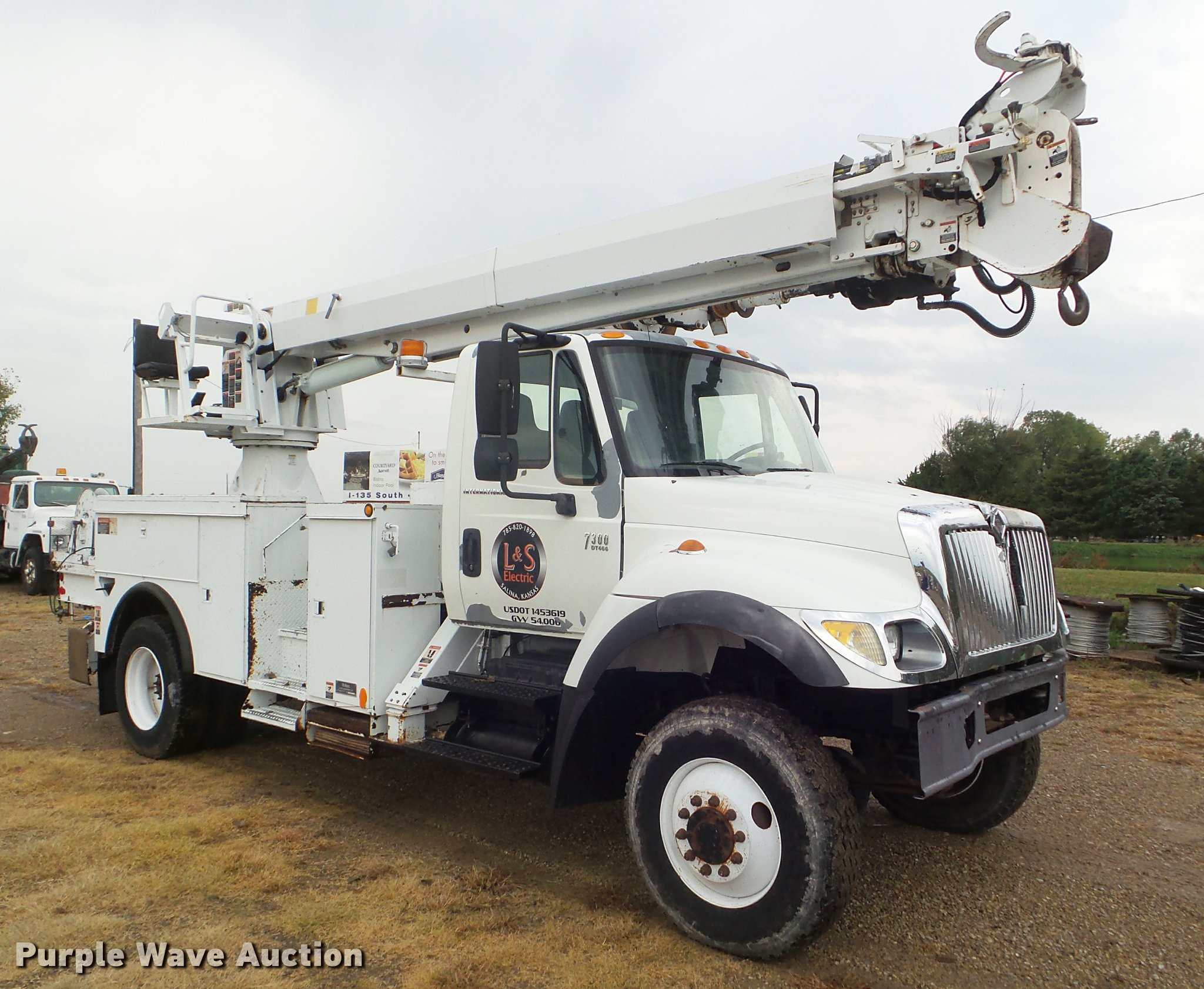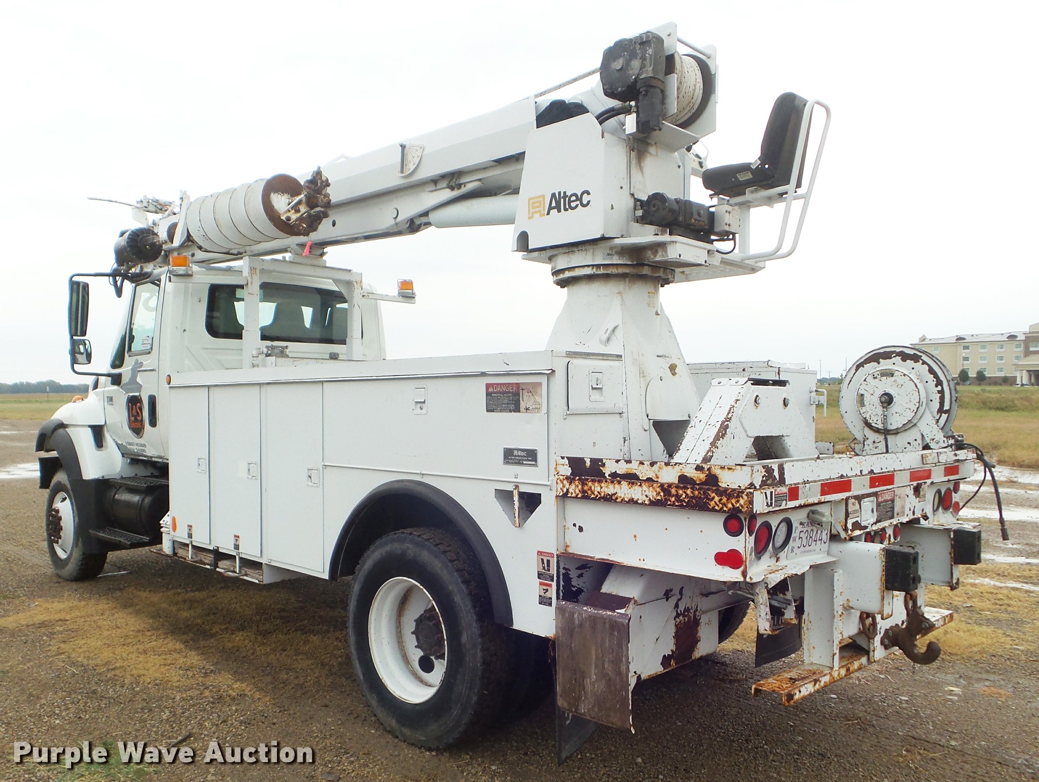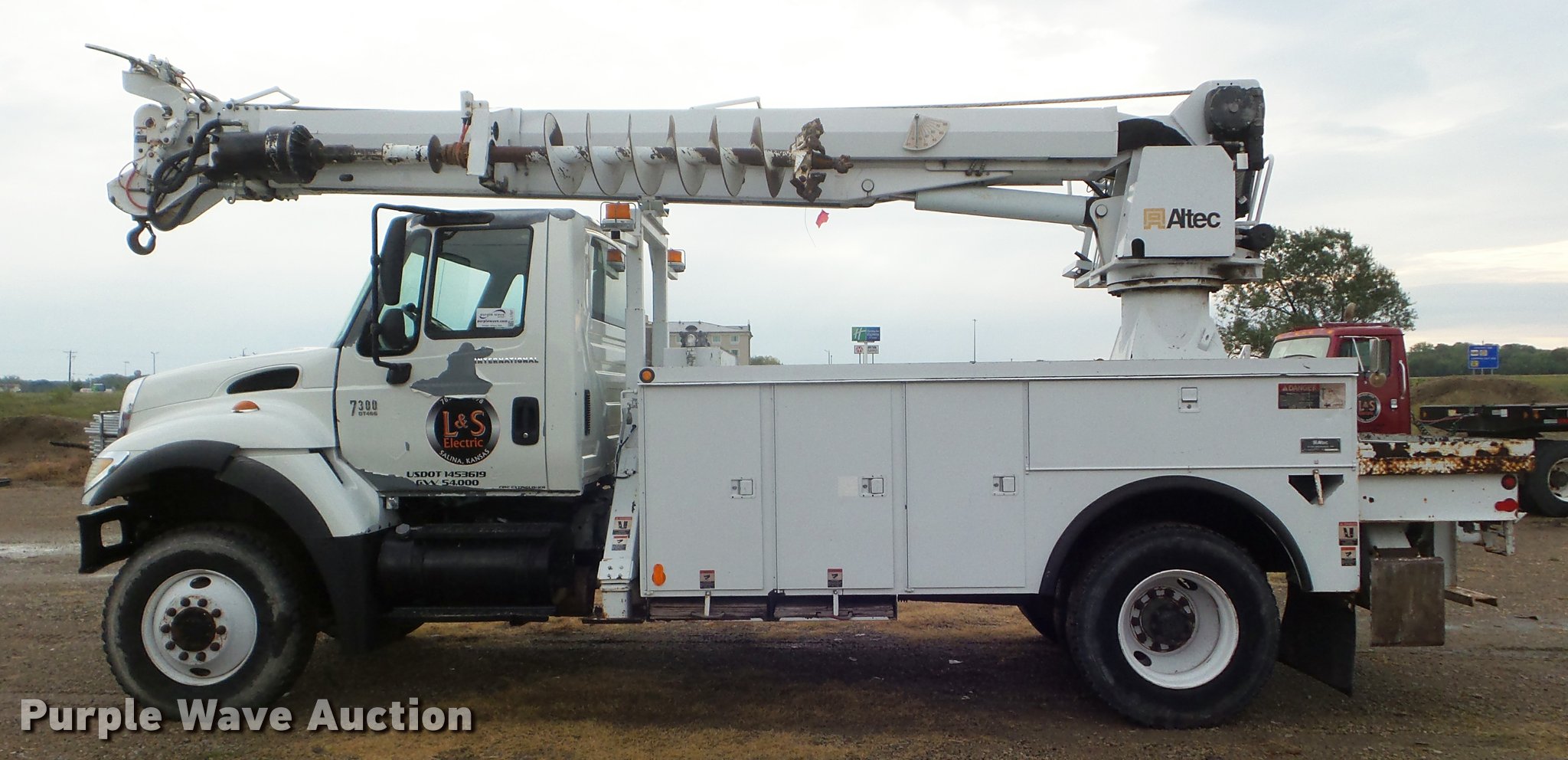 Purple Wave is selling a used Digger Derrick Truck in Kansas. This item is a 2005 International 7300 digger derrick truck with the following: 59,578 miles on odometer, 5,831 hours on meter, International DT466 7.6L L6 turbo diesel engine, Eaton Fuller six speed manual transmission, Four wheel drive, Single axle, AC and heat, Non-operational AC, possible condenser issues, Cruise, AM/FM, Suspensions eat, Brake controller, Backup alarm, Block heater, Front tow hooks, Beacon light, PTO, 2009 Altec service bed, 15'L, Shelving, Air hose reel, Glad hand connectors, Serial 37-3725412, 2005 Altec DM47TR digger derrick, 47' boom length, 23,790 lbs max lift capacity, Ground and platform controls, Boom rotation, Material handler, Pole guide, Insulated telescopic boom, 18" diameter auger, Removable teeth, 12,000 lbs winch line rating, (4) outriggers, Serial 0205DV1038, Pintle hitch, Trailer wiring, Single fuel tank, Spring suspension, Air brakes, 195" wheelbase, 11R22.5 tires