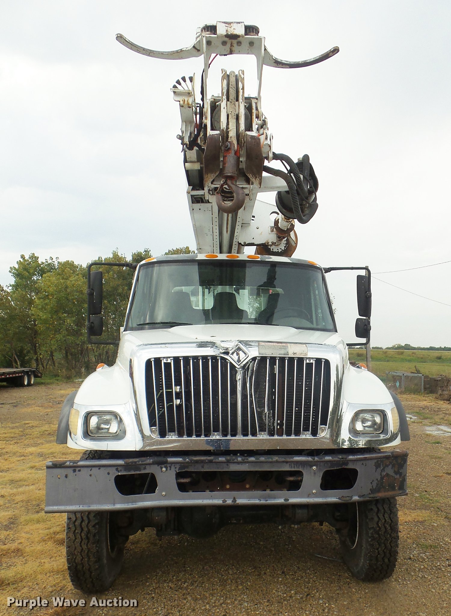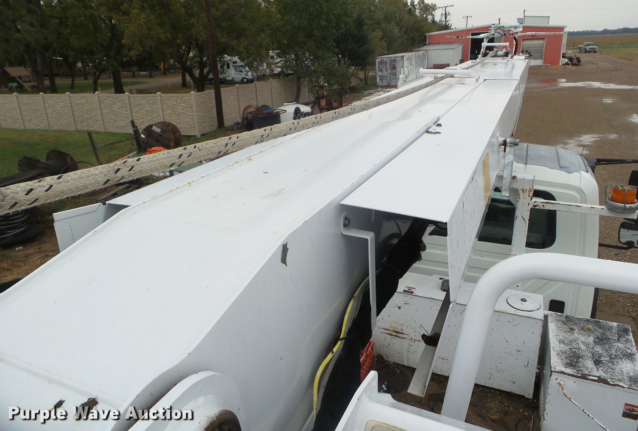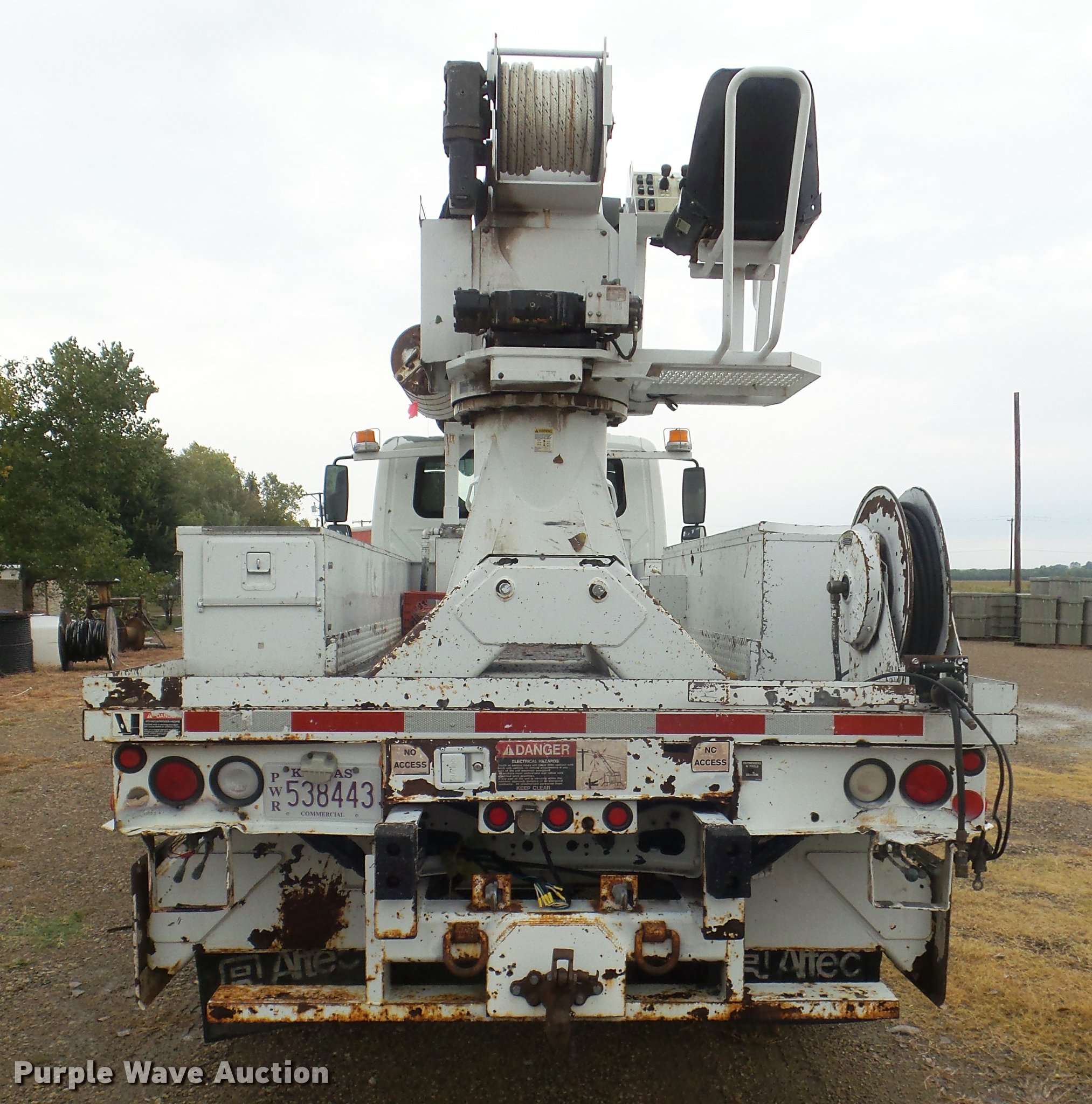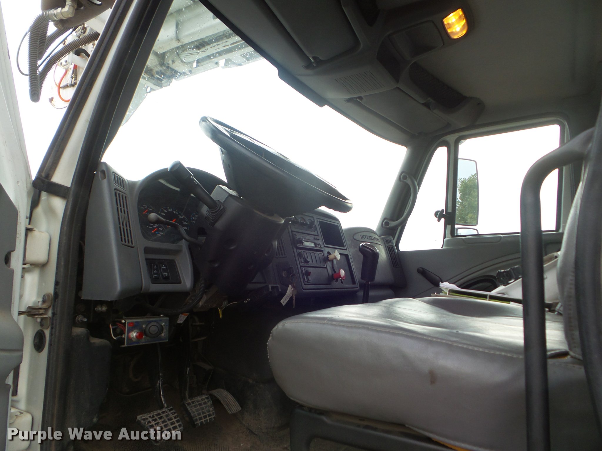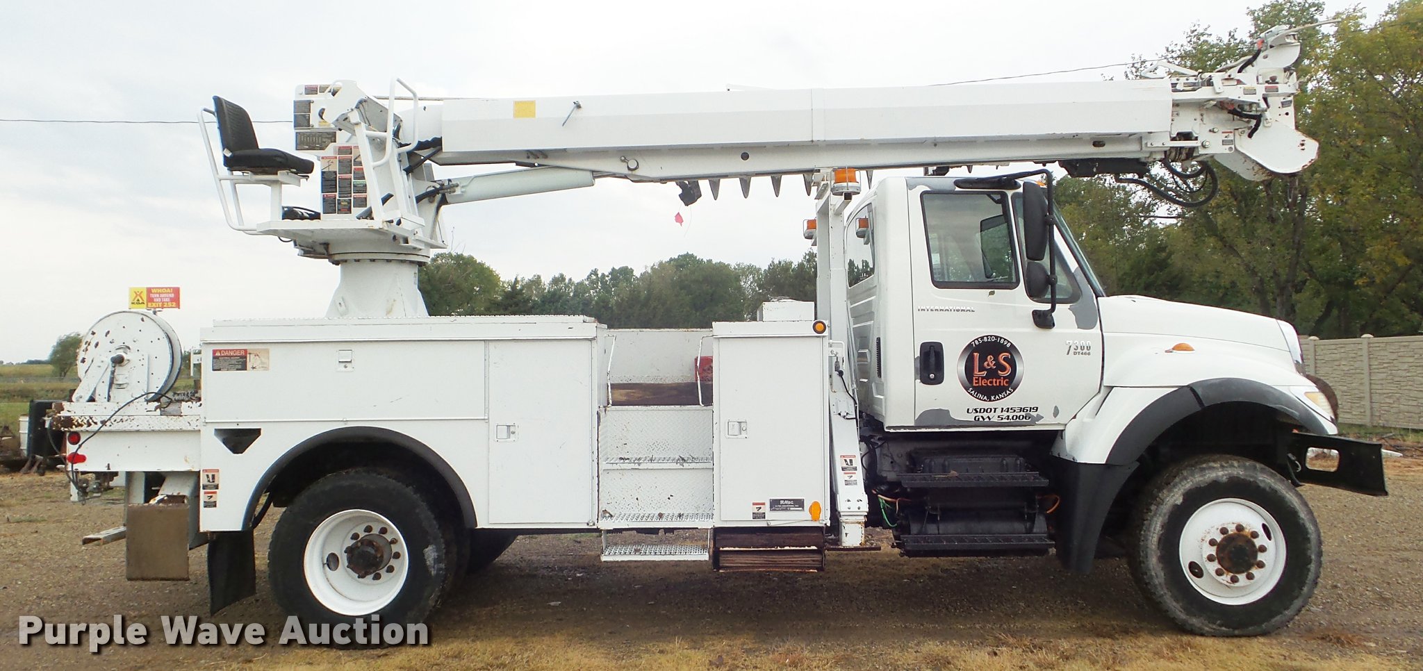 Purple Wave is selling a used Digger Derrick Truck in Kansas. This item is a 2005 International 7300 digger derrick truck with the following: 59,578 miles on odometer, 5,831 hours on meter, International DT466 7.6L L6 turbo diesel engine, Eaton Fuller six speed manual transmission, Four wheel drive, Single axle, AC and heat, Non-operational AC, possible condenser issues, Cruise, AM/FM, Suspensions eat, Brake controller, Backup alarm, Block heater, Front tow hooks, Beacon light, PTO, 2009 Altec service bed, 15'L, Shelving, Air hose reel, Glad hand connectors, Serial 37-3725412, 2005 Altec DM47TR digger derrick, 47' boom length, 23,790 lbs max lift capacity, Ground and platform controls, Boom rotation, Material handler, Pole guide, Insulated telescopic boom, 18" diameter auger, Removable teeth, 12,000 lbs winch line rating, (4) outriggers, Serial 0205DV1038, Pintle hitch, Trailer wiring, Single fuel tank, Spring suspension, Air brakes, 195" wheelbase, 11R22.5 tires