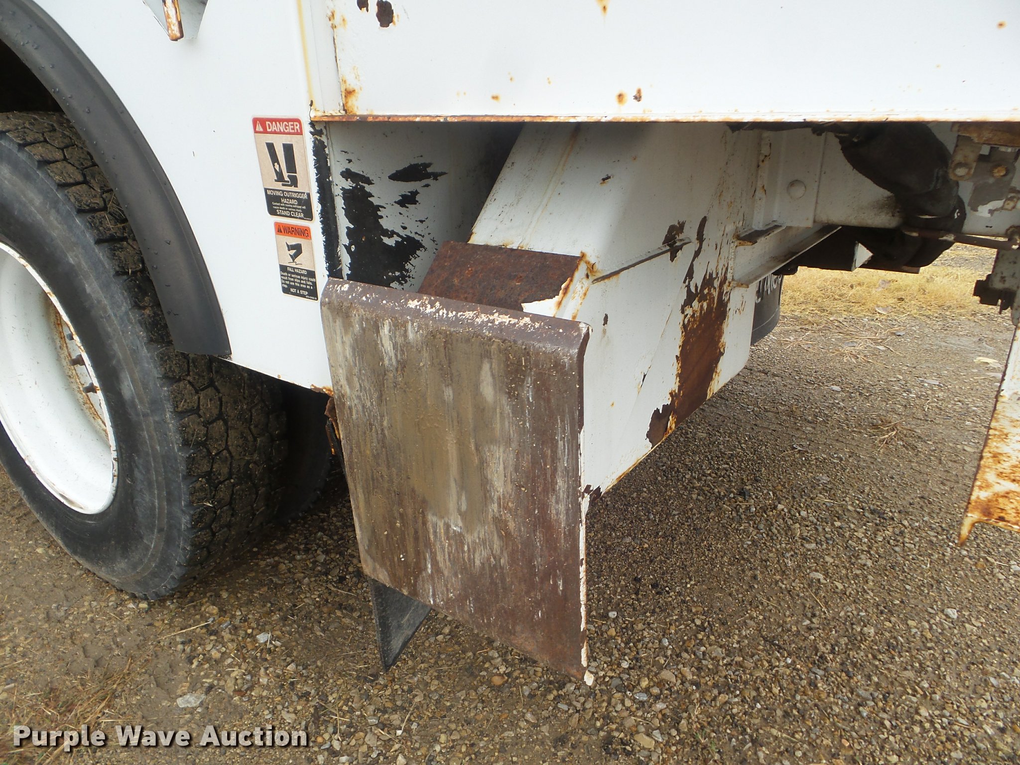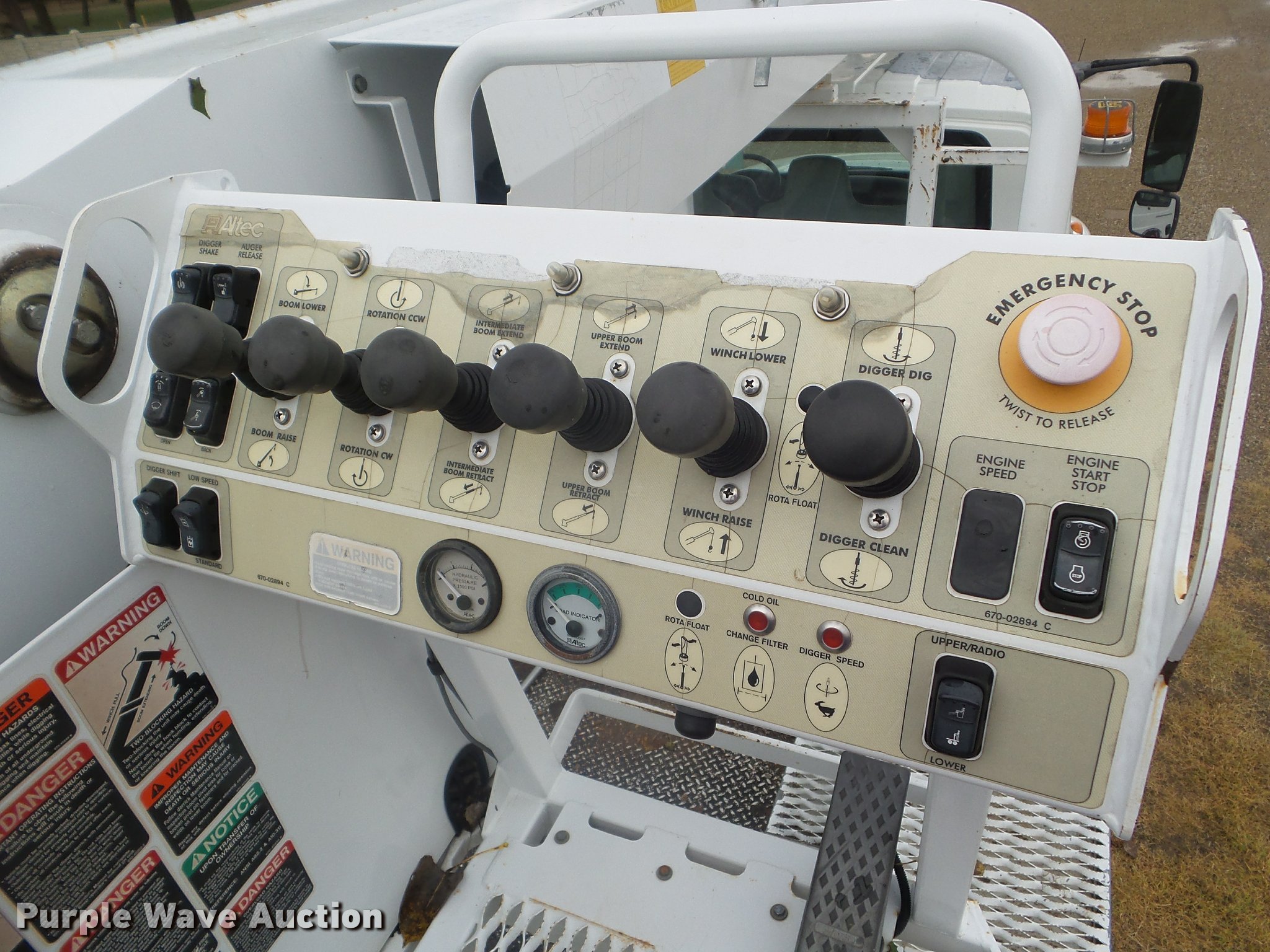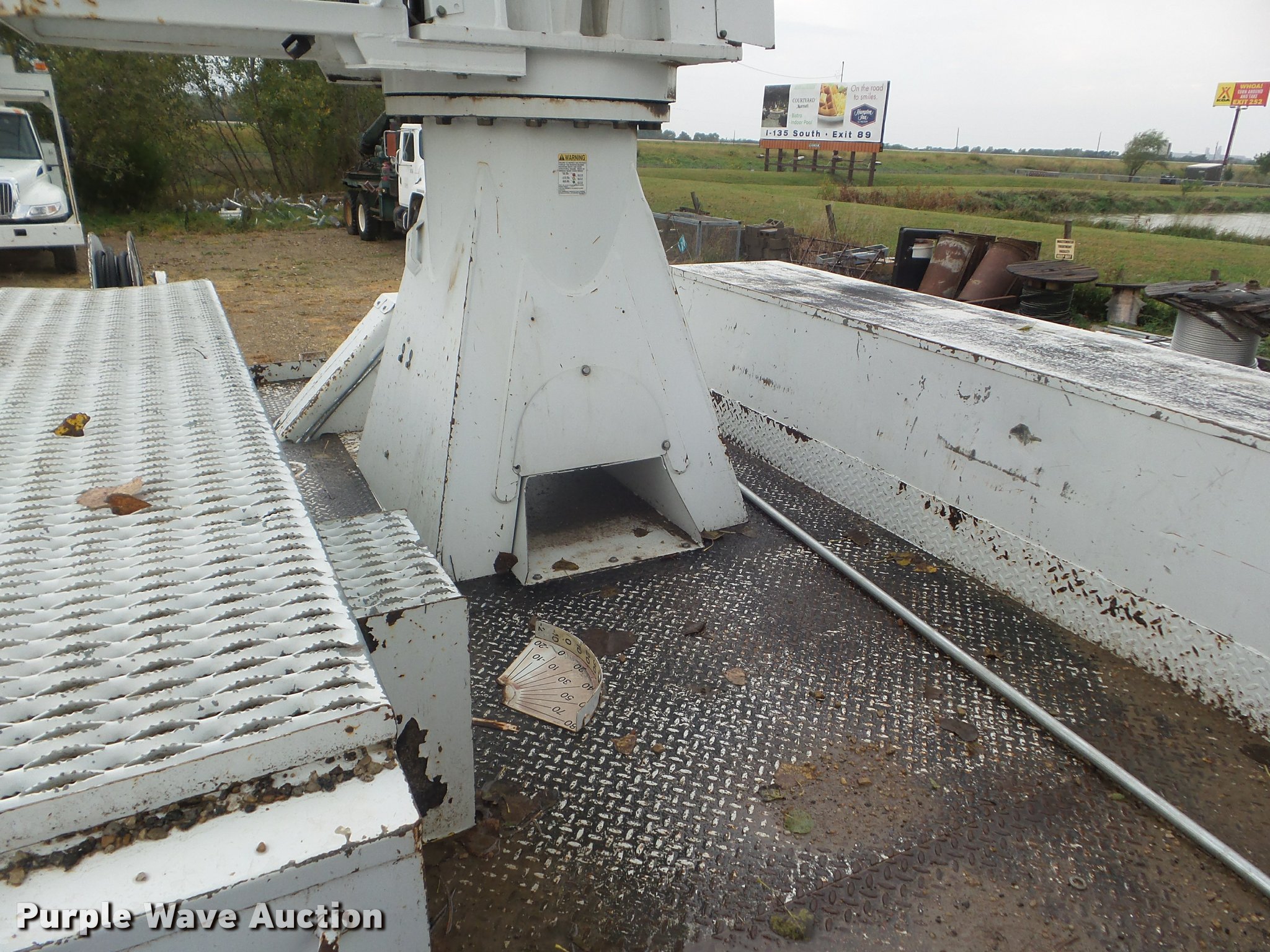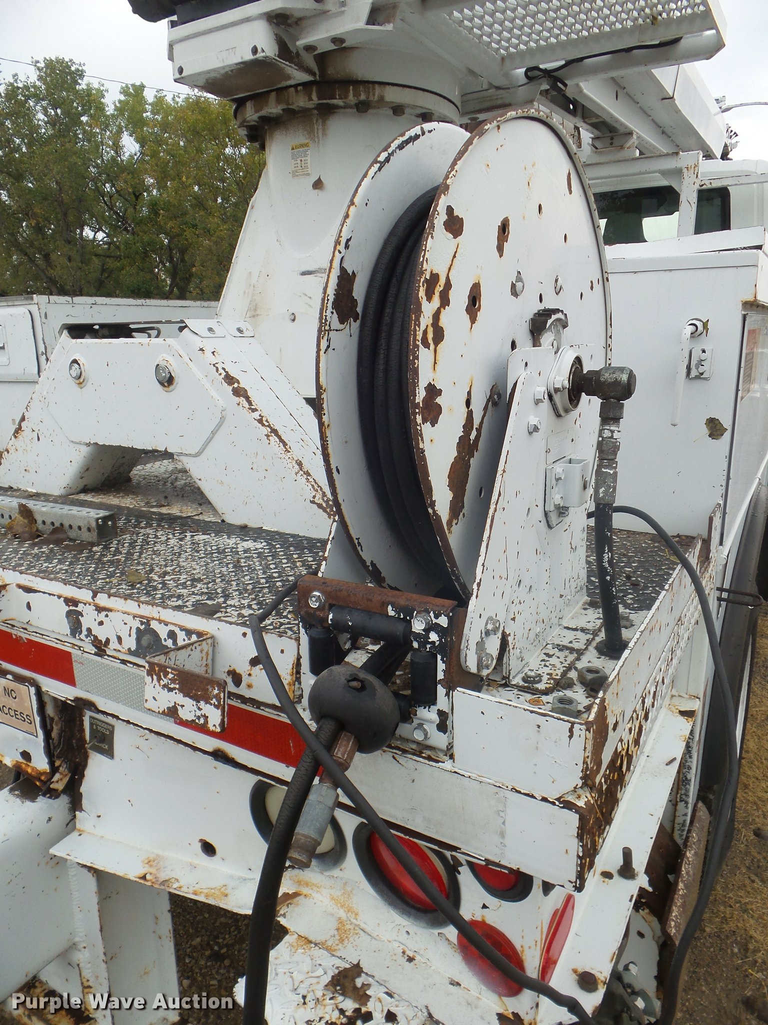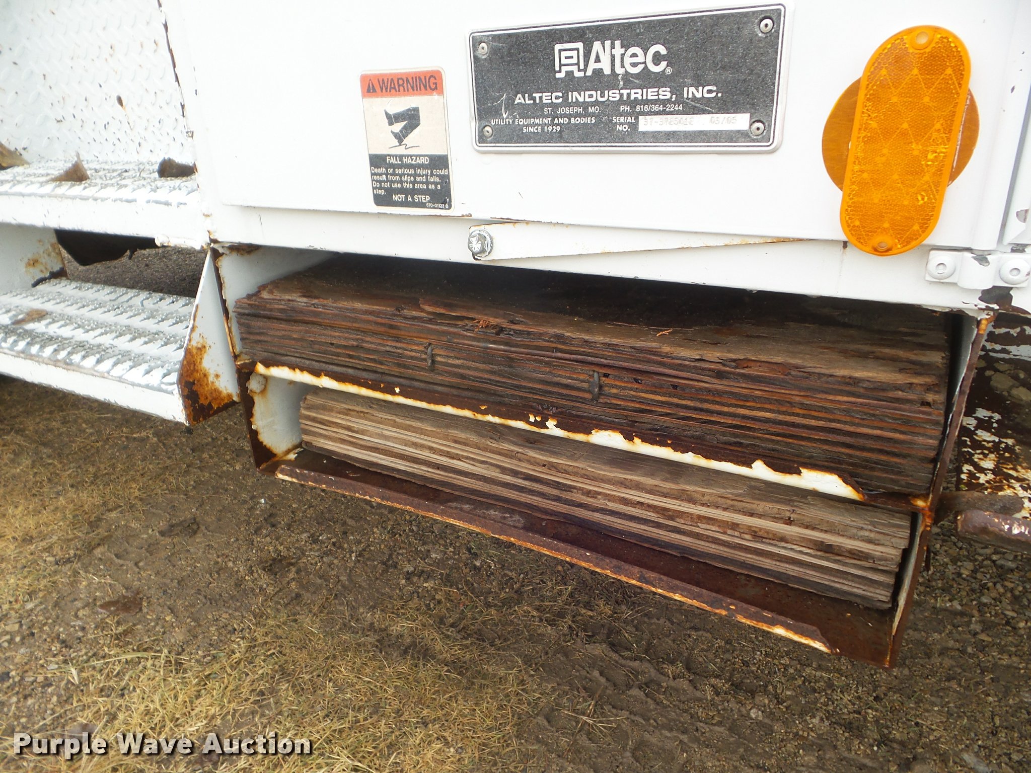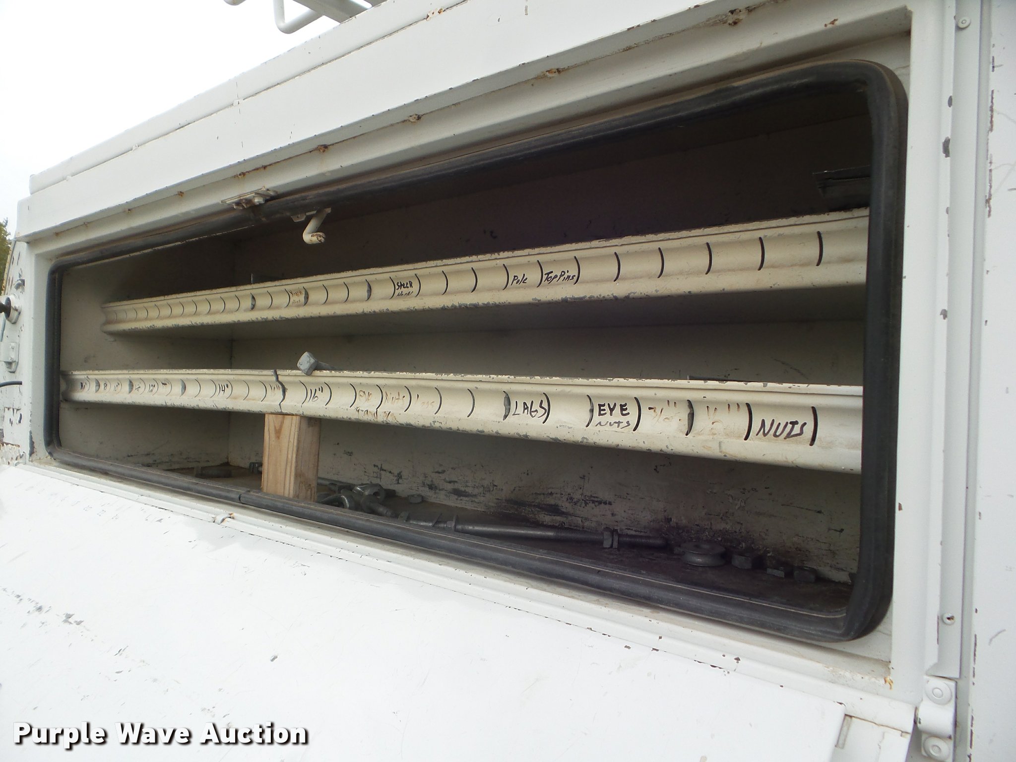 Purple Wave is selling a used Digger Derrick Truck in Kansas. This item is a 2005 International 7300 digger derrick truck with the following: 59,578 miles on odometer, 5,831 hours on meter, International DT466 7.6L L6 turbo diesel engine, Eaton Fuller six speed manual transmission, Four wheel drive, Single axle, AC and heat, Non-operational AC, possible condenser issues, Cruise, AM/FM, Suspensions eat, Brake controller, Backup alarm, Block heater, Front tow hooks, Beacon light, PTO, 2009 Altec service bed, 15'L, Shelving, Air hose reel, Glad hand connectors, Serial 37-3725412, 2005 Altec DM47TR digger derrick, 47' boom length, 23,790 lbs max lift capacity, Ground and platform controls, Boom rotation, Material handler, Pole guide, Insulated telescopic boom, 18" diameter auger, Removable teeth, 12,000 lbs winch line rating, (4) outriggers, Serial 0205DV1038, Pintle hitch, Trailer wiring, Single fuel tank, Spring suspension, Air brakes, 195" wheelbase, 11R22.5 tires