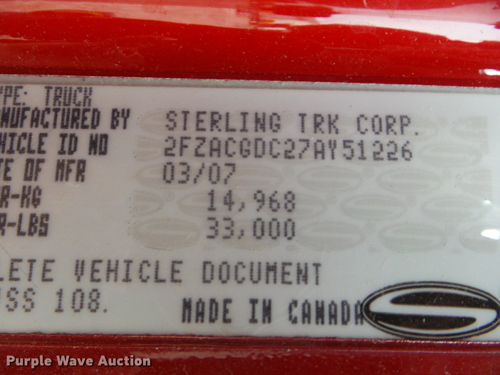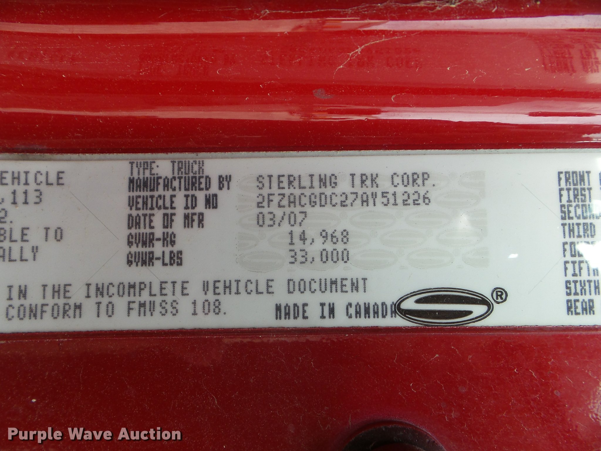 Purple Wave is selling a used Construction Dump Truck in Kansas. This item is a 2007 Sterling Acterra dump truck with the following: 193,305 miles on odometer, Caterpillar C7 Acert 7.2L L6 turbo diesel engine, 300 HP, Eaton Fuller 10 speed manual transmission, Single axle, Inter-axle differential lock, AC and heat, Tilt, Cruise, AM/FM/CD, Heated mirrors, Air suspension seat, PTO, Godwin 300U steel dump bed, 10'L x 8'W, 32" side height, 12" side board height, Single ram hoist, Manual operated end gate, Dual fuel tanks, Spring suspension, Air brakes, Engine brake, 295/75R22.5 tires, GVWR 33,000 lbs, FAWR 12,000 lbs, RAWR 21,000 lbs