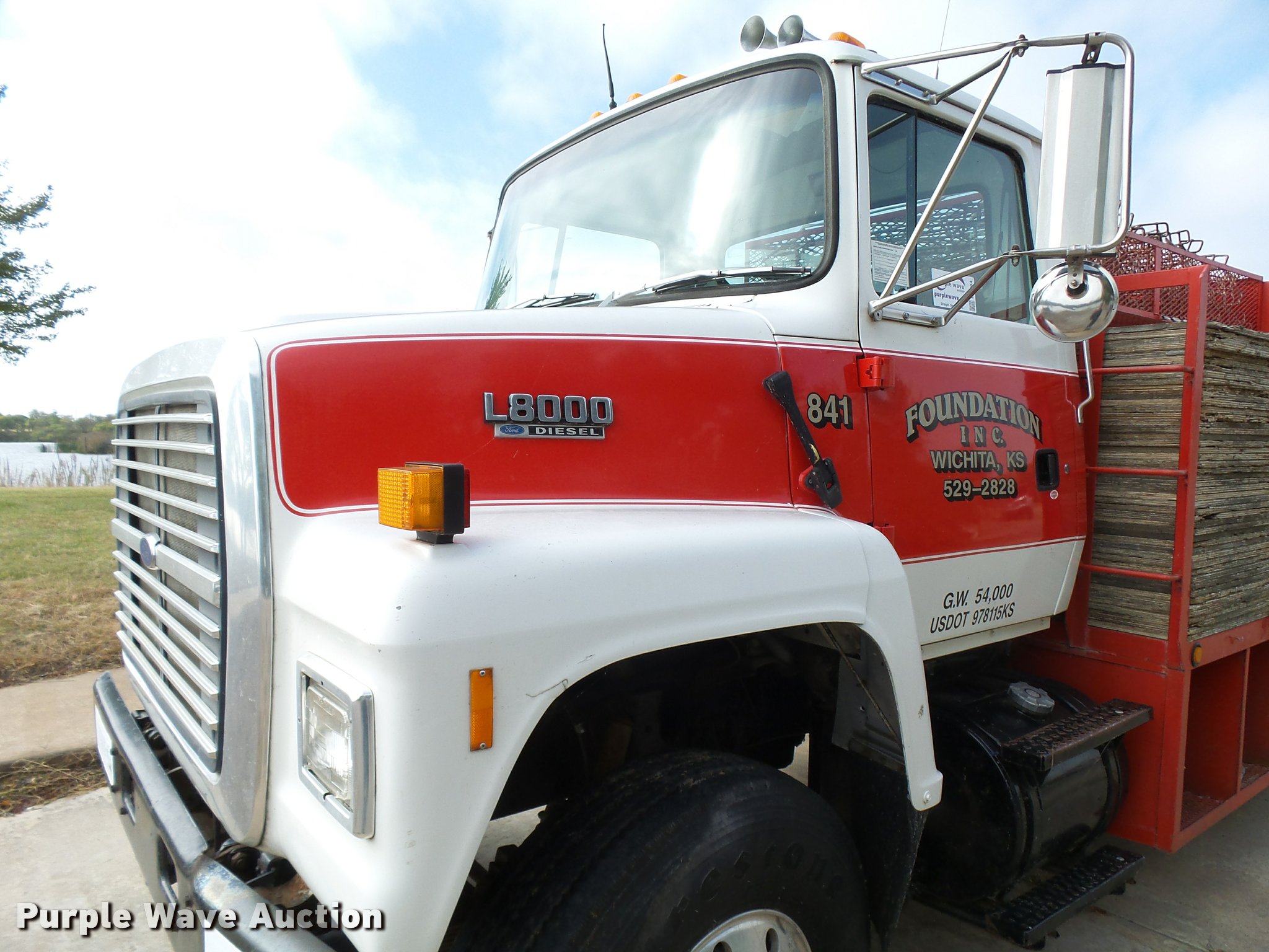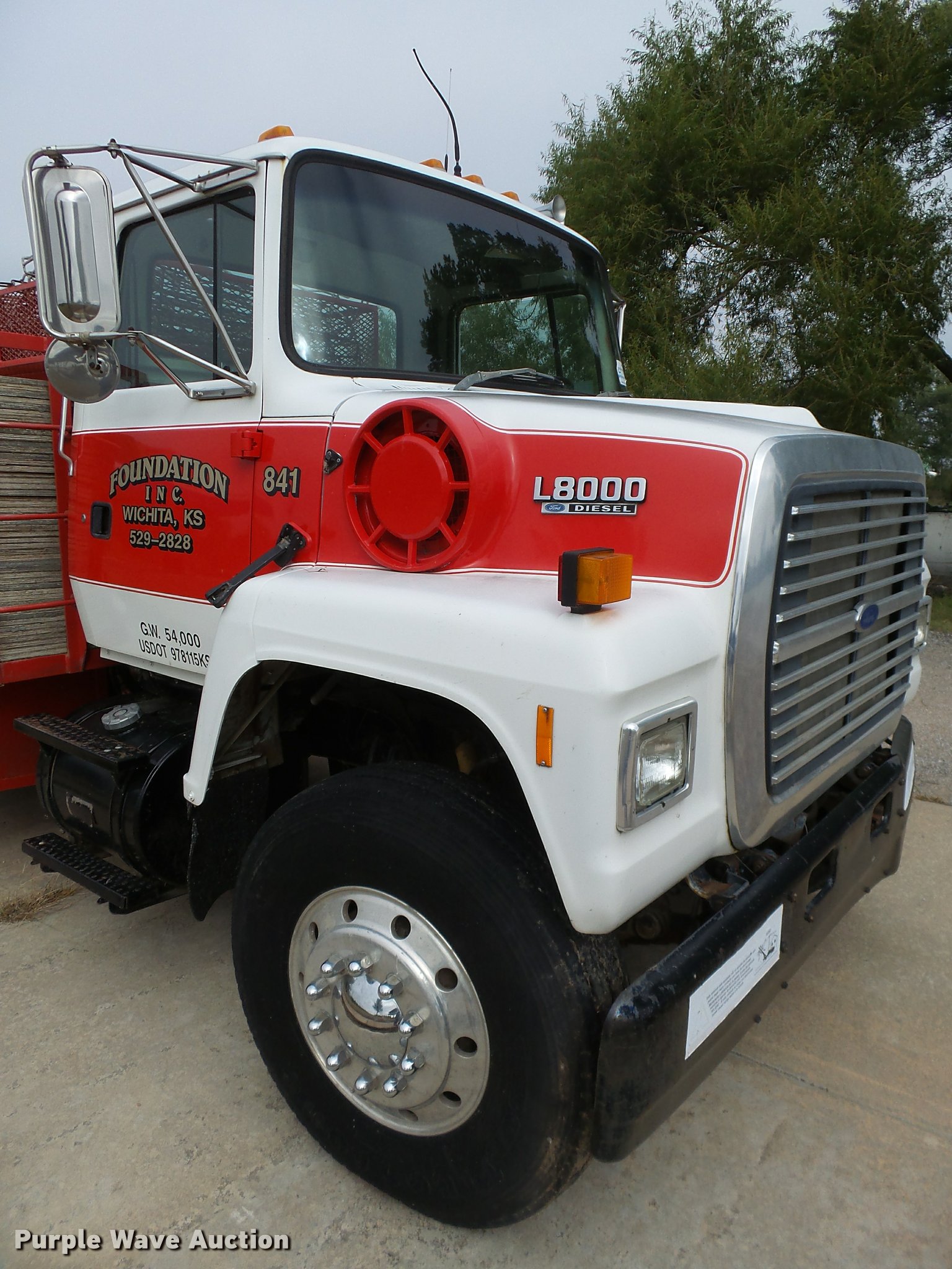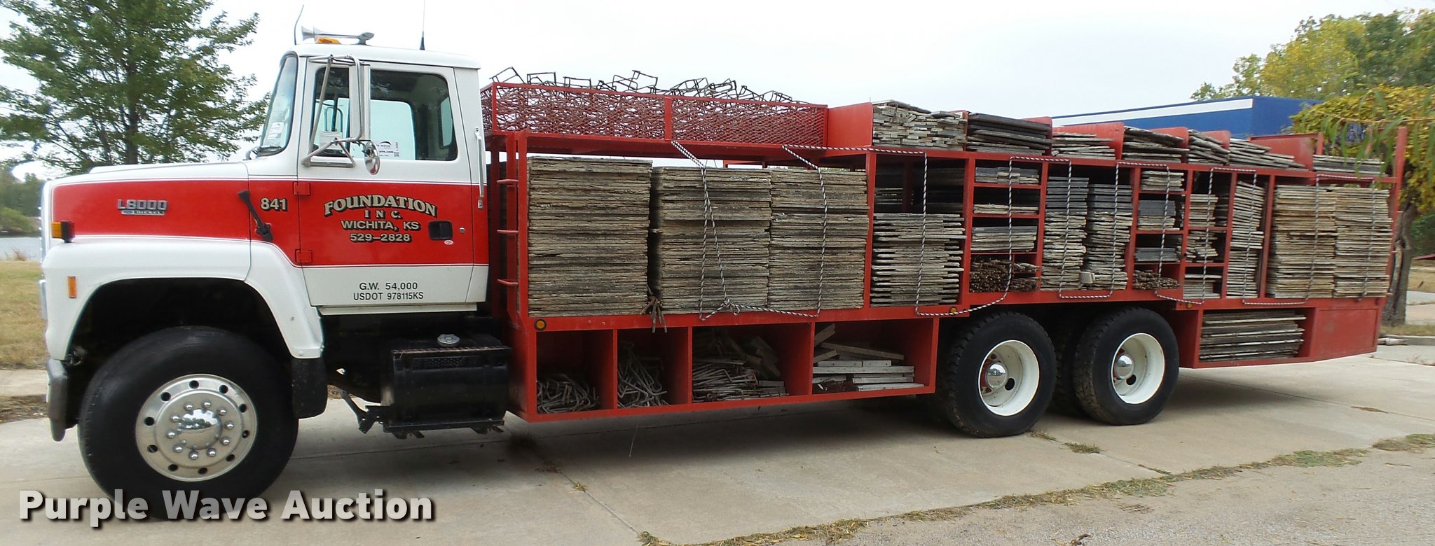 Purple Wave is selling a used Flat Bed Truck in Kansas. This item is a 1992 Ford LNT8000 flatbed truck with concrete forms with the following: 352,222 miles on odometer, 7.8L L6 diesel engine, 240 HP, Serial 793188, Automatic transmission, Tandem axle, Inter-axle differential lock, Heat, AM/FM/cassette, Talladega air suspension seat, Chelsea PTO, 27'L x 8'W form bed, Dual fuel tanks, 246" wheelbase, Spring suspension, Air brakes, 12R22.5 front tires, 275/80R22.5 rear tires, 295/75R22.5 rear tires, GVWR 52,000 lbs, Assorted concrete forms and accessories included, View inventory for details