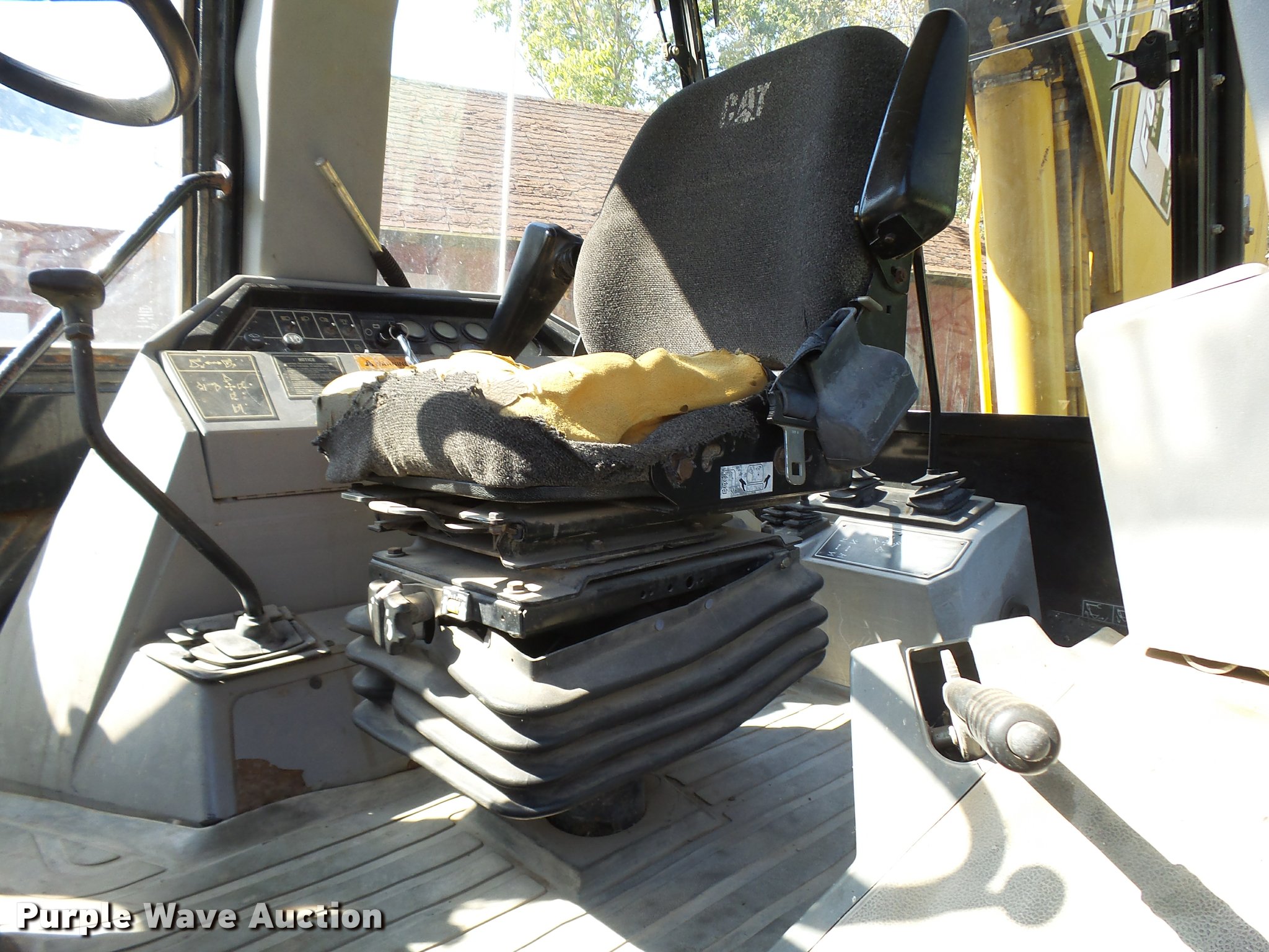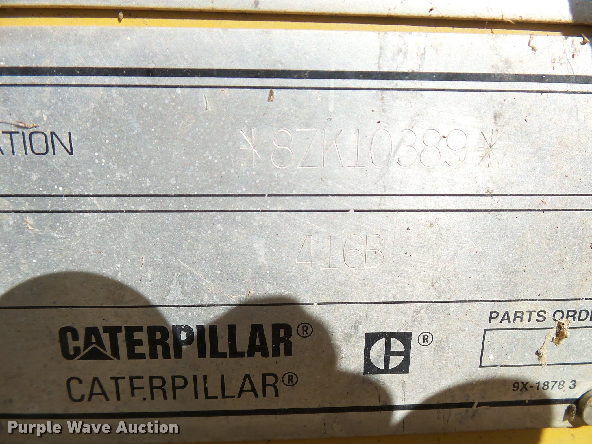 Purple Wave is selling a used Tractor Loader Backhoe in Kansas. This item is a 1996 Caterpillar 416B Turbo backhoe with the following: 4,624 hours on meter, Caterpillar 30540IT four cylinder turbo diesel engine, Serial 5HK44184, Shuttle shift transmission, 4F-4R gears, Four wheel drive, EROPS, AC and heat, Suspension seat, Wobble stick backhoe controls, Wipers, Front and rear work lights, 84"W loader bucket, Bolt-on cutting edge, E-stick, 12"W backhoe bucket, (3) teeth, Manual quick coupler, High flow auxiliary hydraulics, 12.5/80-18 front tires, 9.5L-24 rear tires, Windshield cracked, Serial 8ZK10389