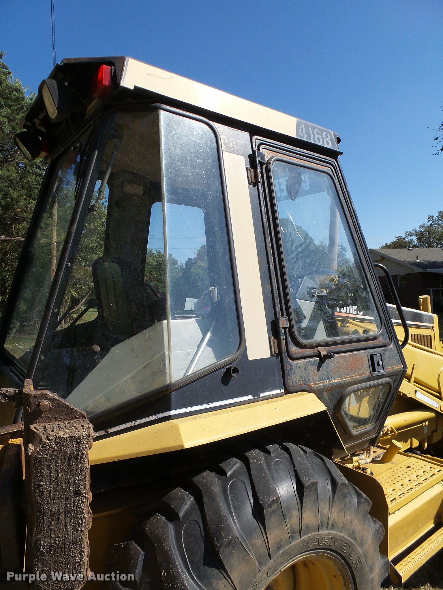 1996 Caterpillar 416B Turbo backhoe. 4,624 hours on meter, Caterpillar 30540IT four cylinder turbo diesel engine Serial 5HK44184, Shuttle shift transmission 4F-4R gears, Four wheel drive, EROPS, AC and heat, Suspension seat, Wobble stick backhoe controls, Wipers, Front and rear work lights, 84"W loader bucket Bolt-on cutting edge, E-stick, 12"W backhoe bucket (3) teeth, Manual quick coupler, High flow auxiliary hydraulics, 12.5/80-18 front tires, 9.5L-24 rear tires, Windshield cracked, Serial 8ZK10389. Wichita, KS 67205