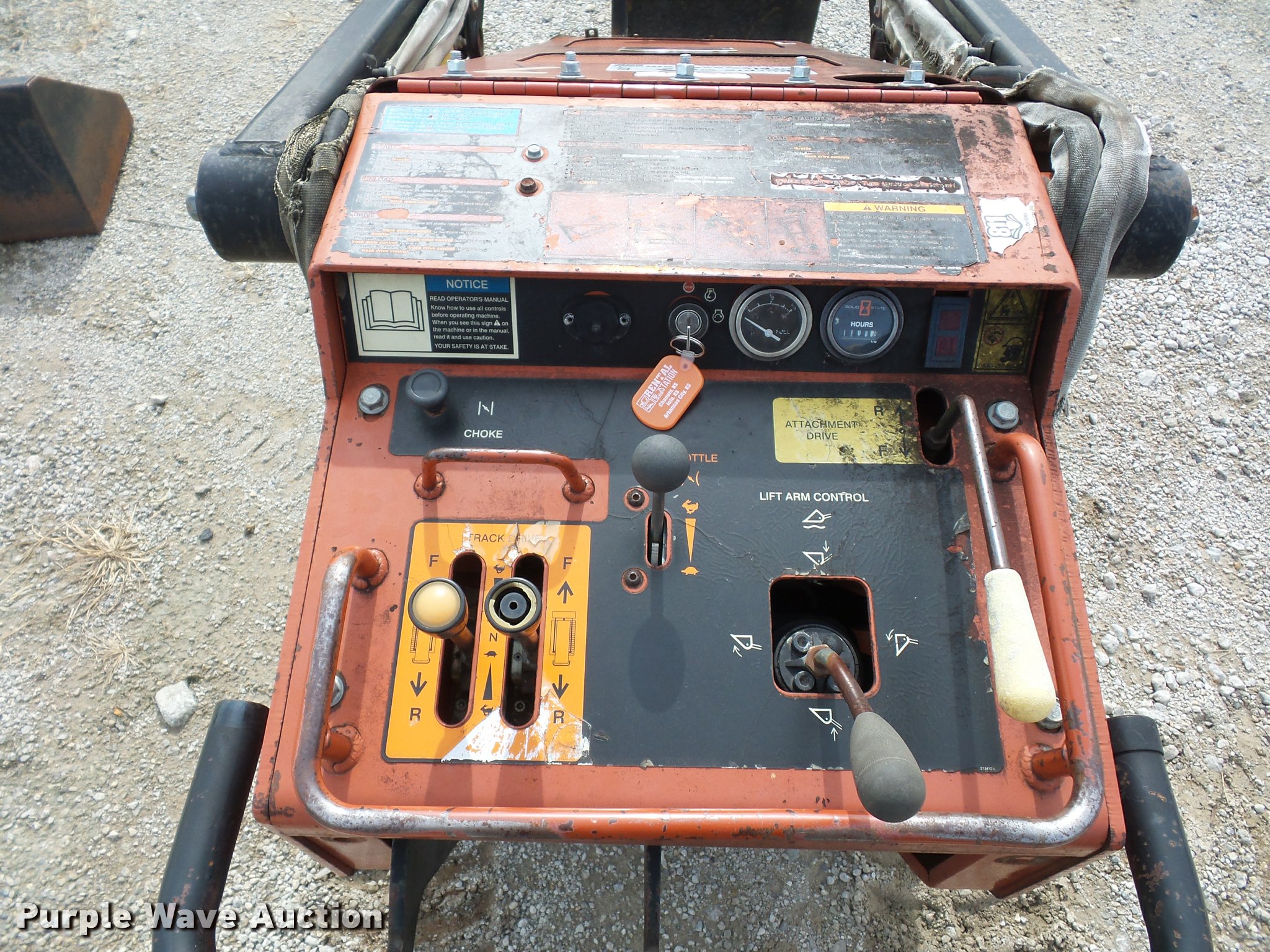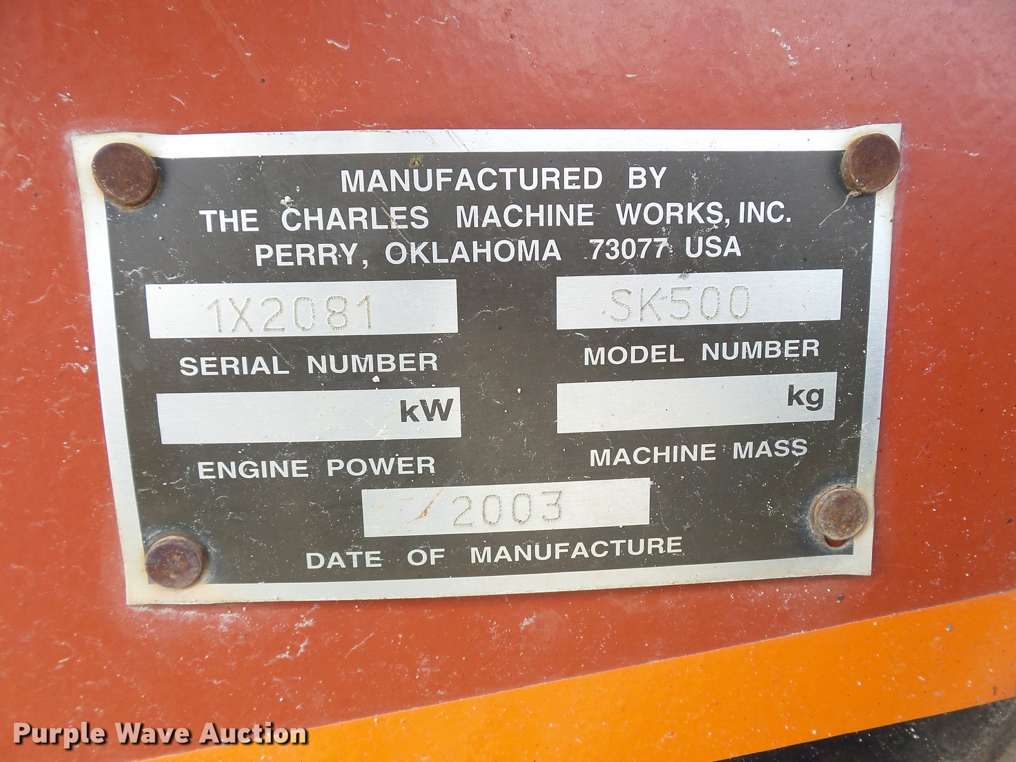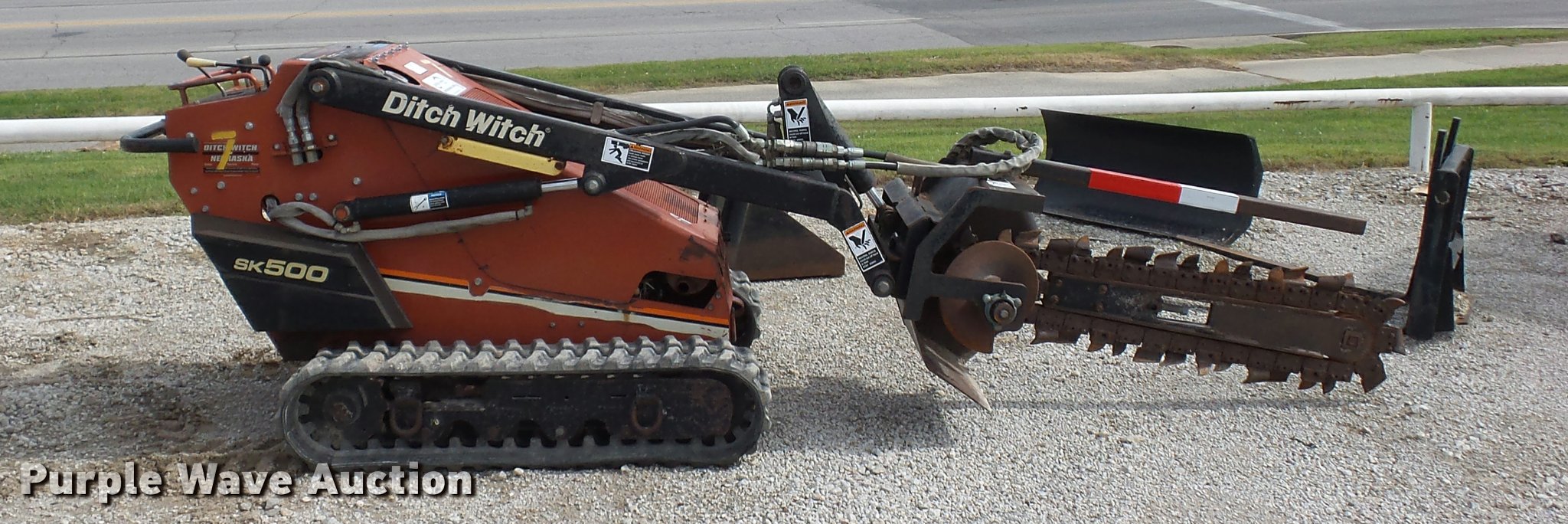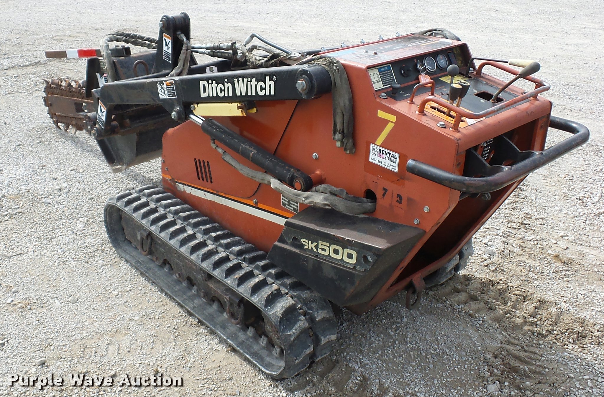 Purple Wave is selling a used Compact Utility Loader in Kansas. This item is a 2003 Ditch Witch SK500 compact tool carrier with the following: 1,108 hours on meter, Twin cylinder gas engine, Hydrostatic transmission, 4'L trenching bar, 4"W chain, 45"W bucket, Smooth cutting edge, 4'W snow plow attachment, 36"L x 3"W pallet forks, 9"W rubber tracks, Serial 1X2081