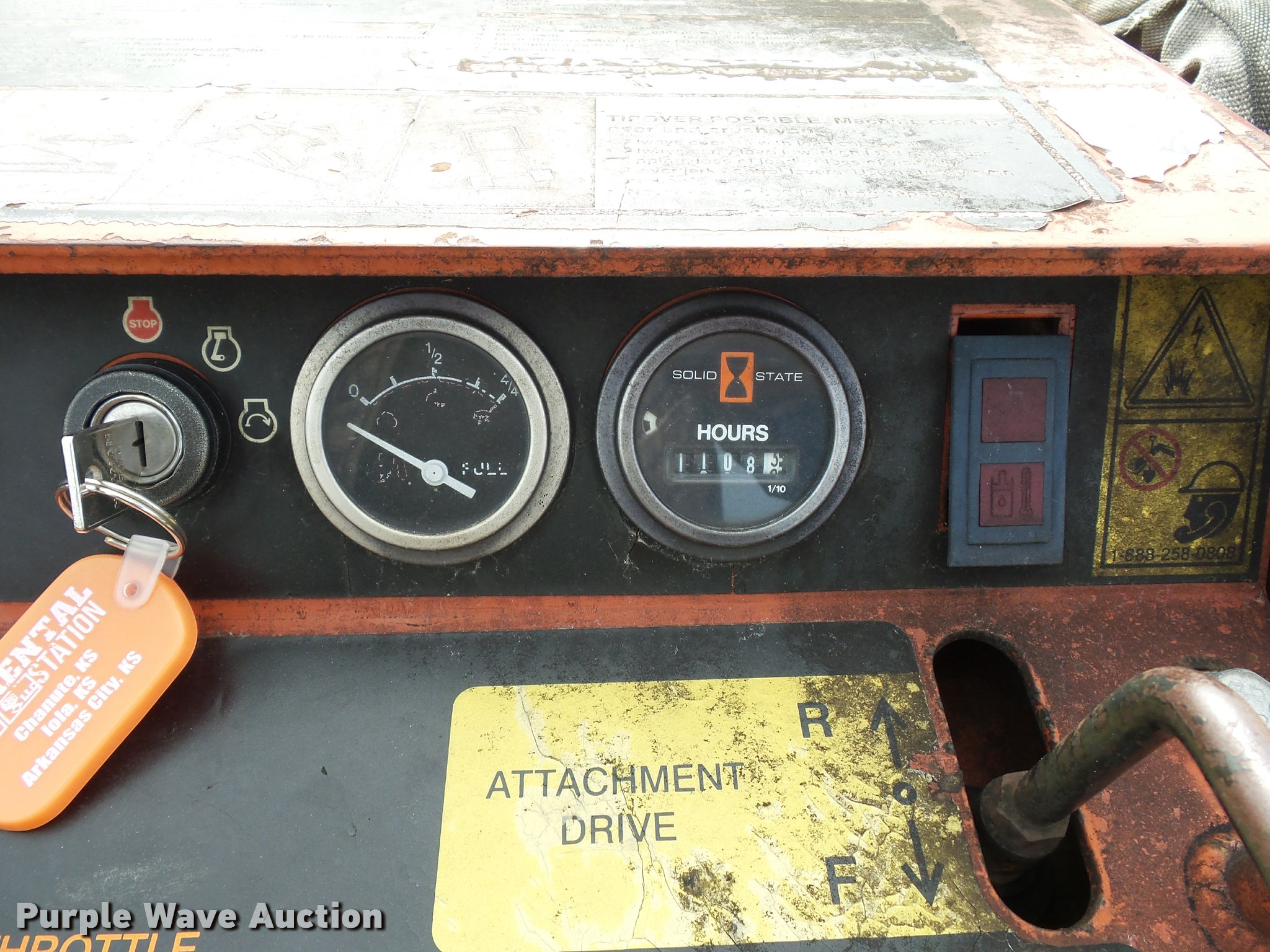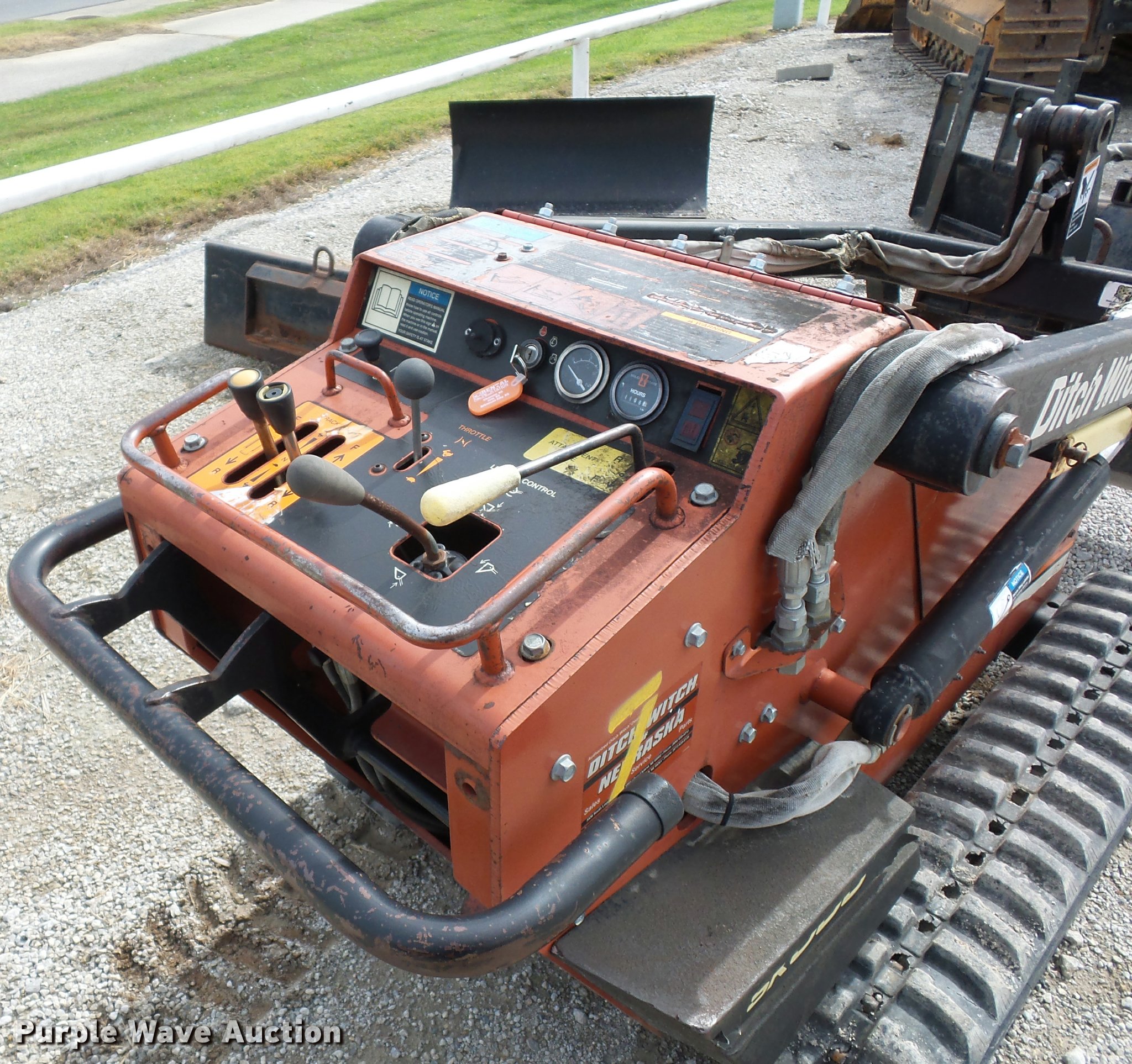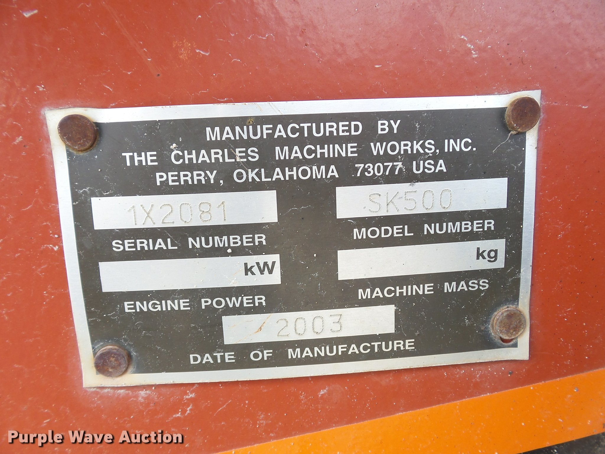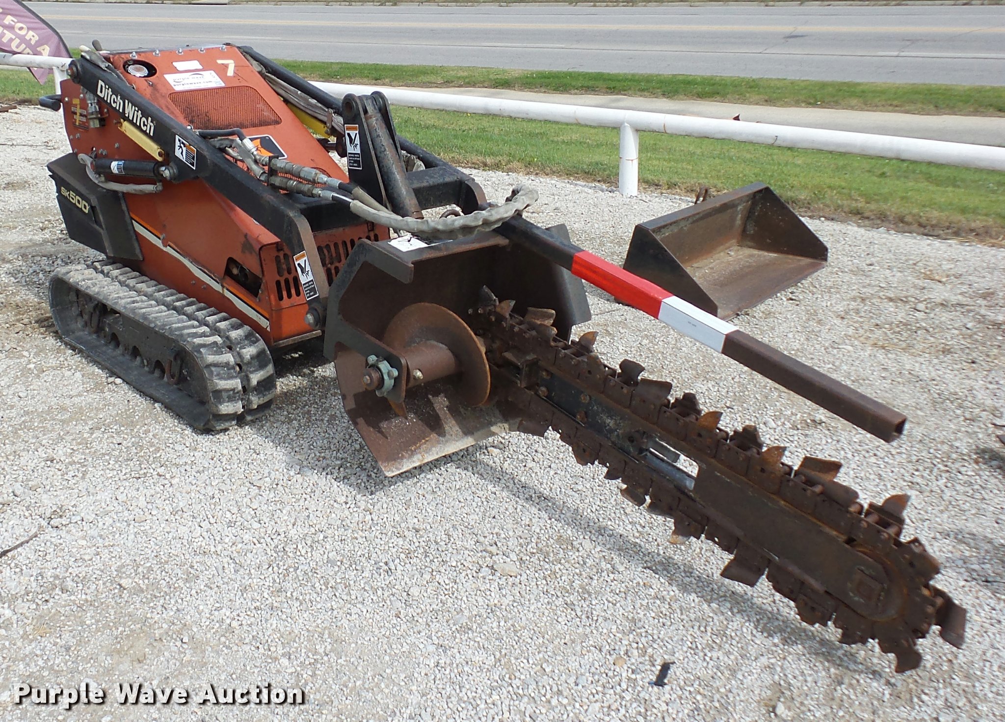 Purple Wave is selling a used Compact Utility Loader in Kansas. This item is a 2003 Ditch Witch SK500 compact tool carrier with the following: 1,108 hours on meter, Twin cylinder gas engine, Hydrostatic transmission, 4'L trenching bar, 4"W chain, 45"W bucket, Smooth cutting edge, 4'W snow plow attachment, 36"L x 3"W pallet forks, 9"W rubber tracks, Serial 1X2081