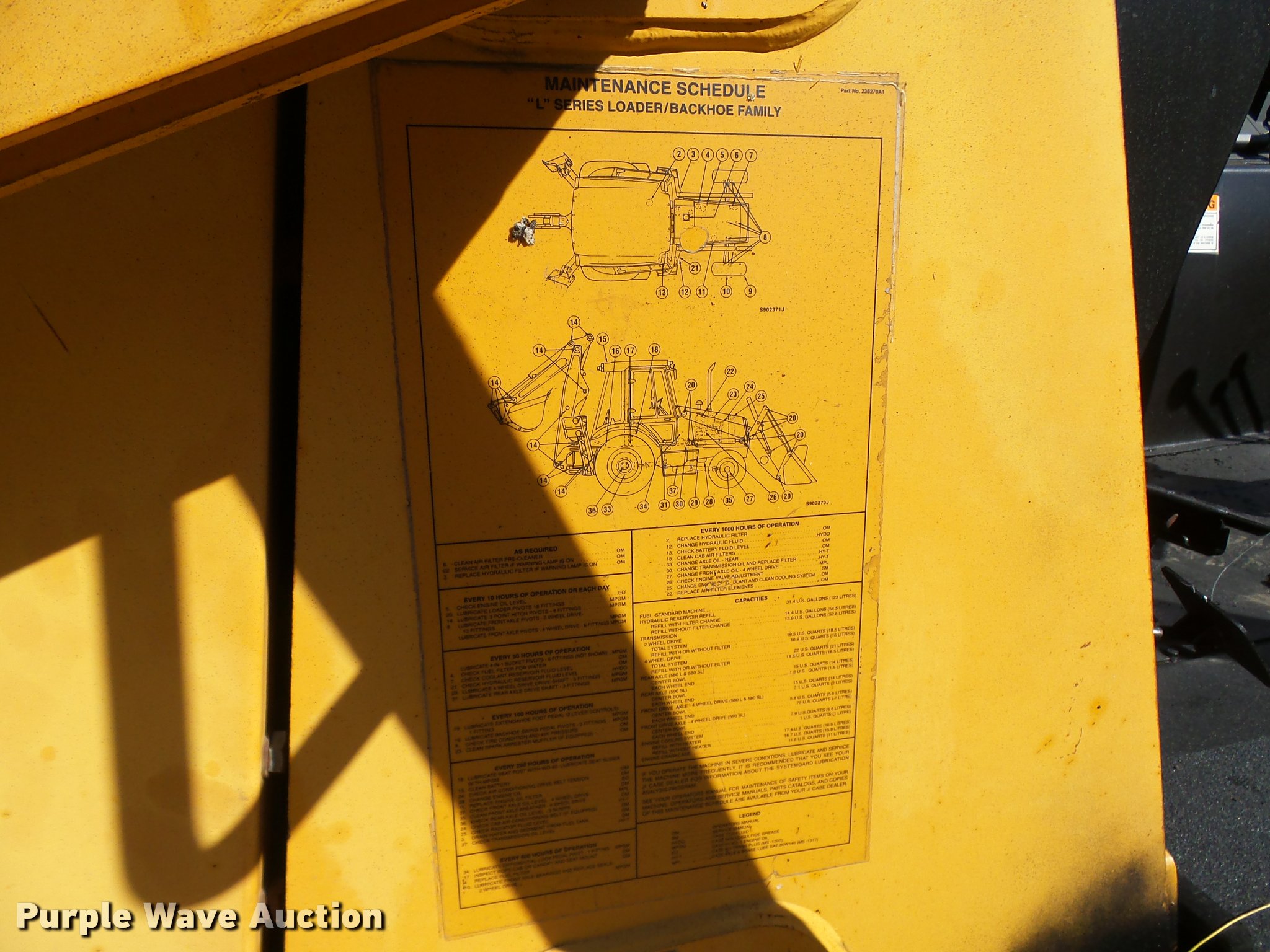 Purple Wave is selling a used Tractor Loader Backhoe in Missouri. This item is a 1995 Case 580L backhoe with the following: 2,612 hours on meter, Case/Cummins 4-390 four cylinder diesel engine, Serial 45203778, Shuttle shift transmission, 4F-4R gears, Four wheel drive, OROPS, Serial 11G0137519, Wobble stick backhoe controls, Front and rear work lights, Case 82"W loader bucket, Bolt-on cutting edge, Bucket leveler, Loader bucket forks, Case 24"W backhoe bucket, Weld-on cutting edge, Teeth, 12-16.5 front tires, 19.5L-24 rear tires, Manual, Serial JJG0220574
