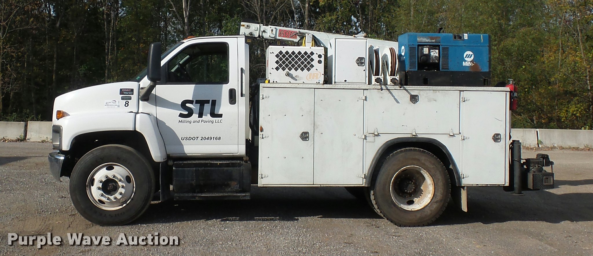 Purple Wave is selling a used Service Truck in Missouri. This item is a 2005 GMC C7500 service truck with crane with the following: 221,612 miles on odometer, 1,024 hours on meter, 7.8L L6 turbo diesel engine, Six speed manual transmission, Single axle, AC and heat, AM/FM, Service bed, Miller Bobcat 225T welder/generator, Gas engine, 8,000 watt, 240V outlet, (4) 120V outlets, Ingersoll Rand air compressor, PTO driven, 168 hours on meter, Hose reel, Fuel tank, Nozzles, Pump, IMT 6016 crane, (2) outriggers,, 11R22.5 tires, Contents not included, Vice and hitch not included