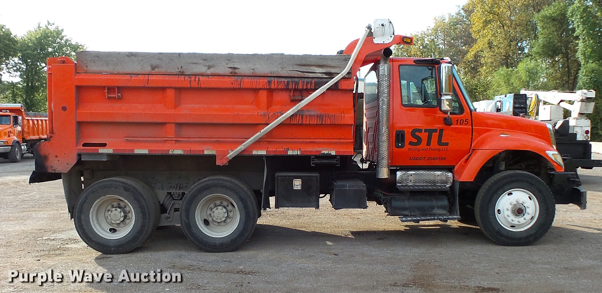 2003 International 7400 dump truck. 184,808 miles on odometer, International DT530 8.7L L6 turbo diesel engine, Allison automatic transmission, Tandem axle, AC and heat, AM/FM, Air suspension seat, PTO, 14'L steel dump bed Single ram hoist, Air end gate, Plow mount No plow, Controls, Pintle hitch, Rubber pad over walking-beam suspension, 315/80R22.5 front tires, 11R22.5 rear tires, Unit# 105. Missouri title. Title distribution may be delayed up to 14 days from verification of funds. 1HTWHADT13J078012. Special Construction Services - Open inspection Friday, November 4. 2133 Creve Coeur Mill Rd. Maryland Heights, MO 63043