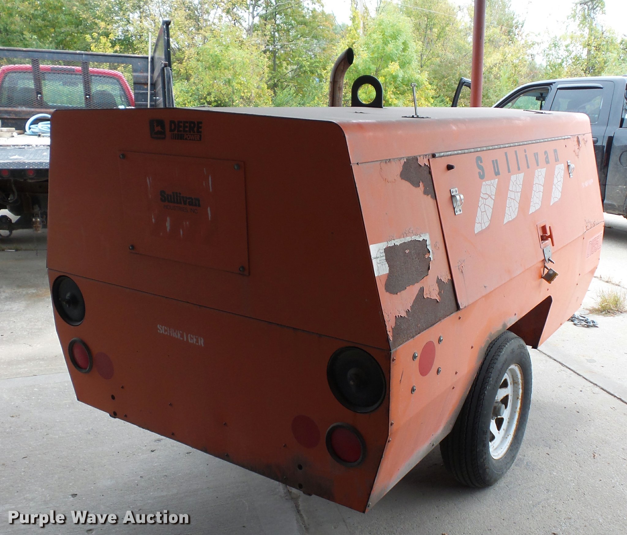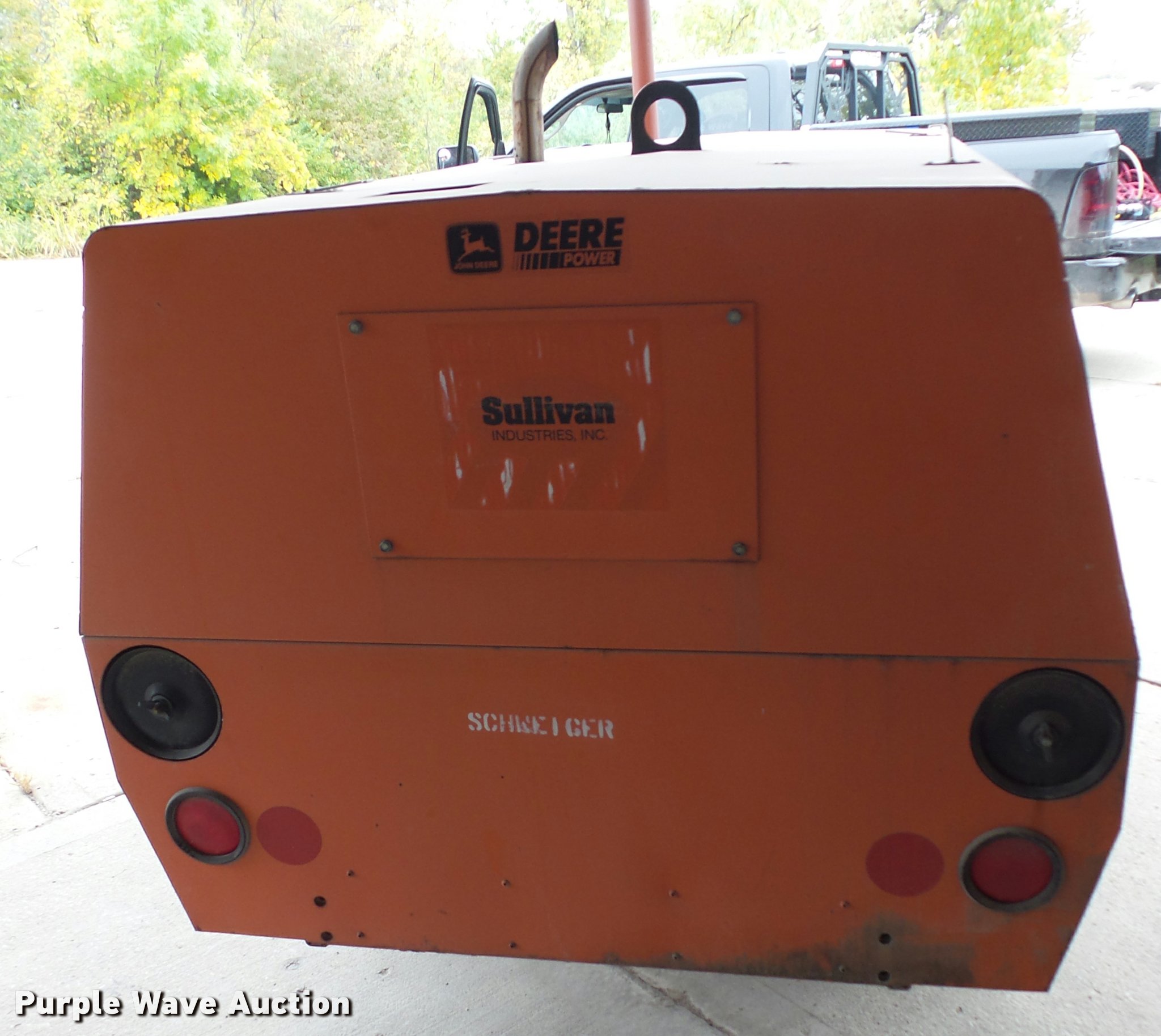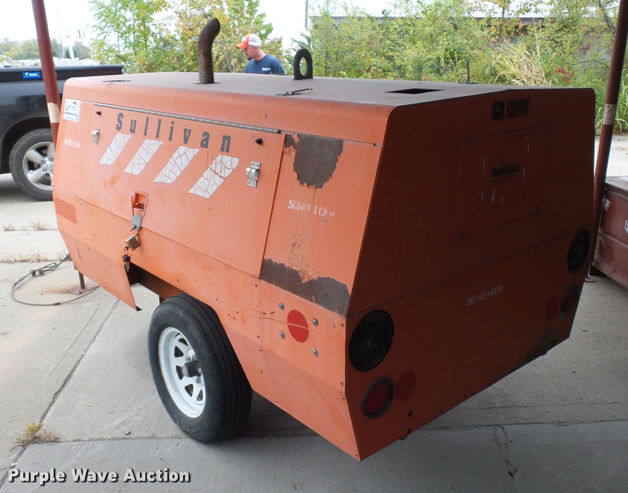 Purple Wave is selling a used Air Compressor in Missouri. This item is a Sullivan D185Q air compressor with the following: 782 hours on meter, John Deere 4045DF150 four cylinder diesel engine, Serial PE4045D025329, Pintle hitch, Manual jack, 205/75R14 tires