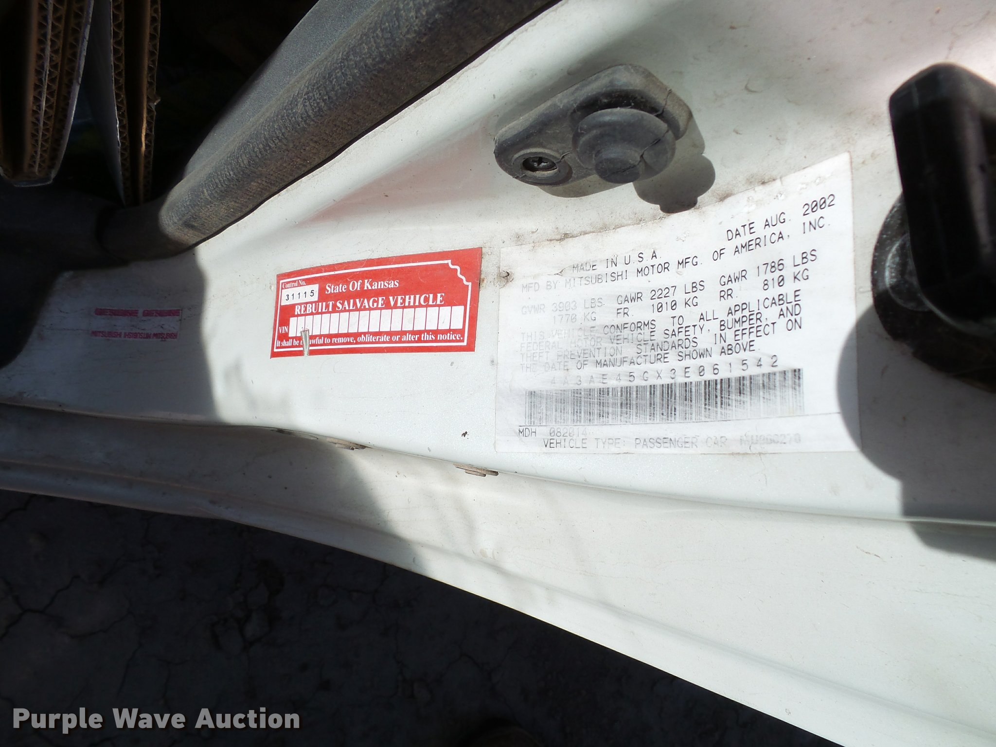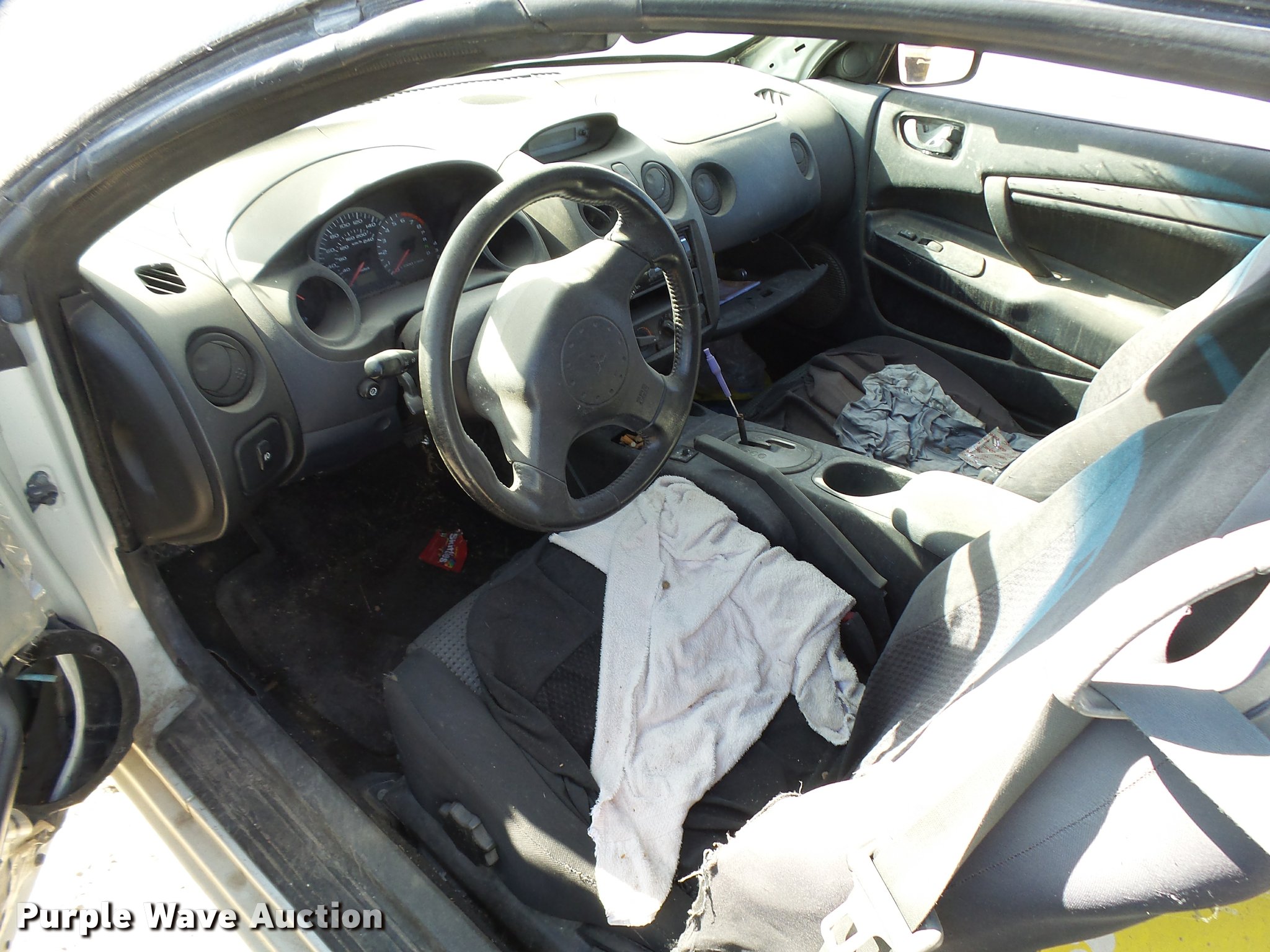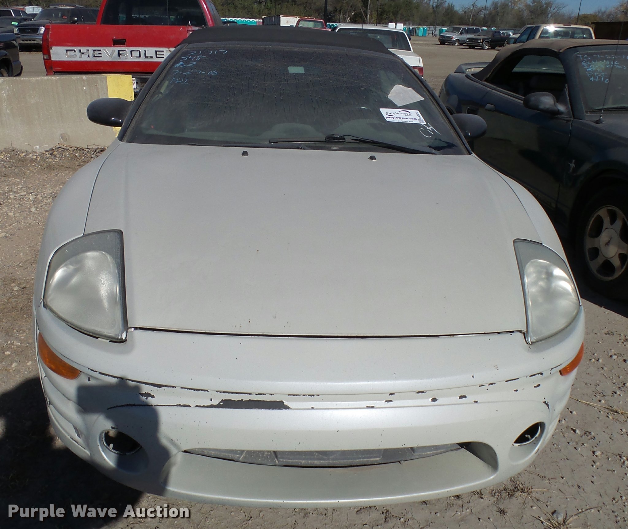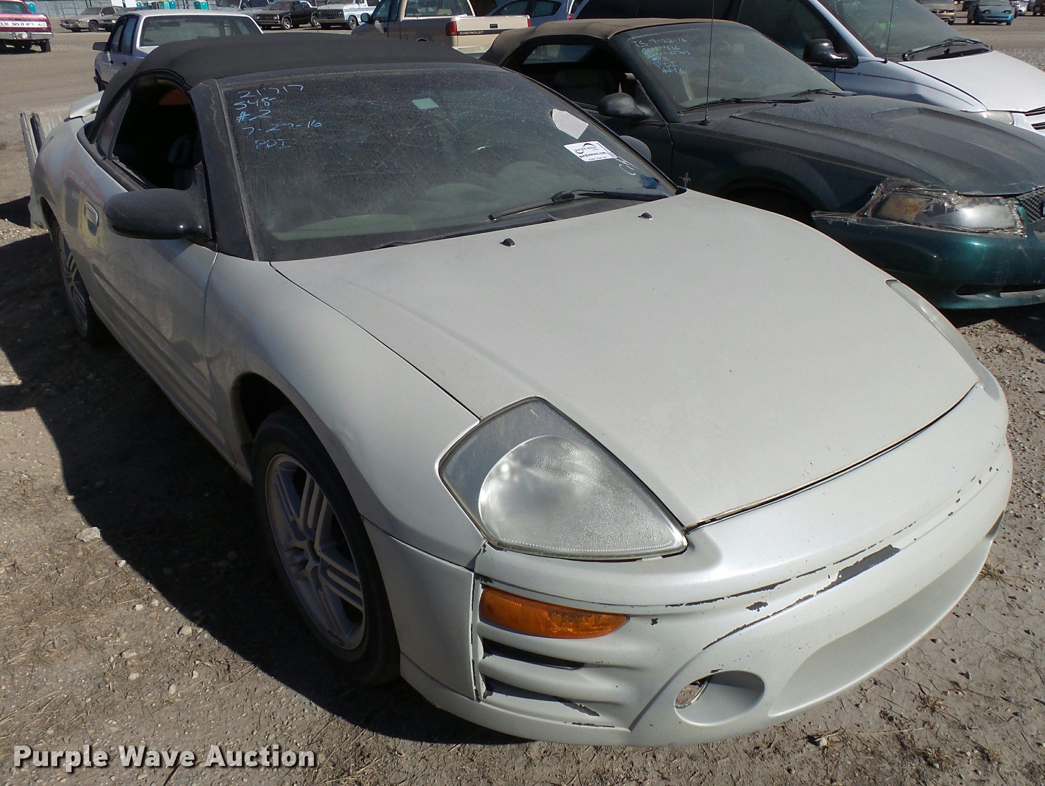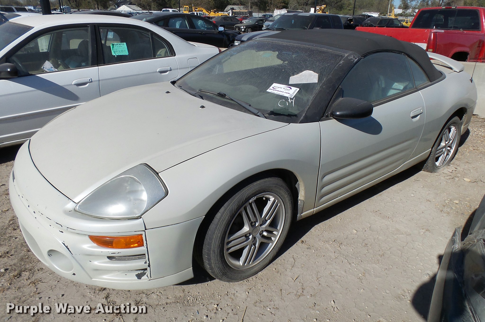 Purple Wave is selling a used Passenger Vehicle in Kansas. This item is a 2003 Mitsubishi Eclipse convertible with the following: Unknown miles on odometer, 2.4L L4 SOHC 16V gas engine, Manual transmission, AC and heat, AM/FM/CD, Power windows, locks, and mirrors, Cloth interior, 215/55R17 tires, Paint peeling, Case# 16C052109