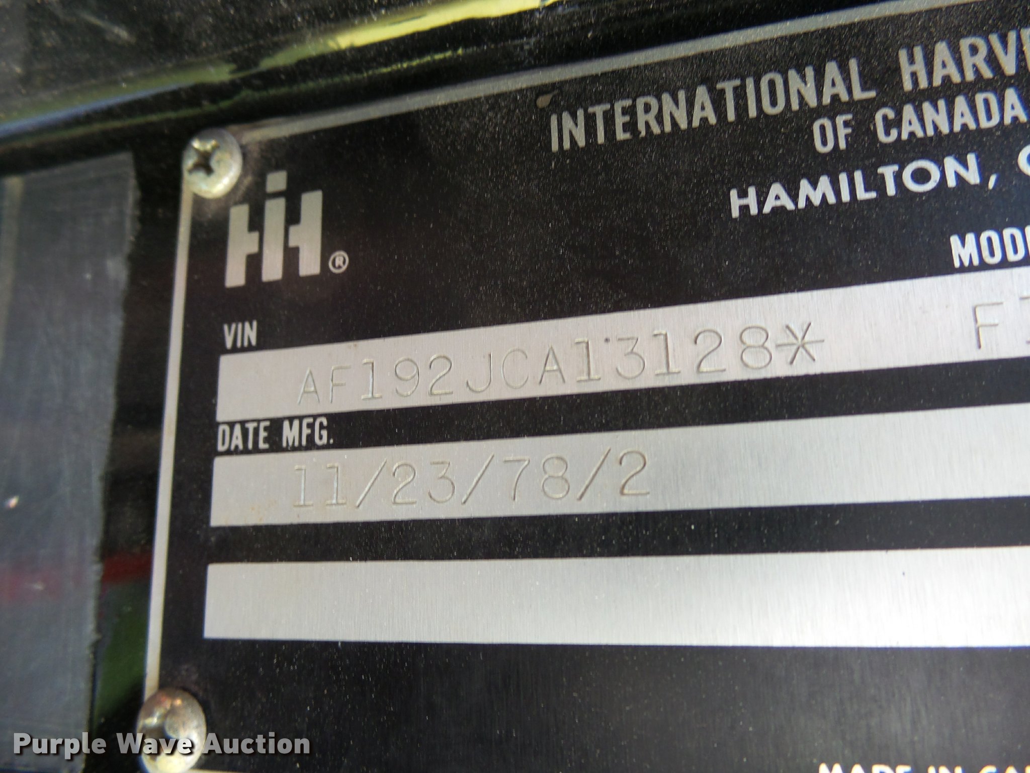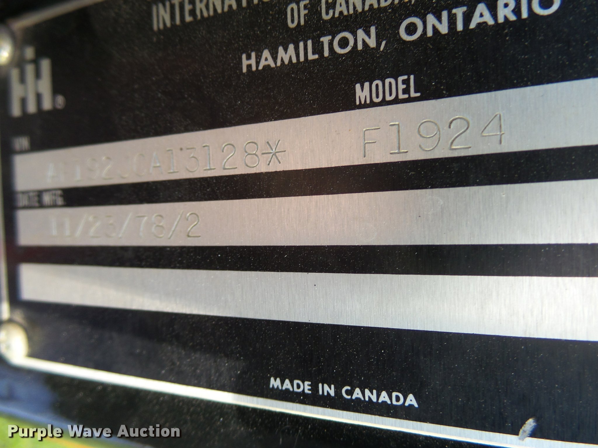 1978 International F1924 grain truck. 68,545 miles on odometer, Gas engine, Five speed manual transmission, Heat, AM/FM, 19'L x 93"W steel grain bed 5'H sides, Dual ram hoist, Manual end gate, Spring suspension, 10.00R20 tires. Minnesota title. AF192JCA13128. Westbrook, MN 56183