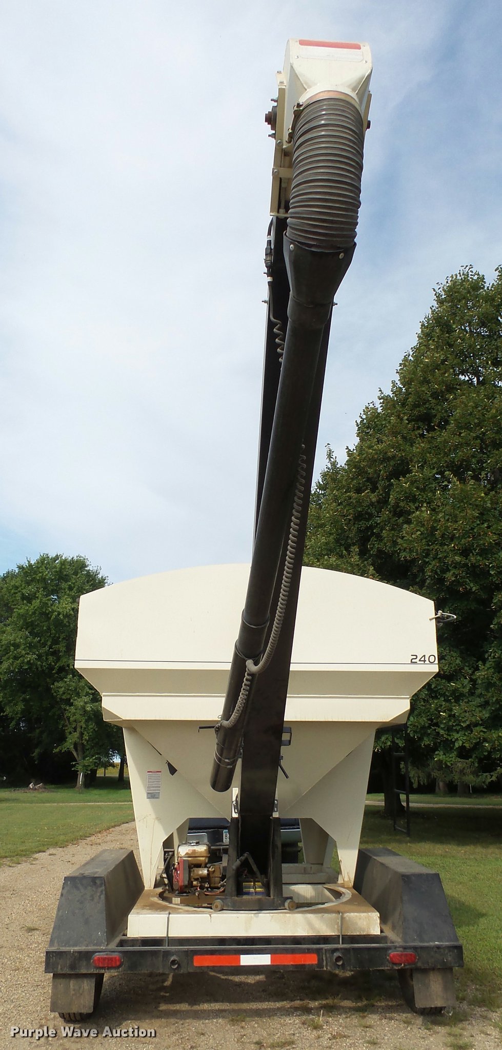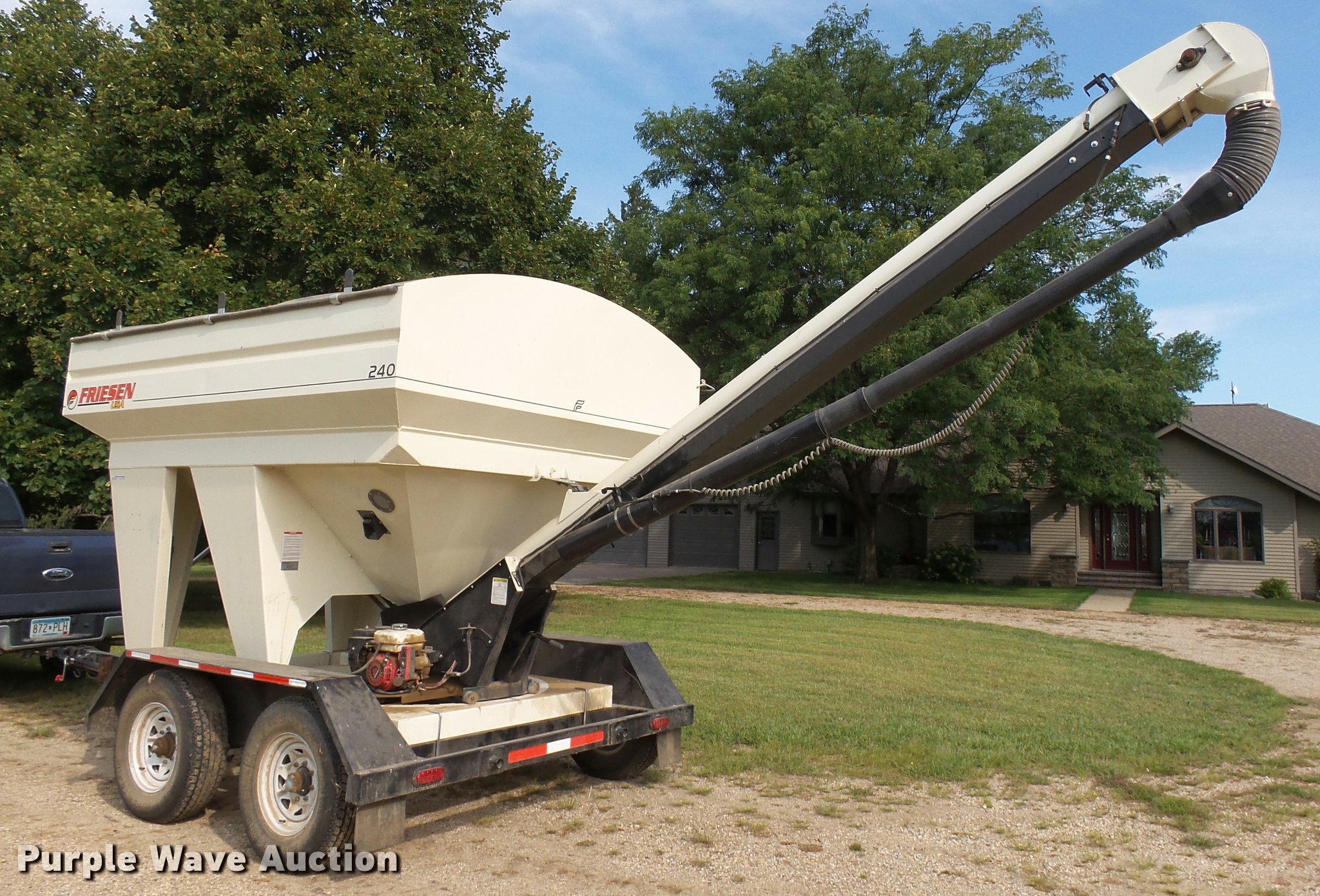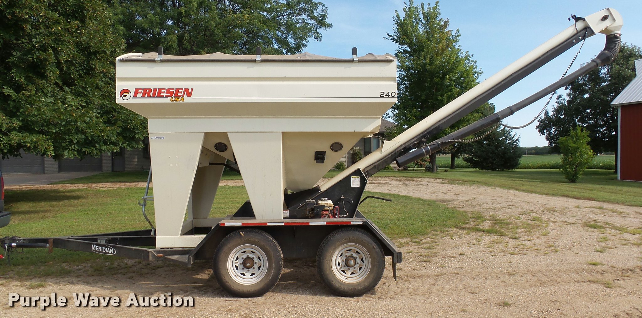 Meridian-Frieson 240 seed tender. Two compartments, 192 bushel capacity, 19'L x 6"W conveyor belt, Three tier telescopic spout with control switch, Tarp, Honda GX160 gas engine, Break-away system on trailer, ST235/80R16 tires, Serial 37006. Transfer of ownership documentation will be a bill of sale. Westbrook, MN 56183